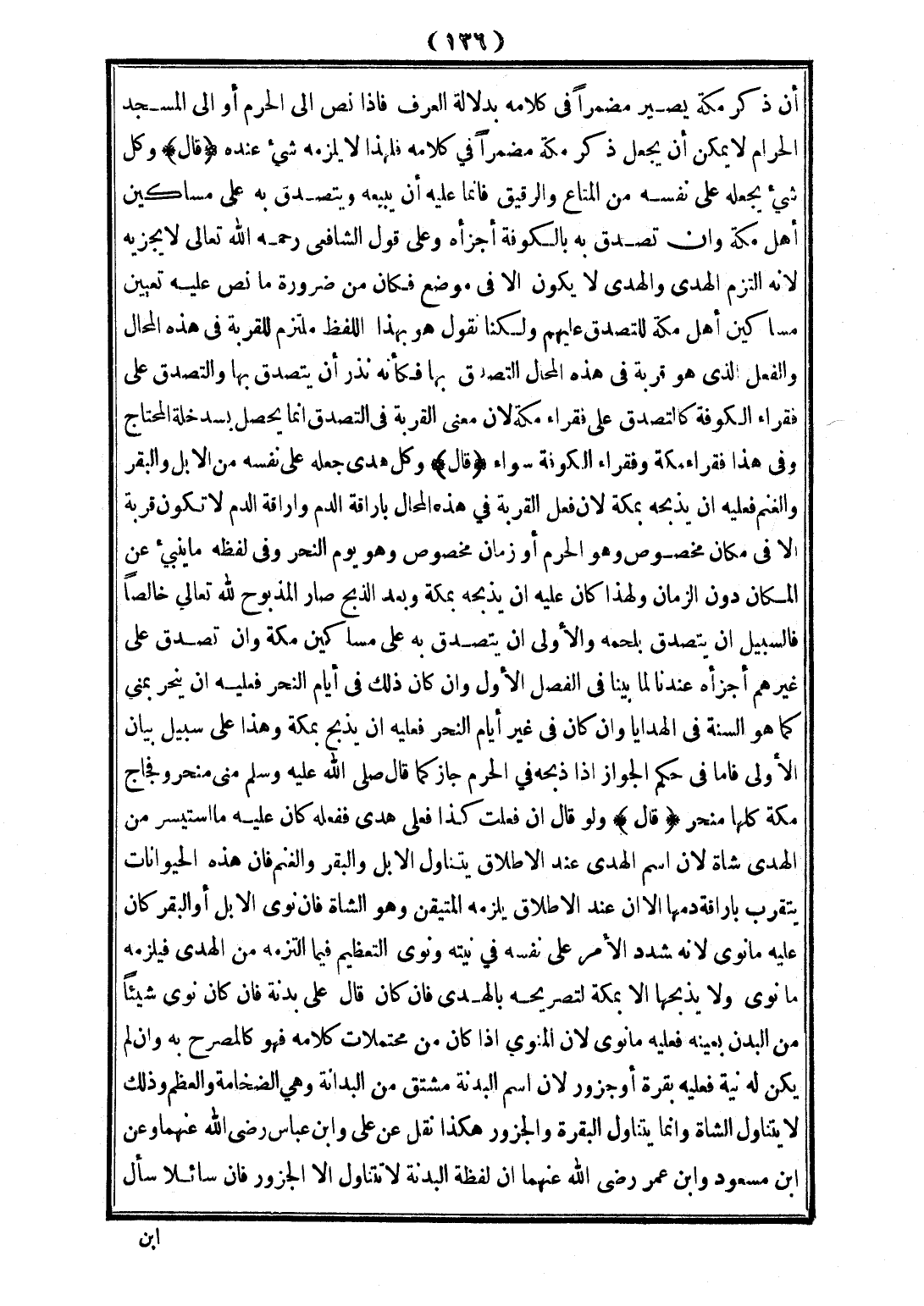(قَالَ): وَكُلُّ هَدْيٍ جَعَلَهُ عَلَى نَفْسِهِ مِنْ الْإِبِلِ وَالْبَقَرِ وَالْغَنَمِ فَعَلَيْهِ أَنْ يَذْبَحَهُ بِمَكَّةَ؛ لِأَنَّ فِعْلَ الْقُرْبَةِ فِي هَذِهِ الْمَحَالِّ بِإِرَاقَةِ الدَّمِ، وَإِرَاقَةُ الدَّمِ لَا تَكُونُ قُرْبَةً إلَّا فِي مَكَان مَخْصُوصٍ وَهُوَ الْحَرَمُ أَوْ زَمَانٍ مَخْصُوصٍ وَهُوَ يَوْمُ النَّحْرِ، وَفِي لَفْظِهِ مَا يُنْبِئ عَنْ الْمَكَانِ دُونَ الزَّمَانِ، وَلَهَذَا كَانَ عَلَيْهِ أَنْ يَذْبَحَهُ وَبَعْدَ الذَّبْحِ صَارَ الْمَذْبُوحُ لِلَّهِ تَعَالَى خَالِصًا فَالسَّبِيلُ أَنْ يَتَصَدَّقَ بِلَحْمِهِ، وَالْأَوْلَى أَنْ يَتَصَدَّقَ بِهِ عَلَى مَسَاكِينِ مَكَّةَ، وَإِنْ تَصَدَّقَ عَلَى غَيْرِهِمْ أَجْزَأَهُ عِنْدَنَا لِمَا بَيَّنَّا فِي الْفَصْلِ الْأَوَّلِ إنْ كَانَ ذَلِكَ فِي أَيَّامِ النَّحْرِ فَعَلَيْهِ أَنْ يَنْحَرَ بِمِنًى كَمَا هُوَ السُّنَّةُ فِي الْهَدَايَا، وَإِنْ كَانَ فِي غَيْرِ أَيَّامِ النَّحْرِ فَعَلَيْهِ أَنْ يَذْبَحَ بِمَكَّةَ، وَهَذَا عَلَى سَبِيلِ بَيَانِ الْأَوْلَى، فَأَمَّا حُكْمُ الْجَوَازِ إذَا ذَبَحَهُ فِي الْحَرَمِ جَازَ كَمَا قَالَ - صَلَّى اللَّهُ عَلَيْهِ وَسَلَّمَ - «مِنًى مَنْحَرٌ وَفِجَاجُ مَكَّةَ كُلُّهَا مَنْحَرٌ»
