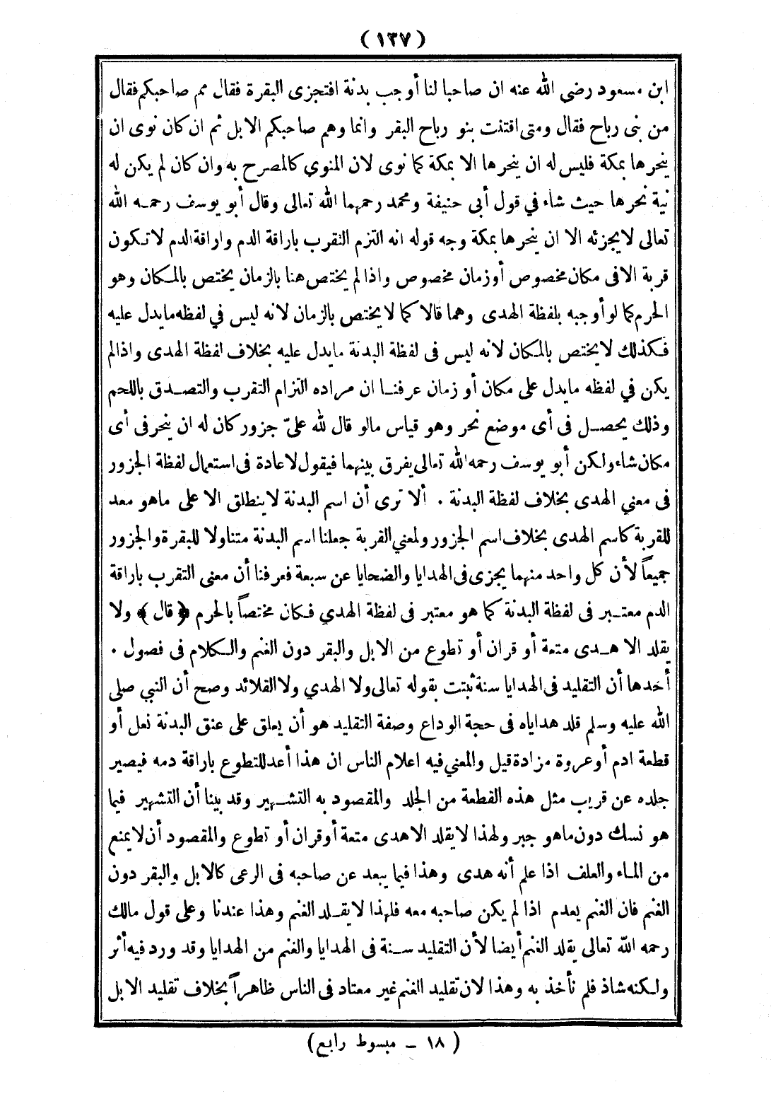 ابْنَ مَسْعُودٍ - رَضِيَ اللَّهُ عَنْهُ - أَنَّ صَاحِبًا لَنَا أَوْجَبَ بَدَنَةً أَفَتُجْزِي الْبَقَرَةُ، فَقَالَ: مِمَّ صَاحِبُكُمْ، فَقَالَ: مِنْ بَنِي رَبَاحٍ، فَقَالَ: وَمَتَى اقْتَنَتْ بَنُو رَبَاحٍ الْبَقَرَ، وَإِنَّمَا وَهَمَ صَاحِبُكُمْ الْإِبِلَ ثُمَّ إنْ كَانَ نَوَى أَنْ يَنْحَرَهَا بِمَكَّةَ فَلَيْسَ لَهُ أَنْ يَنْحَرَهَا إلَّا بِمَكَّةَ كَمَا نَوَى لِأَنَّ الْمَنْوِيَّ كَالْمُصَرَّحِ بِهِ، وَإِنْ كَانَ لَمْ يَكُنْ لَهُ نِيَّةٌ نَحَرَهَا حَيْثُ شَاءَ فِي قَوْلِ أَبِي حَنِيفَةَ وَمُحَمَّدٍ - رَحِمَهُمَا اللَّهُ تَعَالَى - وَقَالَ أَبُو يُوسُفَ - رَحِمَهُ اللَّهُ تَعَالَى -: لَا يُجْزِئُهُ إلَّا أَنْ يَنْحَرَهَا بِمَكَّةَ وَجْهُ قَوْلِهِ أَنَّهُ الْتَزَمَ التَّقَرُّبَ بِإِرَاقَةِ الدَّمِ، وَإِرَاقَةُ الدَّمِ لَا تَكُونُ قُرْبَةً إلَّا فِي مَكَان مَخْصُوصٍ أَوْ زَمَانٍ مَخْصُوصٍ، وَإِذَا لَمْ يَخْتَصَّ هُنَا بِالزَّمَانِ يَخْتَصُّ بِالْمَكَانِ وَهُوَ الْحَرَمُ كَمَا لَوْ أَوْجَبَهُ بِلَفْظَةِ الْهَدْيِ وَهُمَا قَالَا: كَمَا لَا يَخْتَصُّ بِالزَّمَانِ؛ لِأَنَّهُ لَيْسَ فِي لَفْظِهِ مَا يَدُلُّ عَلَيْهِ فَكَذَلِكَ لَا يَخْتَصُّ بِالْمَكَانِ؛ لِأَنَّهُ لَيْسَ فِي لَفَظَّةِ الْبَدَنَةِ مَا يَدُلُّ عَلَيْهِ بِخِلَافِ لَفْظَةِ الْهَدْيِ، وَإِذَا لَمْ يَكُنْ فِي لَفْظِهِ مَا يَدُلُّ عَلَى مَكَان أَوْ زَمَانٍ عَرَفْنَا أَنَّ مُرَادَهُ الْتِزَامُ التَّقَرُّبِ وَالتَّصَدُّقِ بِاللَّحْمِ، وَذَلِكَ يَحْصُلُ فِي أَيِّ مَوْضِعِ نَحْرٍ، وَهُوَ قِيَاسُ مَا لَوْ قَالَ: لِلَّهِ عَلَيَّ جَزُورٌ كَانَ لَهُ أَنْ يَنْحَرَ فِي أَيِّ مَكَان شَاءَ، وَلَكِنْ أَبُو يُوسُفَ - رَحِمَهُ اللَّهُ تَعَالَى - يُفَرِّقُ بَيْنَهُمَا فَيَقُولُ: لَا عَادَةَ فِي اسْتِعْمَالِ لَفْظَةِ الْجَزُورِ فِي مَعْنَى الْهَدْيِ بِخِلَافِ لَفْظَةِ الْبَدَنَةِ، أَلَا تَرَى أَنَّ اسْمَ الْبَدَنَةِ لَا يَنْطَلِقُ إلَّا عَلَى مَا هُوَ مُعَدٌّ لِلْقُرْبَةِ كَاسْمِ الْهَدْيِ بِخِلَافِ اسْمِ الْجَزُورِ وَلِمَعْنَى الْقُرْبَةِ جَعَلْنَا اسْمَ الْبَدَنَةِ مُتَنَاوِلًا لِلْبَقَرَةِ وَالْجَزُورِ جَمِيعًا؛ لِأَنَّ كُلَّ وَاحِدٍ مِنْهُمَا يُجْزِي فِي الْهَدَايَا وَالضَّحَايَا عَنْ سَبْعَةٍ فَعَرَفْنَا أَنَّ مَعْنَى التَّقَرُّبِ بِإِرَاقَةِ الدَّمِ مُعْتَبَرٌ فِي لَفْظَةِ الْبَدَنَةِ كَمَا هُوَ مُعْتَبَرٌ فِي لَفْظَةِ الْهَدْيِ فَكَانَ مُخْتَصًّا بِالْحَرَمِ