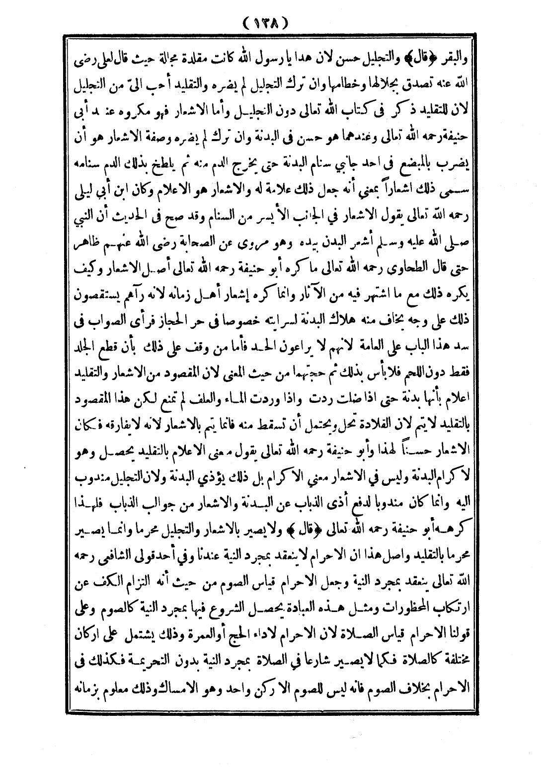 (قَالَ): وَالتَّجْلِيلُ حَسَنٌ؛ لِأَنَّ هَدَايَا رَسُولِ اللَّهِ كَانَتْ مُقَلَّدَةً مُجَلَّلَةً حَيْثُ «قَالَ لِعَلِيٍّ - رَضِيَ اللَّهُ عَنْهُ -: تَصَدَّقْ بِجِلَالِهَا وَخِطَامِهَا»، وَإِنْ تَرَكَ التَّجْلِيلَ لَمْ يَضُرَّهُ وَالتَّقْلِيدُ أَحَبُّ إلَيَّ مِنْ التَّجْلِيلِ؛ لِأَنَّ لِلتَّقْلِيدِ ذِكْرًا فِي كِتَابِ اللَّهِ تَعَالَى دُونَ التَّجْلِيلِ. وَأَمَّا الْإِشْعَارُ فَهُوَ مَكْرُوهٌ عِنْدَ أَبِي حَنِيفَةَ - رَحِمَهُ اللَّهُ تَعَالَى - وَعِنْدَهُمَا هُوَ حَسَنٌ فِي الْبَدَنَةِ، وَإِنْ تَرَكَ لَمْ يَضُرَّهُ، وَصِفَةُ الْإِشْعَارِ هُوَ أَنْ يَضْرِبَ بِالْمِبْضَعِ فِي أَحَدِ جَانِبَيْ سَنَامِ الْبَدَنَةِ حَتَّى يَخْرُجَ الدَّمُ مِنْهُ ثُمَّ يُلَطِّخَ بِذَلِكَ الدَّمَ سَنَامَهُ، سُمِّيَ ذَلِكَ إشْعَارًا بِمَعْنَى أَنَّهُ جَعَلَ ذَلِكَ عَلَامَةً لَهُ، وَالْإِشْعَارُ هُوَ الْإِعْلَامُ، وَكَانَ ابْنُ أَبِي لَيْلَى - رَحِمَهُ اللَّهُ تَعَالَى - يَقُولُ: الْإِشْعَارُ فِي الْجَانِبِ الْأَيْسَرِ مِنْ السَّنَامِ، وَقَدْ صَحَّ فِي الْحَدِيثِ «أَنَّ النَّبِيَّ - صَلَّى اللَّهُ عَلَيْهِ وَسَلَّمَ - أَشْعَرَ الْبُدْنَ بِيَدِهِ» وَهُوَ مَرْوِيٌّ عَنْ الصَّحَابَةِ - رَضِيَ اللَّهُ عَنْهُمْ - ظَاهِرٌ حَتَّى قَالَ الطَّحَاوِيُّ - رَحِمَهُ اللَّهُ تَعَالَى -: مَا كَرِهَ أَبُو حَنِيفَةَ - رَحِمَهُ اللَّهُ تَعَالَى - أَصْلَ الْإِشْعَارِ وَكَيْف يَكْرَهُ ذَلِكَ مَعَ مَا اشْتَهَرَ فِيهِ مِنْ الْآثَارِ، وَإِنَّمَا كَرِهَ إشْعَارَ أَهْلِ زَمَانِهِ؛ لِأَنَّهُ رَآهُمْ يَسْتَقْصُونَ ذَلِكَ عَلَى وَجْهٍ يَخَافُ مِنْهُ هَلَاكَ الْبَدَنَةِ لِسِرَايَتِهِ خُصُوصًا فِي حَرِّ الْحِجَازِ فَرَأَى الصَّوَابَ فِي سَدِّ هَذَا الْبَابِ عَلَى الْعَامَّةِ؛ لِأَنَّهُمْ لَا يُرَاعُونَ الْحَدَّ، فَأَمَّا مَنْ وَقَفَ عَلَى ذَلِكَ بِأَنْ قَطَعَ الْجِلْدَ فَقَطْ دُونَ اللَّحْمِ فَلَا بَأْسَ بِذَلِكَ ثُمَّ حُجَّتُهُمَا مِنْ حَيْثُ الْمَعْنَى؛ لِأَنَّ الْمَقْصُودَ مِنْ الْإِشْعَارِ وَالتَّقْلِيدِ إعْلَامٌ بِأَنَّهَا بَدَنَةٌ حَتَّى إذَا ضَلَّتْ رُدَّتْ، وَإِذَا وَرَدَتْ الْمَاءَ وَالْعَلَفَ لَمْ تُمْنَعْ لَكِنَّ هَذَا الْمَقْصُودَ بِالتَّقْلِيدِ لَا يَتِمُّ؛ لِأَنَّ الْقِلَادَةَ تُحَلُّ وَيَحْتَمِلُ أَنْ تَسْقُطَ مِنْهُ فَإِنَّمَا يَتِمُّ بِالْإِشْعَارِ؛ لِأَنَّهُ لَا يُفَارِقُهُ فَكَانَ الْإِشْعَارُ حَسَنًا لِهَذَا وَأَبُو حَنِيفَةَ - رَحِمَهُ اللَّهُ تَعَالَى - يَقُولُ مَعْنَى الْإِعْلَامِ بِالتَّقْلِيدِ يَحْصُلُ وَهُوَ لِإِكْرَامِ الْبَدَنَةِ، وَلَيْسَ فِي الْإِشْعَارِ مَعْنَى الْإِكْرَامِ بَلْ ذَلِكَ يُؤْذِي الْبَدَنَةَ، وَلِأَنَّ التَّجْلِيلَ مَنْدُوبٌ إلَيْهِ، وَإِنَّمَا كَانَ مَنْدُوبًا لِدَفْعِ أَذَى الذُّبَابِ عَنْ الْبَدَنَةِ، وَالْإِشْعَارُ مِنْ جَوَالِبِ الذُّبَابِ فَلِهَذَا كَرِهَهُ أَبُو حَنِيفَةَ - رَحِمَهُ اللَّهُ تَعَالَى -