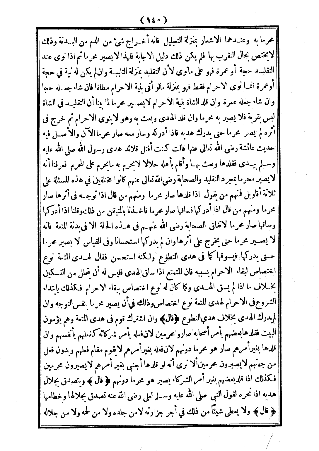 وَعِنْدَهُمَا الْإِشْعَارُ بِمَنْزِلَةِ التَّجْلِيلِ فَإِنَّهُ إخْرَاجُ شَيْءٍ مِنْ الدَّمِ مِنْ الْبَدَنَةِ، وَذَلِكَ لَا يَخْتَصُّ بِحَالِ التَّقَرُّبِ بِهَا فَلَمْ يَكُنْ ذَلِكَ دَلِيلَ الْإِجَابَةِ فَلِهَذَا لَا يَصِيرُ مُحْرِمًا ثُمَّ إذَا نَوَى عِنْدَ التَّقْلِيدِ حَجَّةً أَوْ عُمْرَةً فَهُوَ عَلَى مَا نَوَى؛ لِأَنَّ التَّقْلِيدَ بِمَنْزِلَةِ التَّلْبِيَةِ، وَإِنْ لَمْ يَكُنْ لَهُ نِيَّةٌ فِي حَجَّةٍ أَوْ عُمْرَةٍ إنَّمَا نَوَى الْإِحْرَامَ فَقَطْ فَهُوَ بِمَنْزِلَةِ مَا لَوْ أَتَى بِنِيَّةِ الْإِحْرَامِ مُطْلَقًا، فَإِنْ شَاءَ جَعَلَهُ حَجًّا، وَإِنْ شَاءَ جَعَلَهُ عُمْرَةً، وَإِنْ قَلَّدَ الشَّاةَ بِنِيَّةِ الْإِحْرَامِ لَا يَصِيرُ مُحْرِمًا لِمَا بَيَّنَّا أَنَّ التَّقْلِيدَ فِي الشَّاةِ لَيْسَ بِقُرْبَةٍ فَلَا يَصِيرُ بِهِ مُحْرِمًا، وَإِنْ قَلَّدَ الْهَدْيَ وَبَعَثَ بِهِ وَهُوَ لَا يَنْوِي الْإِحْرَامَ ثُمَّ خَرَجَ فِي أَثَرِهِ لَمْ يَصِرْ مُحْرِمًا حَتَّى يُدْرِكَ هَدْيَهُ، فَإِذَا أَدْرَكَهُ وَسَارَ مَعَهُ صَارَ مُحْرِمًا الْآنَ، وَالْأَصْلُ فِيهِ حَدِيثُ «عَائِشَةَ - رَضِيَ اللَّهُ تَعَالَى عَنْهَا - قَالَتْ: كُنْتُ أَفْتِلُ قَلَائِدَ هَدْيِ رَسُولِ اللَّهِ - صَلَّى اللَّهُ عَلَيْهِ وَسَلَّمَ - بِيَدَيَّ فَقَلَّدَهَا وَبَعَثَ بِهَا وَأَقَامَ بِأَهْلِهِ حَلَالًا لَا يَحْرُمُ بِهِ مَا يَحْرُمُ عَلَى الْمُحْرِمِ» فَعَرَفْنَا أَنَّهُ لَا يَصِيرُ مُحْرِمًا بِمُجَرَّدِ التَّقْلِيدِ. وَالصَّحَابَةُ - رَضِيَ اللَّهُ عَنْهُمْ - كَانُوا مُخْتَلِفِينَ فِي هَذِهِ الْمَسْأَلَةِ عَلَى ثَلَاثَةِ أَقَاوِيلَ فَمِنْهُمْ مَنْ يَقُولُ إذَا قَلَّدَهَا صَارَ مُحْرِمًا، وَمِنْهُمْ مَنْ قَالَ: إذَا تَوَجَّهَ فِي أَثَرِهَا صَارَ مُحْرِمًا وَمِنْهُمْ مَنْ قَالَ: إذَا أَدْرَكَهَا فَسَاقَهَا صَارَ مُحْرِمًا فَأَخَذْنَا بِالْمُتَيَقَّنِ مِنْ ذَلِكَ وَقُلْنَا إذَا أَدْرَكَهَا وَسَاقَهَا صَارَ مُحْرِمًا لِاتِّفَاقِ الصَّحَابَةِ - رَضِيَ اللَّهُ عَنْهُمْ - فِي هَذِهِ الْحَالَةِ إلَّا فِي بَدَنَةِ الْمُتْعَةِ فَإِنَّهُ لَا يَصِيرُ مُحْرِمًا حَتَّى يَخْرُجَ عَلَى أَثَرِهَا، وَإِنْ لَمْ يُدْرِكْهَا اسْتِحْسَانًا، وَفِي الْقِيَاسِ لَا يَصِيرُ مُحْرِمًا حَتَّى يُدْرِكَهَا فَيَسُوقَهَا كَمَا فِي هَدْيِ التَّطَوُّعِ، وَلَكِنَّهُ اسْتَحْسَنَ، فَقَالَ: لِهَدْيِ الْمُتْعَةِ نَوْعُ اخْتِصَاصٍ لِبَقَاءِ الْإِحْرَامِ بِسَبَبِهِ فَإِنَّ الْمُتَمَتِّعَ إذَا سَاقَ الْهَدْيَ فَلَيْسَ لَهُ أَنْ يَتَحَلَّلَ مِنْ النُّسُكَيْنِ بِخِلَافِ مَا إذَا لَمْ يَسُقْ الْهَدْيَ وَكَمَا كَانَ لَهُ نَوْعُ اخْتِصَاصٍ بِبَقَاءِ الْإِحْرَامِ فَكَذَلِكَ بِابْتِدَاءِ الشُّرُوعِ فِي الْإِحْرَامِ لِهَدْيِ الْمُتْعَةِ نَوْعُ اخْتِصَاصٍ، وَذَلِكَ فِي أَنْ يَصِيرَ مُحْرِمًا بِنَفْسِ التَّوَجُّهِ، وَإِنْ لَمْ يُدْرِكْ الْهَدْيَ بِخِلَافِ هَدْيِ التَّطَوُّعِ
