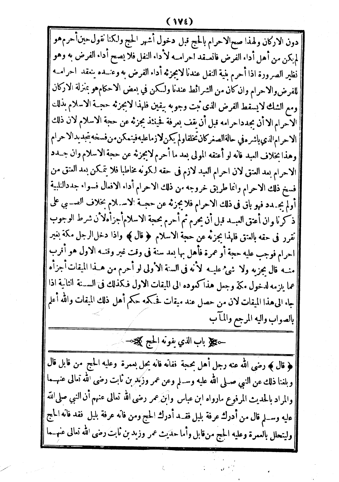 (بَابُ الَّذِي يَفُوتُهُ الْحَجُّ) (قَالَ): - رَضِيَ اللَّهُ عَنْهُ - رَجُلٌ أَهَلَّ بِحَجَّةٍ فَفَاتَهُ فَإِنَّهُ يَحِلُّ بِعُمْرَةٍ وَعَلَيْهِ الْحَجُّ مِنْ قَابِلٍ، قَالَ: وَبَلَغَنَا ذَلِكَ عَنْ النَّبِيِّ - صَلَّى اللَّهُ عَلَيْهِ وَسَلَّمَ - عَنْ عُمَرَ وَزَيْدِ بْنِ ثَابِتٍ - رَضِيَ اللَّهُ تَعَالَى عَنْهُمَا - وَالْمُرَادُ بِالْحَدِيثِ الْمَرْفُوعِ مَا رَوَاهُ ابْنُ عَبَّاسٍ وَابْنُ عُمَرَ - رَضِيَ اللَّهُ تَعَالَى عَنْهُمْ - أَنَّ النَّبِيَّ - صَلَّى اللَّهُ عَلَيْهِ وَسَلَّمَ - قَالَ: «مَنْ أَدْرَكَ عَرَفَةَ بِلَيْلٍ فَقَدْ أَدْرَكَ الْحَجَّ وَمَنْ فَاتَهُ عَرَفَةَ بِلَيْلٍ فَقَدْ فَاتَهُ الْحَجُّ وَلْيَتَحَلَّلْ بِالْعُمْرَةِ وَعَلَيْهِ الْحَجُّ مِنْ قَابِلٍ». وَأَمَّا حَدِيثُ عُمَرَ وَزَيْدِ بْنِ ثَابِتٍ - رَضِيَ اللَّهُ تَعَالَى عَنْهُمَا -
