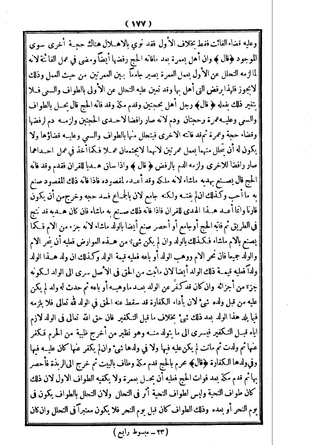 (قَالَ): رَجُلٌ أَهَلَّ بِحَجَّتَيْنِ وَقَدِمَ مَكَّةَ، وَقَدْ فَاتَهُ الْحَجُّ قَالَ: يَحِلُّ بِالطَّوَافِ وَالسَّعْيِ وَعَلَيْهِ عُمْرَةٌ وَحَجَّتَانِ وَدَمٌ؛ لِأَنَّهُ صَارَ رَافِضًا لِإِحْدَى الْحَجَّتَيْنِ وَلَزِمَهُ دَمٌ لِرَفْضِهَا وَقَضَاءُ حَجَّةٍ وَعُمْرَةٍ، ثُمَّ قَدْ فَاتَتْهُ الْأُخْرَى فَيَتَحَلَّلُ مِنْهَا بِالطَّوَافِ وَالسَّعْيِ وَعَلَيْهِ قَضَاؤُهَا وَلَا يَكُونُ لَهُ أَنْ يَتَحَلَّل مِنْهَا بِعَمَلِ عُمْرَتَيْنِ؛ لِأَنَّهُمَا لَا يَجْتَمِعَانِ عَمَلًا فَكَمَا أَخَذَ فِي عَمَلِ إحْدَاهُمَا صَارَ رَافِضًا لِلْأُخْرَى وَلَزِمَهُ الدَّمُ بِالرَّفْضِ