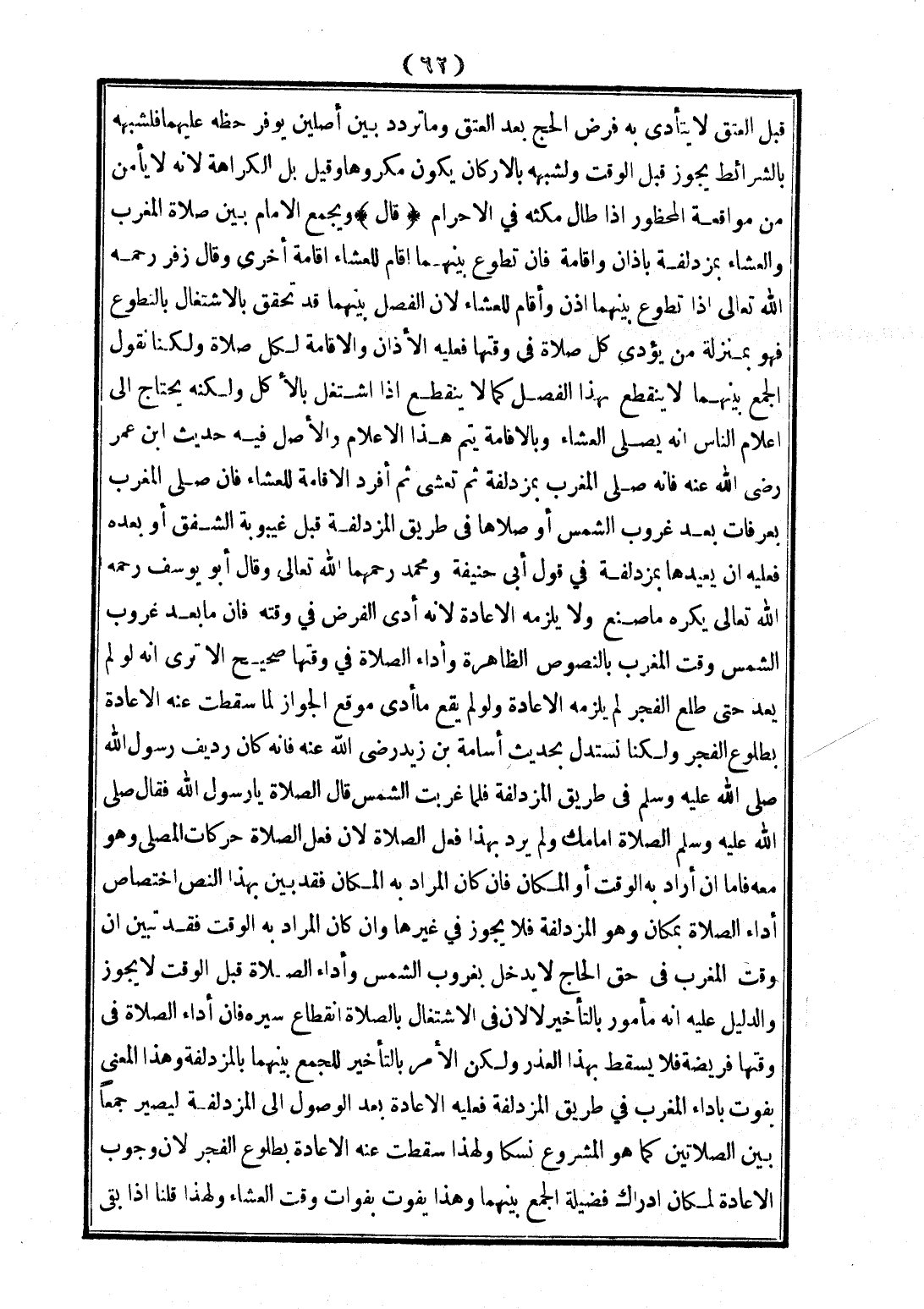 (قَالَ) وَيَجْمَعُ الْإِمَامُ بَيْنَ صَلَاةِ الْمَغْرِبِ وَالْعِشَاءِ بِمُزْدَلِفَةَ بِأَذَانٍ وَإِقَامَةٍ فَإِنْ تَطَوَّعَ بَيْنَهُمَا أَقَامَ لِلْعِشَاءِ إقَامَةً أُخْرَى، وَقَالَ زُفَرُ - رَحِمَهُ اللَّهُ تَعَالَى - إذَا تَطَوَّعَ بَيْنَهُمَا أَذَّنَ، وَأَقَامَ لِلْعِشَاءِ؛ لِأَنَّ الْفَصْلَ بَيْنَهُمَا قَدْ تَحَقَّقَ بِالِاشْتِغَالِ بِالتَّطَوُّعِ فَهُوَ بِمَنْزِلَةِ مَنْ يُؤَدِّي كُلَّ صَلَاةٍ فِي وَقْتِهَا فَعَلَيْهِ الْأَذَانُ وَالْإِقَامَةُ لِكُلِّ صَلَاةٍ، وَلَكِنَّا نَقُولُ: الْجَمْعُ بَيْنَهُمَا لَا يَنْقَطِعُ بِهَذَا الْفَصْلِ كَمَا لَا يَنْقَطِعُ إذَا اشْتَغَلَ بِالْأَكْلِ، وَلَكِنَّهُ يَحْتَاجُ إلَى إعْلَامِ النَّاسِ أَنَّهُ يُصَلِّي الْعِشَاءَ، وَبِالْإِقَامَةِ يَتِمُّ هَذَا الْإِعْلَامُ، وَالْأَصْلُ فِيهِ حَدِيثُ ابْنِ عُمَرَ - رَضِيَ اللَّهُ عَنْهُ - فَإِنَّهُ صَلَّى الْمَغْرِبَ بِمُزْدَلِفَةَ ثُمَّ تَعَشَّى ثُمَّ أَفْرَدَ الْإِقَامَةَ لِلْعِشَاءِ فَإِنْ صَلَّى الْمَغْرِبَ بِعَرَفَاتٍ بَعْدَ غُرُوبِ الشَّمْسِ أَوْ صَلَّاهَا فِي طَرِيقِ الْمُزْدَلِفَةِ قَبْلَ غَيْبُوبَةِ الشَّفَقِ أَوْ بَعْدَهُ فَعَلَيْهِ أَنْ يُعِيدَهَا بِمُزْدَلِفَةَ فِي قَوْلِ أَبِي حَنِيفَةَ وَمُحَمَّدٍ رَحِمَهُمَا اللَّهُ تَعَالَى، وَقَالَ أَبُو يُوسُفَ - رَحِمَهُ اللَّهُ تَعَالَى - يُكْرَهُ مَا صَنَعَ، وَلَا يَلْزَمُهُ الْإِعَادَةُ؛ لِأَنَّهُ أَدَّى الْفَرْضَ فِي وَقْتِهِ فَإِنَّ مَا بَعْدَ غُرُوبِ الشَّمْسِ وَقْتُ الْمَغْرِبِ بِالنُّصُوصِ الظَّاهِرَةِ، وَأَدَاءُ الصَّلَاةِ فِي وَقْتِهَا صَحِيحٌ أَلَا تَرَى أَنَّهُ لَوْ لَمْ يُعِدْ حَتَّى طَلَعَ الْفَجْرُ لَمْ يَلْزَمْهُ الْإِعَادَةُ، وَلَوْ لَمْ يَقَعْ مَا أَدَّى مَوْقِعَ الْجَوَازِ لَمَا سَقَطَ عَنْهُ الْإِعَادَةُ بِطُلُوعِ الْفَجْرِ، وَلَكِنَّا نَسْتَدِلُّ بِحَدِيثِ «أُسَامَةَ بْنِ زَيْدٍ - رَضِيَ اللَّهُ عَنْهُ - فَإِنَّهُ كَانَ رَدِيفَ رَسُولِ اللَّهِ - صَلَّى اللَّهُ عَلَيْهِ وَسَلَّمَ - فِي طَرِيقِ الْمُزْدَلِفَةِ فَلَمَّا غَرَبَتْ الشَّمْسُ قَالَ: الصَّلَاةَ يَا رَسُولَ اللَّهِ فَقَالَ - صَلَّى اللَّهُ عَلَيْهِ وَسَلَّمَ -: الصَّلَاةُ أَمَامَك»، وَلَمْ يُرِدْ بِهَذَا فِعْلَ الصَّلَاةِ؛ لِأَنَّ فِعْلَ الصَّلَاةِ حَرَكَاتُ الْمُصَلِّي، وَهُوَ مَعَهُ فَإِمَّا إنْ أَرَادَ بِهِ الْوَقْتَ أَوْ الْمَكَانَ فَإِنْ كَانَ الْمُرَادُ بِهِ الْمَكَانَ فَقَدْ بَيَّنَ بِهَذَا النَّصِّ اخْتِصَاصَ أَدَاءِ الصَّلَاةِ بِمَكَانٍ، وَهُوَ الْمُزْدَلِفَةُ فَلَا يَجُوزُ فِي غَيْرِهَا، وَإِنْ كَانَ الْمُرَادُ بِهِ الْوَقْتَ فَقَدْ تَبَيَّنَ أَنَّ وَقْتَ الْمَغْرِبِ فِي حَقِّ الْحَاجِّ لَا يَدْخُلُ بِغُرُوبِ الشَّمْسِ، وَأَدَاءُ الصَّلَاةِ قَبْلَ الْوَقْتِ لَا يَجُوزُ، وَالدَّلِيلُ عَلَيْهِ أَنَّهُ مَأْمُورٌ بِالتَّأْخِيرِ؛ لِأَنَّ فِي الِاشْتِغَالِ بِالصَّلَاةِ انْقِطَاعَ سَيْرِهِ فَإِنَّ أَدَاءَ الصَّلَاةِ فِي وَقْتِهَا فَرِيضَةٌ فَلَا يَسْقُطُ بِهَذَا الْعُذْرِ، وَلَكِنَّ الْأَمْرَ بِالتَّأْخِيرِ لِلْجَمْعِ بَيْنَهُمَا بِالْمُزْدَلِفَةِ، وَهَذَا الْمَعْنَى يَفُوتُ بِأَدَاءِ الْمَغْرِبِ فِي طَرِيقِ الْمُزْدَلِفَةِ فَعَلَيْهِ الْإِعَادَةُ بَعْدَ الْوُصُولِ إلَى الْمُزْدَلِفَةِ لِيَصِيرَ جَمْعًا بَيْنَ الصَّلَاتَيْنِ كَمَا هُوَ الْمَشْرُوعُ نُسُكًا، وَلِهَذَا سَقَطَتْ عَنْهُ الْإِعَادَةُ بِطُلُوعِ الْفَجْرِ؛ لِأَنَّ وُجُوبَ الْإِعَادَةِ لِمَكَانِ إدْرَاكِ فَضِيلَةِ الْجَمْعِ بَيْنَهُمَا، وَهَذَا يَفُوتُ بِفَوَاتِ وَقْتِ الْعِشَاءِ، وَلِهَذَا قُلْنَا إذَا بَقِيَ