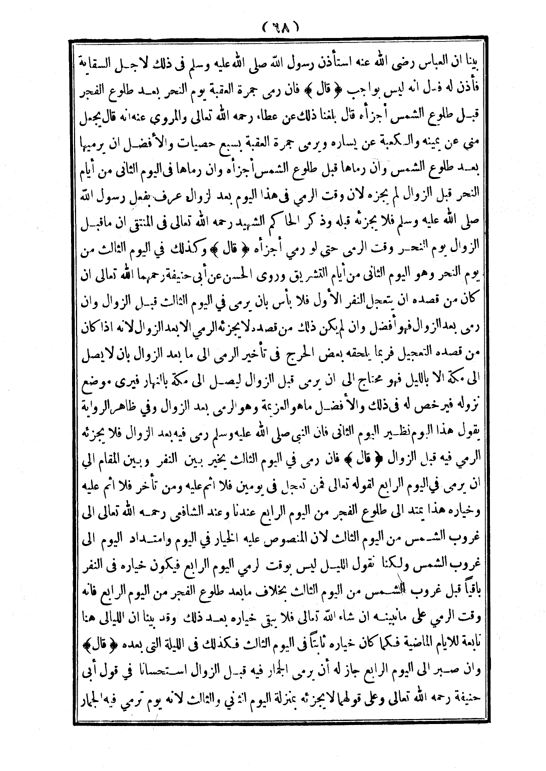 (قَالَ) فَإِنْ رَمَى جَمْرَةَ الْعَقَبَةِ يَوْمَ النَّحْرِ بَعْدَ طُلُوعِ الْفَجْرِ قَبْلَ طُلُوعِ الشَّمْسِ أَجْزَأَهُ قَالَ بَلَغَنَا ذَلِكَ عَنْ عَطَاءٍ - رَحِمَهُ اللَّهُ تَعَالَى -، وَالْمَرْوِيُّ عَنْهُ أَنَّهُ قَالَ يَجْعَلُ مِنًى عَنْ يَمِينِهِ، وَالْكَعْبَةَ عَنْ يَسَارِهِ، وَيَرْمِي جَمْرَةَ الْعَقَبَةِ بِسَبْعِ حَصَيَاتٍ، وَالْأَفْضَلُ أَنْ يَرْمِيَهَا بَعْدَ طُلُوعِ الشَّمْسِ، وَإِنْ رَمَاهَا قَبْلَ طُلُوعِ الشَّمْسِ أَجْزَأَهُ، وَإِنْ رَمَاهَا فِي الْيَوْمِ الثَّانِي مِنْ أَيَّامِ النَّحْرِ قَبْلَ الزَّوَالِ لَمْ يُجْزِهِ؛ لِأَنَّ وَقْتَ الرَّمْيِ فِي هَذَا الْيَوْمِ بَعْدَ الزَّوَالِ عُرِفَ بِفِعْلِ رَسُولِ اللَّهِ - صَلَّى اللَّهُ عَلَيْهِ وَسَلَّمَ - فَلَا يُجْزِئُهُ قَبْلَهُ، وَذَكَرَ الْحَاكِمُ الشَّهِيدُ - رَحِمَهُ اللَّهُ تَعَالَى - فِي الْمُنْتَقَى أَنَّ مَا قَبْلَ الزَّوَالِ يَوْمَ النَّحْرِ وَقْتُ الرَّمْيِ حَتَّى لَوْ رَمَى أَجْزَأَهُ.