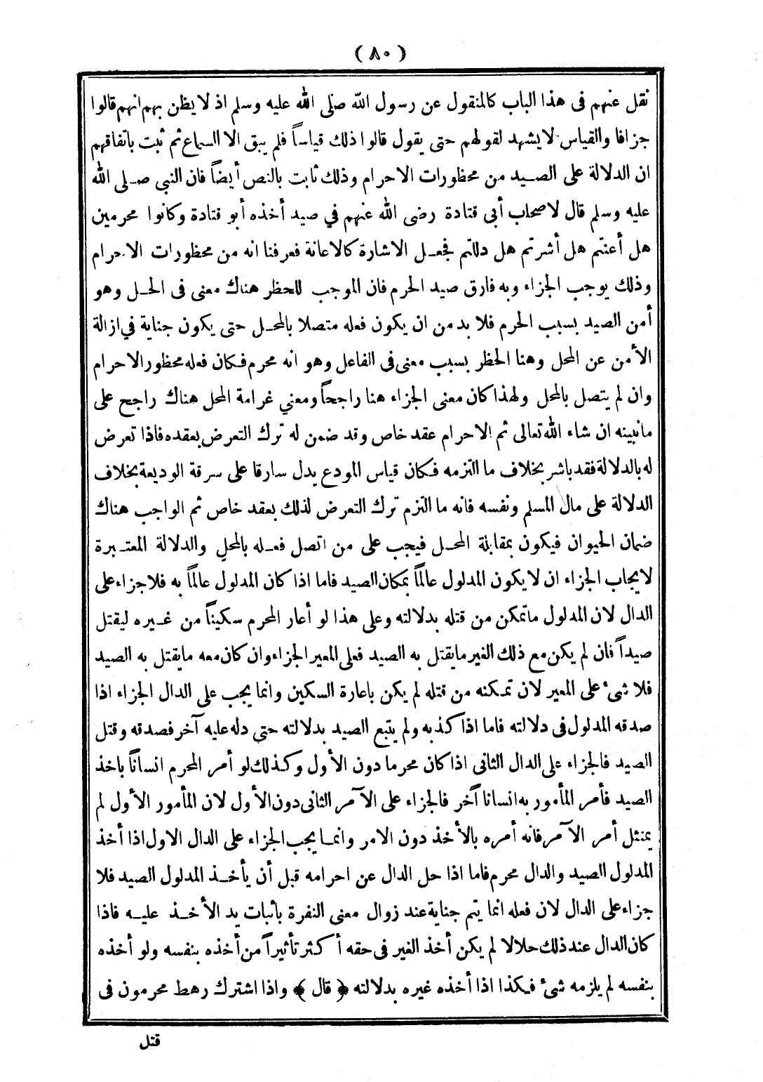 وَهُنَا الْحَظْرُ بِسَبَبِ مَعْنًى فِي الْفَاعِلِ، وَهُوَ أَنَّهُ مُحْرِمٌ فَكَانَ فِعْلُهُ مَحْظُورًا لِإِحْرَامٍ، وَإِنْ لَمْ يَتَّصِلْ بِالْمَحِلِّ، وَلِهَذَا كَانَ مَعْنَى الْجَزَاءِ هُنَا رَاجِحًا، وَمَعْنَى غَرَامَةِ الْمَحِلِّ هُنَاكَ رَاجِحٌ عَلَى مَا نُبَيِّنُهُ إنْ شَاءَ اللَّهُ تَعَالَى ثُمَّ الْإِحْرَامُ عَقْدٌ خَاصٌّ، وَقَدْ ضَمِنَ لَهُ تَرْكَ التَّعَرُّضِ بِعَقْدِهِ فَإِذَا تَعَرَّضَ لَهُ بِالدَّلَالَةِ فَقَدْ بَاشَرَ بِخِلَافِ مَا الْتَزَمَهُ فَكَانَ قِيَاسَ الْمُودَعِ يَدُلُّ سَارِقًا عَلَى سَرِقَةِ الْوَدِيعَةِ بِخِلَافِ الدَّلَالَةِ عَلَى مَالِ الْمُسْلِمِ وَنَفْسِهِ فَإِنَّهُ مَا الْتَزَمَ تَرْكَ التَّعَرُّضِ لِذَلِكَ بِعَقْدٍ خَاصٍّ ثُمَّ الْوَاجِبُ هُنَاكَ ضَمَانُ الْحَيَوَانِ فَيَكُونُ بِمُقَابَلَةِ الْمَحِلِّ فَيَجِبُ عَلَى مَنْ اتَّصَلَ فِعْلُهُ بِالْمَحِلِّ وَالدَّلَالَةِ الْمُعْتَبَرَةِ لِإِيجَابِ الْجَزَاءِ أَنْ لَا يَكُونَ الْمَدْلُولُ عَالِمًا بِمَكَانِ الصَّيْدِ فَأَمَّا إذَا كَانَ الْمَدْلُولُ عَالِمًا بِهِ فَلَا جَزَاءَ عَلَى الدَّالِّ لِأَنَّ الْمَدْلُولَ مَا تَمَكَّنَ مِنْ قَتْلِهِ بِدَلَالَتِهِ، وَعَلَى هَذَا لَوْ أَعَارَ الْمُحْرِمُ سِكِّينًا مِنْ غَيْرِهِ لِيَقْتُلَ صَيْدًا فَإِنْ لَمْ يَكُنْ مَعَ ذَلِكَ الْغَيْرِ مَا يَقْتُلُ بِهِ الصَّيْدَ فَعَلَى الْمُعِيرِ الْجَزَاءُ، وَإِنْ كَانَ مَعَهُ مَا يَقْتُلُ بِهِ الصَّيْدَ فَلَا شَيْءَ عَلَى الْمُعِيرِ لِأَنَّ تَمَكُّنَهُ مِنْ قَتْلِهِ لَمْ يَكُنْ بِإِعَارَةِ السِّكِّينِ، وَإِنَّمَا يَجِبُ عَلَى الدَّالِّ الْجَزَاءُ إذَا صَدَّقَهُ الْمَدْلُولُ فِي دَلَالَتِهِ فَأَمَّا إذَا كَذَّبَهُ وَلَمْ يَتْبَعْ الصَّيْدَ بِدَلَالَتِهِ حَتَّى دَلَّ عَلَيْهِ آخَرُ فَصَدَّقَهُ وَقَتَلَ الصَّيْدَ فَالْجَزَاءُ عَلَى الدَّالِّ الثَّانِي إذَا كَانَ مُحْرِمًا دُونَ الْأَوَّلِ.