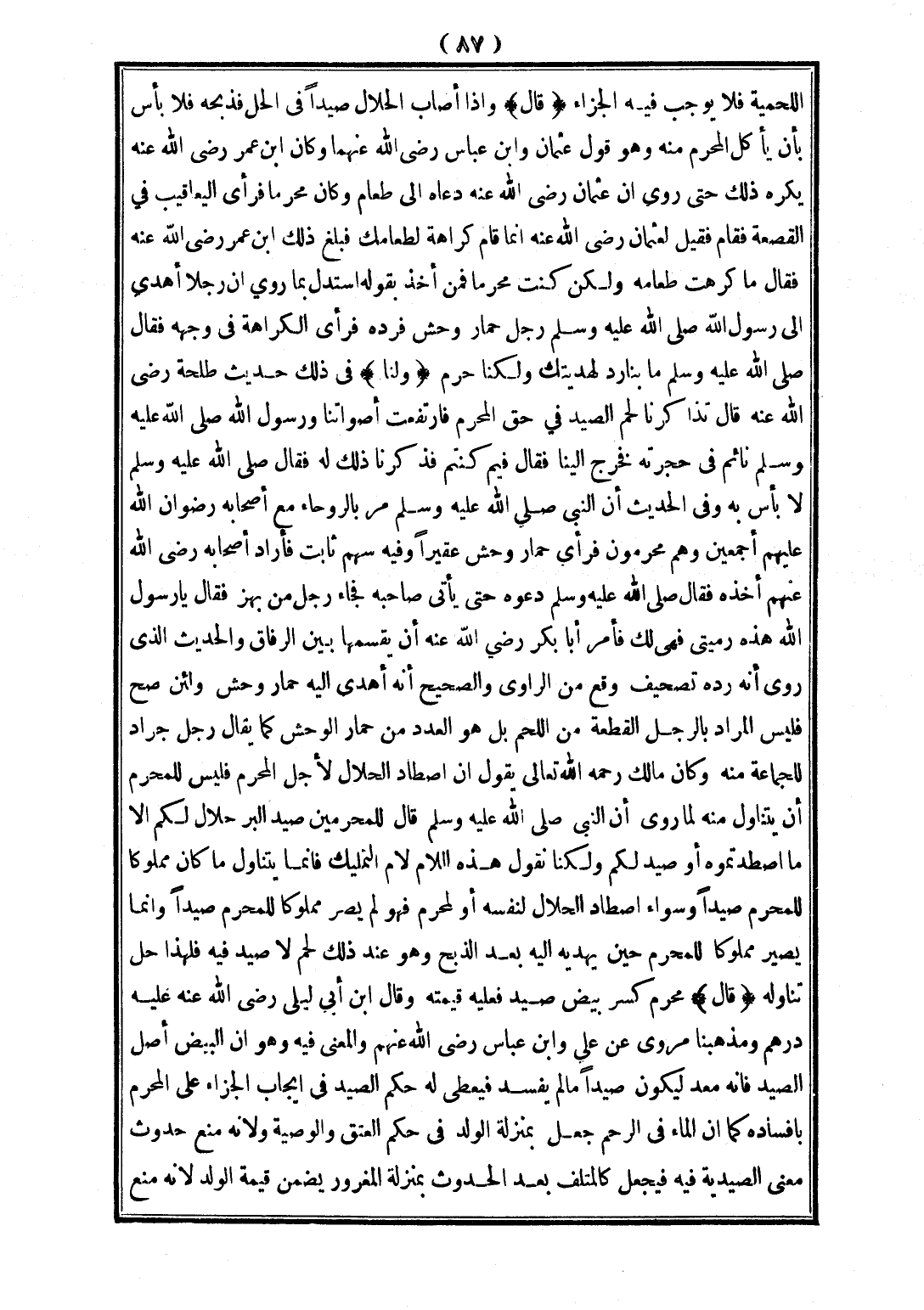 (قَالَ) وَإِذَا أَصَابَ الْحَلَالُ صَيْدًا فِي الْحِلِّ فَذَبَحَهُ فَلَا بَأْسَ بِأَنْ يَأْكُلَ الْمُحْرِمُ مِنْهُ، وَهُوَ قَوْلُ عُثْمَانَ وَابْنِ عَبَّاسٍ - رَضِيَ اللَّهُ عَنْهُمَا -، وَكَانَ ابْنُ عُمَرَ - رَضِيَ اللَّهُ عَنْهُ - يَكْرَهُ ذَلِكَ حَتَّى رُوِيَ أَنَّ عُثْمَانَ - رَضِيَ اللَّهُ عَنْهُ - دَعَاهُ إلَى الطَّعَامِ، وَكَانَ مُحْرِمًا فَرَأَى الْيَعَاقِيبَ فِي الْقَصْعَةِ فَقَامَ فَقِيلَ لِعُثْمَانَ - رَضِيَ اللَّهُ عَنْهُ - إنَّمَا قَامَ كَرَاهَةً لِطَعَامِك فَبَلَغَ ذَلِكَ ابْنَ عُمَرَ - رَضِيَ اللَّهُ عَنْهُ - فَقَالَ مَا كَرِهْت طَعَامَهُ، وَلَكِنْ كُنْت مُحْرِمًا فَمَنْ أَخَذَ بِقَوْلِهِ اسْتَدَلَّ بِمَا رُوِيَ «أَنَّ رَجُلًا أَهْدَى إلَى رَسُولِ اللَّهِ - صَلَّى اللَّهُ عَلَيْهِ وَسَلَّمَ - رِجْلَ حِمَارِ وَحْشٍ فَرَدَّهُ فَرَأَى الْكَرَاهَةَ فِي وَجْهِهِ فَقَالَ - صَلَّى اللَّهُ عَلَيْهِ وَسَلَّمَ - مَا بِنَا رَدٌّ لِهَدِيَّتِك، وَلَكِنَّا حُرُمٌ».