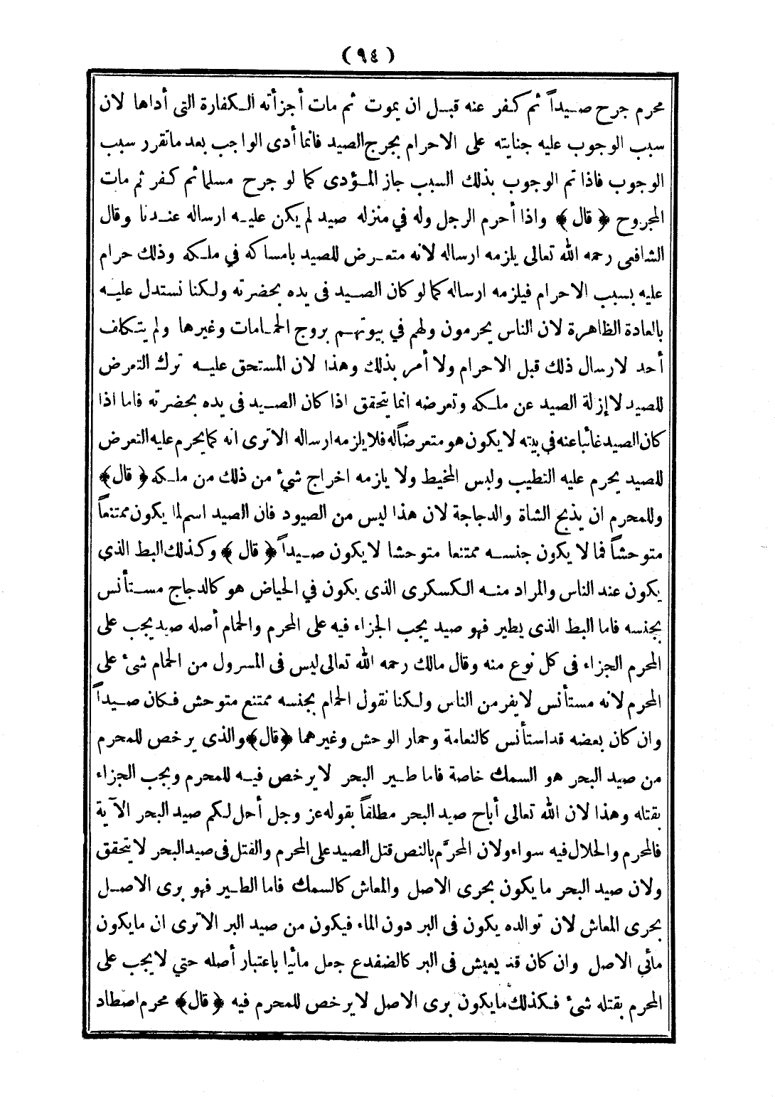 مُحْرِمٌ جَرَحَ صَيْدًا ثُمَّ كَفَّرَ عَنْهُ قَبْلَ أَنْ يَمُوتَ ثُمَّ مَاتَ أَجْزَأَتْهُ الْكَفَّارَةُ الَّتِي أَدَّاهَا لِأَنَّ سَبَبَ الْوُجُوبِ عَلَيْهِ جِنَايَتُهُ عَلَى الْإِحْرَامِ بِجُرْحِ الصَّيْدِ فَإِنَّمَا أَدَّى الْوَاجِبَ بَعْدَمَا تَقَرَّرَ سَبَبُ الْوُجُوبِ فَإِذَا تَمَّ الْوُجُوبُ بِذَلِكَ السَّبَبِ جَازَ الْمُؤَدِّي كَمَا لَوْ جَرَحَ مُسْلِمًا ثُمَّ كَفَّرَ ثُمَّ مَاتَ الْمَجْرُوحُ.