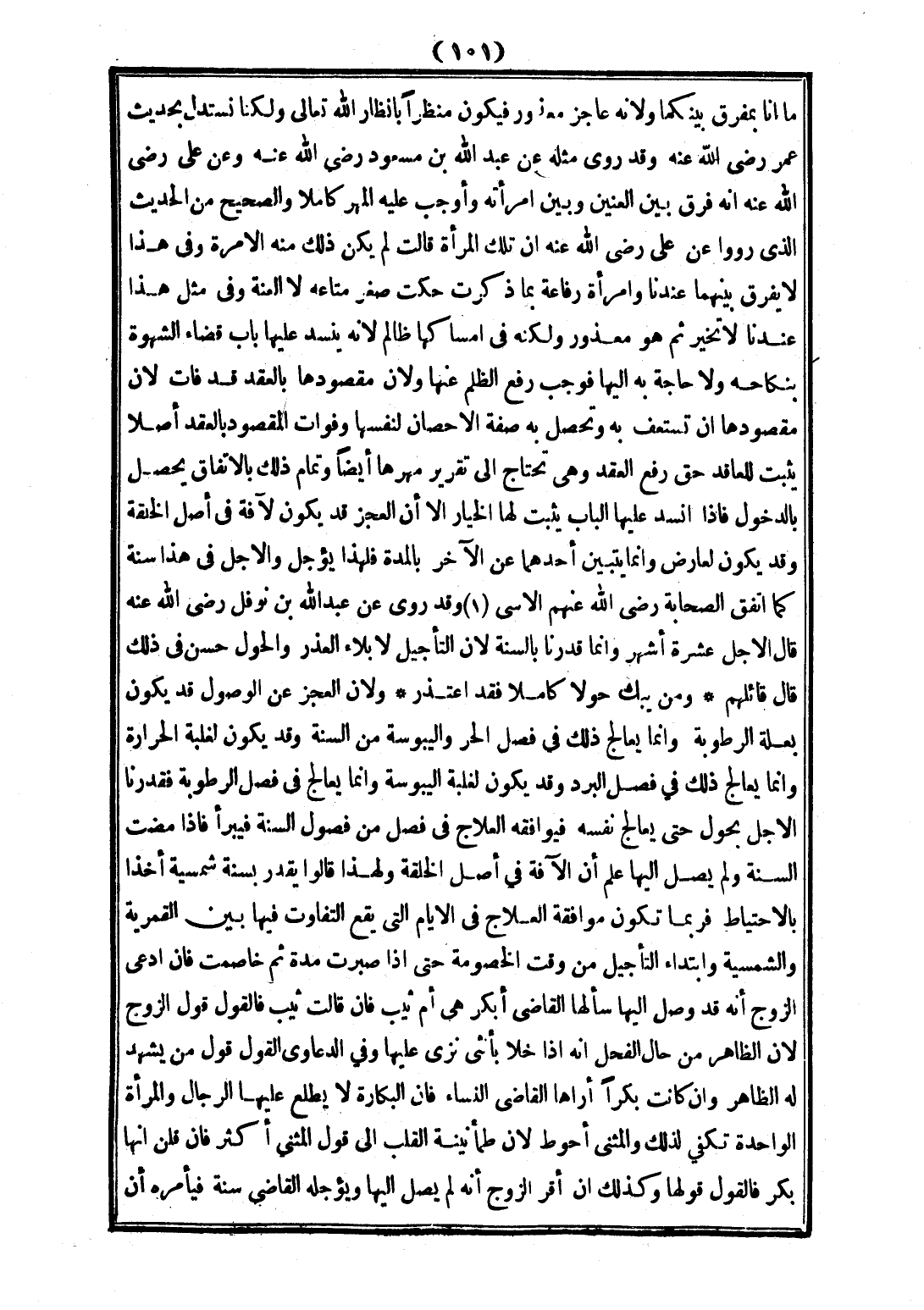 مَا أَنَا بِمُفَرِّقٍ بَيْنَكُمَا، وَلِأَنَّهُ عَاجِزٌ مَعْذُورٌ فَيَكُونُ مُنْظَرًا بِإِنْظَارِ اللَّهِ تَعَالَى، وَلَكِنَّا نَسْتَدِلُّ بِحَدِيثِ عُمَرَ - رَضِيَ اللَّهُ عَنْهُ - وَقَدْ رُوِيَ مِثْلُهُ عَنْ عَبْدِ اللَّهِ بْنِ مَسْعُودٍ - رَضِيَ اللَّهُ عَنْهُ -، وَعَنْ عَلِيٍّ - رَضِيَ اللَّهُ عَنْهُ - أَنَّهُ فَرَّقَ بَيْنَ الْعِنِّينِ وَبَيْنَ امْرَأَتِهِ وَأَوْجَبَ عَلَيْهِ الْمَهْرَ كَامِلًا، وَالصَّحِيحُ مِنْ الْحَدِيثِ الَّذِي رَوَوْا عَنْ عَلِيٍّ - رَضِيَ اللَّهُ عَنْهُ - أَنَّ تِلْكَ الْمَرْأَةَ قَالَتْ: لَمْ يَكُنْ ذَلِكَ مِنْهُ إلَّا مَرَّةً، وَفِي هَذَا لَا يُفَرَّقُ بَيْنَهُمَا عِنْدَنَا، وَامْرَأَةُ رِفَاعَةَ بِمَا ذَكَرَتْ حَكَتْ صِغَرَ مَتَاعِهِ لَا الْعُنَّةَ، وَفِي مِثْلِ هَذَا عِنْدَنَا لَا تُخَيَّرُ ثُمَّ هُوَ مَعْذُورٌ، وَلَكِنَّهُ فِي إمْسَاكِهَا ظَالِمٌ؛ لِأَنَّهُ يَنْسَدُّ عَلَيْهَا بَابُ قَضَاءِ الشَّهْوَةِ بِنِكَاحِهِ، وَلَا حَاجَةَ بِهِ إلَيْهَا فَوَجَبَ رَفْعُ الظُّلْمِ عَنْهَا، وَلِأَنَّ مَقْصُودَهَا بِالْعَقْدِ قَدْ فَاتَ؛ لِأَنَّ مَقْصُودَهَا أَنْ تَسْتَعِفَّ بِهِ وَتُحَصِّلَ بِهِ صِفَةَ الْإِحْصَانِ لِنَفْسِهَا، وَفَوَاتُ الْمَقْصُودِ بِالْعَقْدِ أَصْلًا يُثْبِتُ لِلْعَاقِدِ حَقَّ رَفْعِ الْعَقْدِ، وَهِيَ تَحْتَاجُ إلَى تَقْرِيرِ مَهْرِهَا أَيْضًا، وَتَمَامُ ذَلِكَ بِالِاتِّفَاقِ يَحْصُلُ بِالدُّخُولِ، فَإِذَا انْسَدَّ عَلَيْهَا الْبَابُ يَثْبُتُ لَهَا الْخِيَارُ، إلَّا أَنَّ الْعَجْزَ قَدْ يَكُونُ لِآفَةٍ فِي أَصْلِ الْخِلْقَةِ وَقَدْ يَكُونُ لِعَارِضٍ، وَإِنَّمَا يَتَبَيَّنُ أَحَدُهُمَا عَنْ الْآخَرِ بِالْمُدَّةِ فَلِهَذَا يُؤَجَّلُ، وَالْأَجَلُ فِي هَذَا سَنَةٌ كَمَا اتَّفَقَ الصَّحَابَةُ - رَضِيَ اللَّهُ عَنْهُمْ - الْأَسَى، وَقَدْ رُوِيَ عَنْ عَبْد اللَّهِ بْن نَوْفَلٍ - رَضِيَ اللَّهُ عَنْهُ - قَالَ: الْأَجَلُ عَشَرَةُ أَشْهُرٍ، وَإِنَّمَا قَدَّرْنَا بِالسَّنَةِ؛ لِأَنَّ التَّأْجِيلَ لِإِبْلَاءِ الْعُذْرِ وَالْحَوْلُ حَسَنٌ فِي ذَلِكَ قَالَ قَائِلُهُمْ: وَمَنْ يَبْكِ حَوْلًا كَامِلًا فَقَدْ اعْتَذَرَ