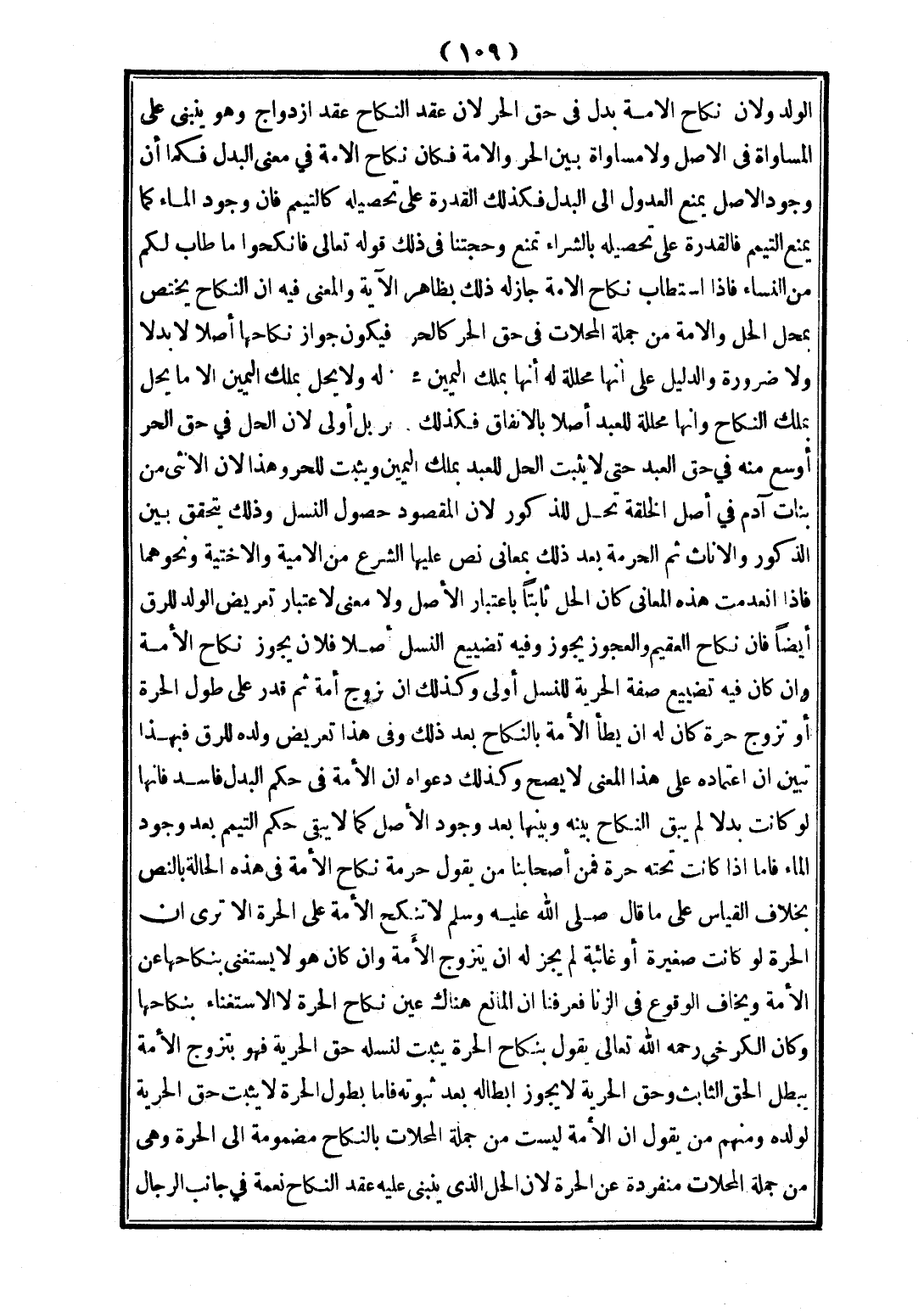 الْوَلَدِ، وَلِأَنَّ نِكَاحَ الْأَمَةِ بَدَلٌ فِي حَقِّ الْحُرِّ؛ لِأَنَّ عَقْدَ النِّكَاحِ عَقْدُ ازْدِوَاجٍ وَهُوَ يَنْبَنِي عَلَى الْمُسَاوَاةِ فِي الْأَصْلِ، وَلَا مُسَاوَاةَ بَيْنَ الْحُرِّ وَالْأَمَةِ فَكَانَ نِكَاحُ الْأَمَةِ فِي مَعْنَى الْبَدَلِ، فَكَمَا أَنَّ وُجُودَ الْأَصْلِ يَمْنَعُ الْعُدُولَ إلَى الْبَدَلِ فَكَذَلِكَ لِلْقُدْرَةِ عَلَى تَحْصِيلِهِ كَالتَّيَمُّمِ، فَإِنَّ وُجُودَ الْمَاءِ كَمَا يَمْنَعُ التَّيَمُّمَ فَالْقُدْرَةُ عَلَى تَحْصِيلِهِ بِالشِّرَاءِ تَمْنَعُ وَحُجَّتُنَا فِي ذَلِكَ قَوْله تَعَالَى: {فَانْكِحُوا مَا طَابَ لَكُمْ مِنْ النِّسَاءِ} [النساء: 3] فَإِذَا اسْتَطَابَ نِكَاحَ الْأَمَةِ جَازَ لَهُ ذَلِكَ بِظَاهِرِ الْآيَةِ، وَالْمَعْنَى فِيهِ أَنَّ النِّكَاحَ يَخْتَصُّ بِمَحَلِّ الْحِلِّ، وَالْأَمَةُ مِنْ جُمْلَةِ الْمَحَلَّاتِ فِي حَقِّ الْحُرِّ كَالْحُرِّ فَيَكُونُ جَوَازُ نِكَاحِهَا أَصْلًا لَا بَدَلًا وَلَا ضَرُورَةً، وَالدَّلِيلُ عَلَى أَنَّهَا مُحَلَّلَةٌ لَهُ أَنَّهَا بِمِلْكِ الْيَمِينِ مَحَلًّا لَهُ، وَلَا يَحِلُّ بِمِلْكِ الْيَمِينِ إلَّا مَا يَحِلُّ بِمِلْكِ النِّكَاحِ وَأَنَّهَا مُحَلَّلَةٌ لِلْعَبْدِ أَصْلًا بِالِاتِّفَاقِ فَكَذَلِكَ بَلْ أَوْلَى؛ لِأَنَّ الْحِلَّ فِي حَقِّ الْحُرِّ أَوْسَعُ مِنْهُ فِي حَقِّ الْعَبْدِ، لَا يَثْبُتُ الْحِلُّ لِلْعَبْدِ بِمِلْكِ الْيَمِينِ وَيَثْبُتُ لِلْحُرِّ، وَهَذَا لِأَنَّ الْأُنْثَى مِنْ بَنَاتِ آدَمَ فِي أَصْلِ الْخِلْقَةِ تَحِلُّ لِلذُّكُورِ؛ لِأَنَّ الْمَقْصُودَ حُصُولُ النَّسْلِ، وَذَلِكَ يَتَحَقَّقُ بَيْنَ الذُّكُورِ وَالْإِنَاثِ ثُمَّ الْحُرْمَةُ بَعْدَ ذَلِكَ بِمَعَانِي نَصَّ عَلَيْهَا الشَّرْعُ مِنْ الْأُمِّيَّةِ وَالْأُخْتِيَّةِ وَنَحْوِهِمَا، فَإِذَا انْعَدَمَتْ هَذِهِ الْمَعَانِي كَانَ الْحِلُّ ثَابِتًا بِاعْتِبَارِ الْأَصْلِ، وَلَا مَعْنَى لِاعْتِبَارِ تَعْرِيضِ الْوَلَدِ لِلرِّقِّ أَيْضًا فَأَنَّ نِكَاحَ الْعَقِيمِ وَالْعَجُوزِ يَجُوزُ، وَفِيهِ تَضْيِيعُ النَّسْلِ أَصْلًا، فَلَأَنْ يَجُوزَ نِكَاحُ الْأَمَةِ، وَإِنْ كَانَ فِيهِ تَضْيِيعُ صِفَةِ الْحُرِّيَّةِ لِلنَّسْلِ أَوْلَى، وَكَذَلِكَ إنْ تَزَوَّجَ أَمَةً ثُمَّ قَدَرَ عَلَى طَوْلِ الْحُرَّةِ أَوْ تَزَوَّجَ حُرَّةً كَانَ لَهُ أَنْ يَطَأَ الْأَمَةَ بِالنِّكَاحِ بَعْدَ ذَلِكَ، وَفِي هَذَا تَعْرِيضُ وَلَدِهِ لِلرِّقِّ، فَبِهَذَا تَبَيَّنَ أَنَّ اعْتِمَادَهُ عَلَى هَذَا الْمَعْنَى لَا يَصِحُّ، وَكَذَلِكَ دَعْوَاهُ أَنَّ الْأَمَةَ فِي حُكْمِ الْبَدَلِ فَاسِدٌ، فَإِنَّهَا لَوْ كَانَتْ بَدَلًا لَمْ يَبْقَ النِّكَاحُ بَيْنَهُ وَبَيْنَهَا بَعْدَ وُجُودِ الْأَصْلِ، كَمَا لَا يَبْقَى حُكْمُ التَّيَمُّمِ بَعْدَ وُجُودِ الْمَاءِ، فَأَمَّا إذَا كَانَتْ تَحْتَهُ حُرَّةٌ فَمِنْ أَصْحَابِنَا مَنْ يَقُولُ: حُرْمَةُ نِكَاحِ الْأَمَةِ فِي هَذِهِ الْحَالَةِ بِالنَّصِّ، بِخِلَافِ الْقِيَاسِ عَلَى مَا قَالَ - صَلَّى اللَّهُ عَلَيْهِ وَسَلَّمَ -: «لَا تُنْكَحُ الْأَمَةُ عَلَى الْحُرَّةِ».