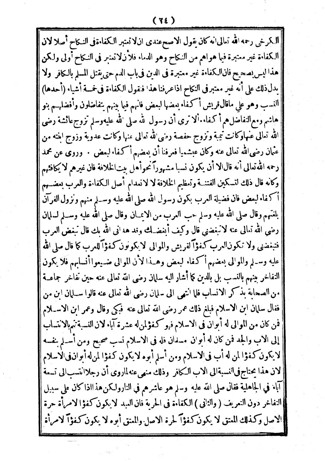 وَرُوِيَ عَنْ مُحَمَّدٍ - رَحِمَهُ اللَّهُ تَعَالَى - أَنَّهُ قَالَ: إلَّا أَنْ يَكُونَ نَسَبًا مَشْهُورًا نَحْوَ أَهْلِ بَيْتِ الْخِلَافَةِ فَإِنَّ غَيْرَهُمْ لَا يُكَافِئُهُمْ، وَكَأَنَّهُ قَالَ ذَلِكَ؛ لِتَسْكِينِ الْفِتْنَةِ وَتَعْظِيمِ الْخِلَافَةِ، لَا لِانْعِدَامِ أَصْلِ الْكَفَاءَةِ، وَالْعَرَبُ بَعْضُهُمْ أَكْفَاءٌ لِبَعْضٍ فَإِنَّ فَضِيلَةَ الْعَرَبِ بِكَوْنِ رَسُولِ اللَّهِ - صَلَّى اللَّهُ عَلَيْهِ وَسَلَّمَ - مِنْهُمْ، وَنُزُولِ الْقُرْآنِ بِلُغَتِهِمْ، وَقَالَ - صَلَّى اللَّهُ عَلَيْهِ وَسَلَّمَ -: «حُبُّ الْعَرَبِ مِنْ الْإِيمَانِ» «، وَقَالَ - صَلَّى اللَّهُ عَلَيْهِ وَسَلَّمَ - لِسَلْمَانَ - رَضِيَ اللَّهُ تَعَالَى عَنْهُ - لَا تَبْغَضْنِي قَالَ: وَكَيْفَ أَبْغَضُك، وَقَدْ هَدَانِي اللَّهُ بِك؟ قَالَ: تَبْغَضُ الْعَرَبَ فَتَبْغَضُنِي»، وَلَا تَكُونُ الْعَرَبُ كُفُؤًا لِقُرَيْشٍ وَالْمَوَالِي لَا يَكُونُونَ كُفُؤًا لِلْعَرَبِ كَمَا قَالَ - صَلَّى اللَّهُ عَلَيْهِ وَسَلَّمَ -: «وَالْمَوَالِي بَعْضُهُمْ أَكْفَاءٌ لِبَعْضٍ»، وَهَذَا لِأَنَّ الْمَوَالِيَ ضَيَّعُوا أَنْسَابَهُمْ فَلَا يَكُونُ التَّفَاخُرُ بَيْنَهُمْ بِالنَّسَبِ بَلْ بِالدِّينِ كَمَا أَشَارَ إلَيْهِ سَلْمَانُ - رَضِيَ اللَّهُ تَعَالَى عَنْهُ - حِينَ تَفَاخَرَ جَمَاعَةٌ مِنْ الصَّحَابَةِ بِذِكْرِ الْأَنْسَابِ فَلَمَّا انْتَهَى إلَى سَلْمَانَ - رَضِيَ اللَّهُ تَعَالَى عَنْهُ - قَالُوا: سَلْمَانُ ابْنُ مَنْ؟ فَقَالَ سَلْمَانُ: ابْنُ الْإِسْلَامِ فَبَلَغَ عُمَرَ - رَضِيَ اللَّهُ تَعَالَى عَنْهُ - فَبَكَى، وَقَالَ وَعُمَرُ ابْنُ الْإِسْلَامِ فَمَنْ كَانَ مِنْ الْمَوَالِي لَهُ أَبَوَانِ فِي الْإِسْلَامِ فَهُوَ كُفُؤٌ لِمَنْ لَهُ عَشَرَةُ آبَاءٍ؛ لِأَنَّ النِّسْبَةَ تَتِمُّ بِالِانْتِسَابِ إلَى الْأَبِ وَالْجَدِّ فَمَنْ كَانَ لَهُ أَبَوَانِ مُسْلِمَانِ فَلَهُ فِي الْإِسْلَامِ نَسَبٌ صَحِيحٌ وَمَنْ أَسْلَمَ بِنَفْسِهِ لَا يَكُونُ كُفُؤًا؛ لِمَنْ لَهُ أَبٌ فِي الْإِسْلَامِ وَمَنْ أَسْلَمَ أَبُوهُ لَا يَكُونُ كُفُؤًا لِمَنْ لَهُ أَبَوَانِ فِي الْإِسْلَامِ؛ لِأَنَّ هَذَا يَحْتَاجُ فِي النِّسْبَةِ إلَى الْأَبِ الْكَافِرِ، وَذَلِكَ مَنْهِيٌّ عَنْهُ؛ لِمَا رُوِيَ «أَنَّ رَجُلًا انْتَسَبَ إلَى تِسْعَةِ آبَاءٍ فِي الْجَاهِلِيَّةِ فَقَالَ - صَلَّى اللَّهُ عَلَيْهِ وَسَلَّمَ -: هُوَ عَاشِرُهُمْ فِي النَّارِ» وَلَكِنَّ هَذَا إذَا كَانَ عَلَى سَبِيلِ التَّفَاخُرِ دُونَ التَّعْرِيفِ