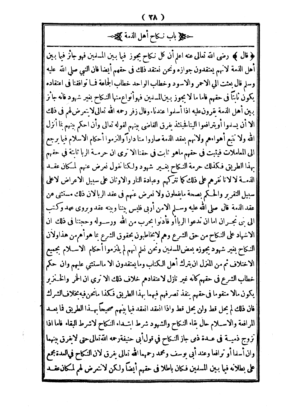 (قَالَ:) - رَضِيَ اللَّهُ تَعَالَى عَنْهُ - اعْلَمْ أَنَّ كُلَّ نِكَاحٍ يَجُوزُ فِيمَا بَيْنَ الْمُسْلِمِينَ فَهُوَ جَائِزٌ فِيمَا بَيْنَ أَهْلِ الذِّمَّةِ؛ لِأَنَّهُمْ يَعْتَقِدُونَ جَوَازَهُ، وَنَحْنُ نَعْتَقِدُ ذَلِكَ فِي حَقِّهِمْ أَيْضًا «فَإِنَّ النَّبِيَّ - صَلَّى اللَّهُ عَلَيْهِ وَسَلَّمَ - قَالَ: بُعِثْتُ إلَى الْأَحْمَرِ» وَالْأَسْوَدِ، وَخِطَابُ الْوَاحِدِ خِطَابُ الْجَمَاعَةِ فَمَا تَوَافَقْنَا فِي اعْتِقَادِهِ يَكُونُ ثَابِتًا فِي حَقِّهِمْ، فَأَمَّا مَا لَا يَجُوزُ بَيْنَ الْمُسْلِمِينَ فَهُوَ أَنْوَاعٌ مِنْهَا النِّكَاحُ بِغَيْرِ شُهُودٍ فَإِنَّهُ جَائِزٌ بَيْنَ أَهْلِ الذِّمَّةِ يُقَرُّونَ عَلَيْهِ إذَا أَسْلَمُوا عِنْدَنَا، وَقَالَ زُفَرُ - رَحِمَهُ اللَّهُ تَعَالَى -: لَا يُتَعَرَّضُ لَهُمْ فِي ذَلِكَ إلَّا أَنْ يُسْلِمُوا أَوْ يَتَرَافَعُوا إلَيْنَا فَحِينَئِذٍ يُفَرِّقُ الْقَاضِي بَيْنَهُمْ لِقَوْلِهِ تَعَالَى {وَأَنْ اُحْكُمْ بَيْنَهُمْ بِمَا أَنْزَلَ اللَّهُ وَلَا تَتَّبِعْ أَهْوَاءَهُمْ} [المائدة: 49]؛ وَلِأَنَّهُمْ بِعَقْدِ الذِّمَّةِ صَارُوا مِنَّا دَارًا، وَالْتَزَمُوا أَحْكَامَ الْإِسْلَامِ فِيمَا يَرْجِعُ إلَى الْمُعَامَلَاتِ فَيَثْبُتُ فِي حَقِّهِمْ مَا هُوَ ثَابِتٌ فِي حَقِّنَا أَلَا تَرَى أَنَّ حُرْمَةَ الرِّبَا ثَابِتَةٌ فِي حَقِّهِمْ بِهَذَا الطَّرِيقِ، فَكَذَلِكَ حُرْمَةُ النِّكَاحِ بِغَيْرِ شُهُودٍ، وَلَكِنَّا نَقُولُ: نُعْرِضُ عَنْهُمْ؛ لِمَكَانِ عَقْدِ الذِّمَّةِ لَا لِأَنَّا نُقِرُّهُمْ عَلَى ذَلِكَ كَمَا نَتْرُكُهُمْ وَعِبَادَةَ النَّارِ وَالْأَوْثَانِ عَلَى سَبِيلِ الْإِعْرَاضِ لَا عَلَى سَبِيلِ التَّقْرِيرِ وَالْحُكْمِ بِصِحَّةِ مَا يَفْعَلُونَ.