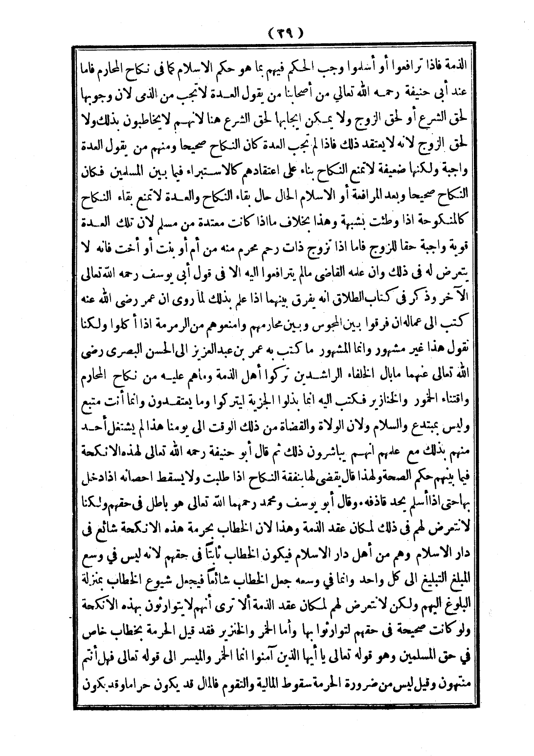 وَلِأَنَّ الْوُلَاةَ وَالْقُضَاةَ مِنْ ذَلِكَ الْوَقْتِ إلَى يَوْمِنَا هَذَا لَمْ يَشْتَغِلْ أَحَدٌ مِنْهُمْ بِذَلِكَ مَعَ عِلْمِهِمْ أَنَّهُمْ يُبَاشِرُونَ ذَلِكَ ثُمَّ قَالَ أَبُو حَنِيفَةَ - رَحِمَهُ اللَّهُ تَعَالَى -: لِهَذِهِ الْأَنْكِحَةِ فِيمَا بَيْنَهُمْ حُكْمُ الصِّحَّةِ، وَلِهَذَا قَالَ: يُقْضَى لَهَا بِنَفَقَةِ النِّكَاحِ إذَا طَلَبَتْ، وَلَا يَسْقُطُ إحْصَانُهُ إذَا دَخَلَ بِهَا حَتَّى إذَا أَسْلَمَ يُحَدُّ قَاذِفُهُ، وَقَالَ أَبُو يُوسُفَ وَمُحَمَّدٌ - رَحِمَهُ اللَّهُ تَعَالَى -: هُوَ بَاطِلٌ فِي حَقِّهِمْ، وَلَكِنَّا لَا نَتَعَرَّضُ لَهُمْ فِي ذَلِكَ؛ لِمَكَانِ عَقْدِ الذِّمَّةِ، وَهَذَا لِأَنَّ الْخِطَابَ بِحُرْمَةِ هَذِهِ الْأَنْكِحَةِ شَائِعٌ فِي دَارِ الْإِسْلَامِ، وَهُمْ مِنْ أَهْلِ دَارِ الْإِسْلَامِ فَيَكُونُ الْخِطَابُ ثَابِتًا فِي حَقِّهِمْ؛ لِأَنَّهُ لَيْسَ فِي وُسْعِ الْمُبَلِّغِ التَّبْلِيغُ إلَى كُلِّ وَاحِدٍ، وَإِنَّمَا فِي وُسْعِهِ جَعْلُ الْخِطَابِ شَائِعًا فَيُجْعَلُ شُيُوعُ الْخِطَابِ بِمَنْزِلَةِ الْبُلُوغِ إلَيْهِمْ، وَلَكِنْ لَا نَتَعَرَّضُ لَهُمْ؛ لِمَكَانِ عَقْدِ الذِّمَّةِ أَلَا تَرَى أَنَّهُمْ لَا يَتَوَارَثُونَ بِهَذِهِ الْأَنْكِحَةِ، وَلَوْ كَانَتْ صَحِيحَةً فِي حَقِّهِمْ لَتَوَارَثُوا بِهَا، وَأَمَّا الْخَمْرُ وَالْخِنْزِيرُ فَقَدْ قِيلَ: الْحُرْمَةُ بِخِطَابٍ خَاصٍّ فِي حَقِّ الْمُسْلِمِينَ، وَهُوَ قَوْله تَعَالَى {يَا أَيُّهَا الَّذِينَ آمَنُوا إنَّمَا الْخَمْرُ وَالْمَيْسِرُ} [المائدة: 90] إلَى قَوْله تَعَالَى {فَهَلْ أَنْتُمْ مُنْتَهُونَ} [المائدة: 91]، وَقِيلَ: لَيْسَ مِنْ ضَرُورَةِ الْحُرْمَةِ سُقُوطُ الْمَالِيَّةِ وَالتَّقَوُّمِ، فَالْمَالُ قَدْ يَكُونُ حَرَامًا، وَقَدْ يَكُونُ