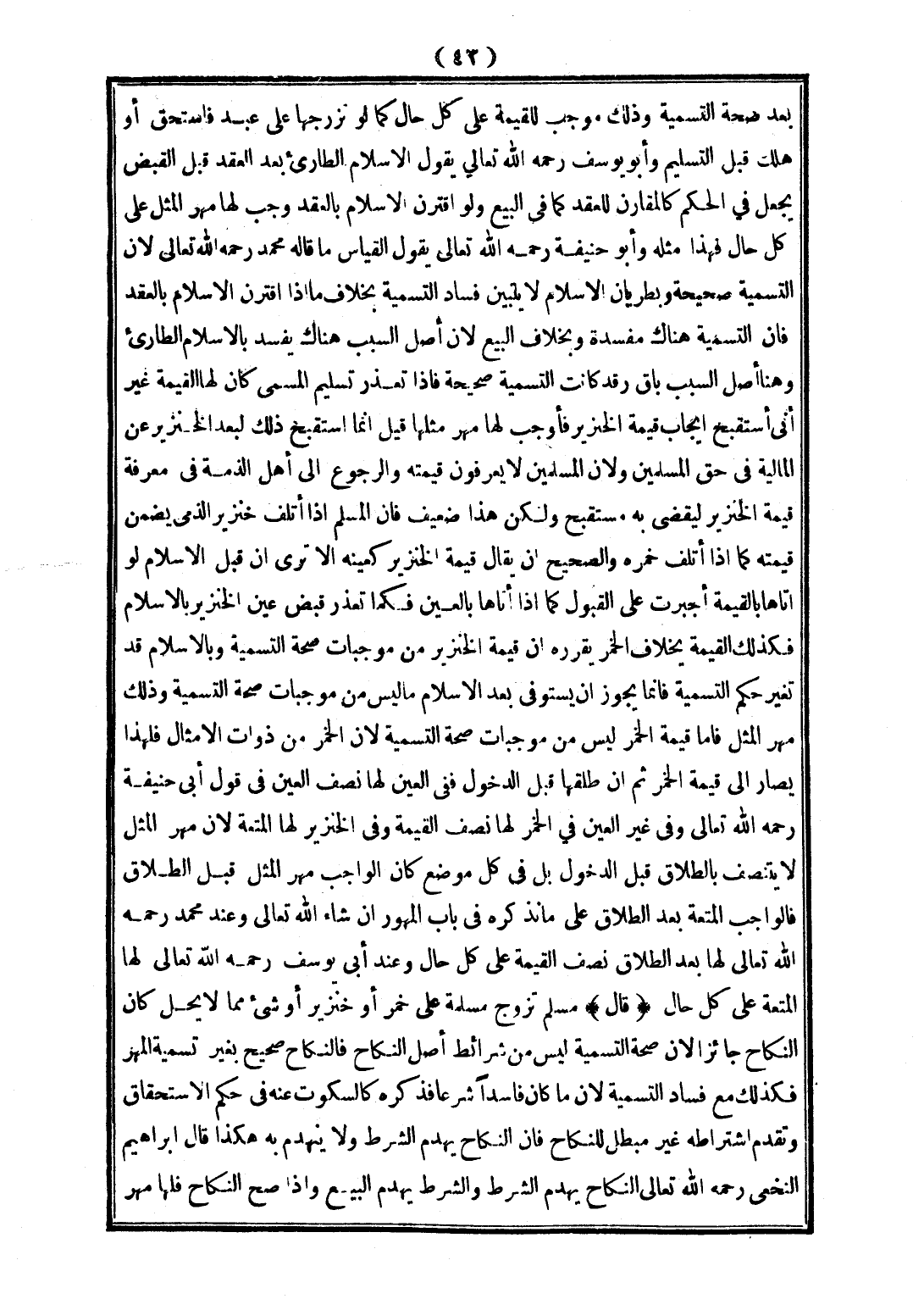 يُقَرِّرُهُ: أَنَّ قِيمَةَ الْخِنْزِيرِ مِنْ مُوجِبَاتِ صِحَّةِ التَّسْمِيَةِ، وَبِالْإِسْلَامِ قَدْ تَغَيَّرَ حُكْمُ التَّسْمِيَةِ فَإِنَّمَا يَجُوزُ أَنْ يُسْتَوْفَى بَعْدَ الْإِسْلَامِ مَا لَيْسَ مِنْ مُوجِبَاتِ صِحَّةِ التَّسْمِيَةِ، وَذَلِكَ مَهْرُ الْمِثْلِ فَأَمَّا قِيمَةُ الْخَمْرِ لَيْسَ مِنْ مُوجِبَاتِ صِحَّةِ التَّسْمِيَةِ؛ لِأَنَّ الْخَمْرَ مِنْ ذَوَاتِ الْأَمْثَالِ فَلِهَذَا يُصَارُ إلَى قِيمَةِ الْخَمْرِ ثُمَّ إنْ طَلَّقَهَا قَبْلَ الدُّخُولِ فَفِي الْعَيْنِ لَهَا نِصْفُ الْعَيْنِ فِي قَوْلِ أَبِي حَنِيفَةَ - رَحِمَهُ اللَّهُ تَعَالَى -، وَفِي غَيْرِ الْعَيْنِ فِي الْخَمْرِ لَهَا نِصْفُ الْقِيمَةِ، وَفِي الْخِنْزِيرِ لَهَا الْمُتْعَةُ؛ لِأَنَّ مَهْرَ الْمِثْلِ لَا يَتَنَصَّفُ بِالطَّلَاقِ قَبْلَ الدُّخُولِ بَلْ فِي كُلِّ مَوْضِعٍ كَانَ الْوَاجِبُ مَهْرَ الْمِثْلِ قَبْلَ الطَّلَاقِ، فَالْوَاجِبُ الْمُتْعَةُ بَعْدَ الطَّلَاقِ عَلَى مَا نَذْكُرُهُ فِي بَابِ الْمُهُورِ إنْ شَاءَ اللَّهُ تَعَالَى، وَعِنْدَ مُحَمَّدٍ - رَحِمَهُ اللَّهُ تَعَالَى - لَهَا بَعْدَ الطَّلَاقِ نِصْفُ الْقِيمَةِ عَلَى كُلِّ حَالٍ، وَعِنْدَ أَبِي يُوسُفَ - رَحِمَهُ اللَّهُ تَعَالَى - لَهَا الْمُتْعَةُ عَلَى كُلِّ حَالٍ