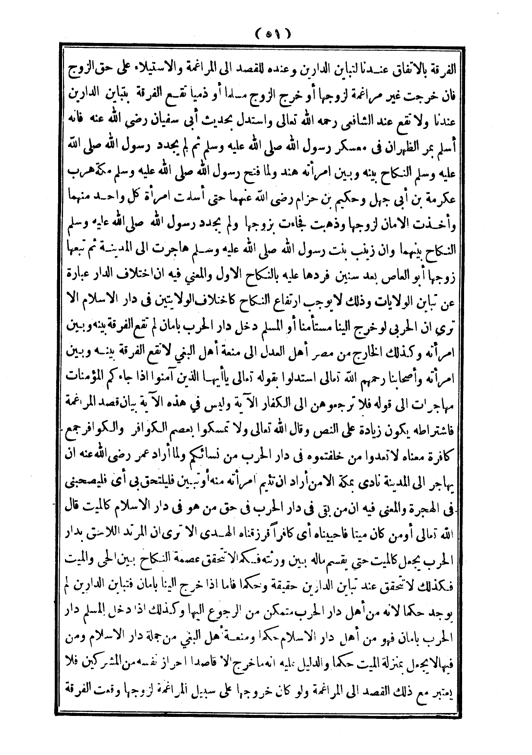 وَعِنْدَهُ لِلْقَصْدِ إلَى الْمُرَاغَمَةِ وَالِاسْتِيلَاءِ عَلَى حَقِّ الزَّوْجِ فَإِنْ خَرَجَتْ غَيْرَ مُرَاغِمَةٍ لِزَوْجِهَا أَوْ خَرَجَ الزَّوْجُ مُسْلِمًا أَوْ ذِمِّيًّا تَقَعُ الْفُرْقَةُ بِتَبَايُنِ الدَّارَيْنِ عِنْدَنَا، وَلَا تَقَعُ عِنْدَ الشَّافِعِيِّ - رَحِمَهُ اللَّهُ تَعَالَى -، وَاسْتَدَلَّ بِحَدِيثِ أَبِي سُفْيَانَ - رَضِيَ اللَّهُ عَنْهُ - «فَإِنَّهُ أَسْلَمَ بِمَرِّ الظَّهْرَانِ فِي مُعَسْكَرِ رَسُولِ اللَّهِ - صَلَّى اللَّهُ عَلَيْهِ وَسَلَّمَ - ثُمَّ لَمْ يُجَدِّدْ رَسُولُ اللَّهِ - صَلَّى اللَّهُ عَلَيْهِ وَسَلَّمَ - النِّكَاحَ بَيْنَهُ وَبَيْنَ امْرَأَتِهِ هِنْدُ، وَلَمَّا فَتَحَ رَسُولُ اللَّهِ - صَلَّى اللَّهُ عَلَيْهِ وَسَلَّمَ - مَكَّةَ هَرَبَ عِكْرِمَةُ بْنُ أَبِي جَهْلٍ وَحَكِيمُ بْنُ حِزَامٍ - رَضِيَ اللَّهُ عَنْهُمَا - حَتَّى أَسْلَمَتْ امْرَأَةُ كُلِّ وَاحِدٍ مِنْهُمَا، وَأَخَذَتْ الْأَمَانَ لِزَوْجِهَا، وَذَهَبَتْ فَجَاءَتْ بِزَوْجِهَا، وَلَمْ يُجَدِّدْ رَسُولُ اللَّهِ - صَلَّى اللَّهُ عَلَيْهِ وَسَلَّمَ - النِّكَاحَ بَيْنَهُمَا، وَإِنَّ زَيْنَبَ بِنْتَ رَسُولِ اللَّهِ - صَلَّى اللَّهُ عَلَيْهِ وَسَلَّمَ - هَاجَرَتْ إلَى الْمَدِينَةِ ثُمَّ تَبِعَهَا زَوْجُهَا أَبُو الْعَاصِ بَعْدَ سِنِينَ فَرَدَّهَا عَلَيْهِ بِالنِّكَاحِ الْأَوَّلِ»، وَالْمَعْنَى فِيهِ أَنَّ اخْتِلَافَ الدَّارِ عِبَارَةٌ عَنْ تَبَايُنِ الْوِلَايَاتِ، وَذَلِكَ لَا يُوجِبُ ارْتِفَاعَ النِّكَاحِ كَاخْتِلَافِ الْوِلَايَتَيْنِ فِي دَارِ الْإِسْلَامِ، أَلَا تَرَى أَنَّ الْحَرْبِيَّ لَوْ خَرَجَ إلَيْنَا مُسْتَأْمَنًا، أَوْ الْمُسْلِمَ دَخَلَ دَارَ الْحَرْبِ بِأَمَانٍ لَمْ تَقَعْ الْفُرْقَةُ بَيْنَهُ وَبَيْنَ امْرَأَتِهِ، وَكَذَلِكَ الْخَارِجُ مِنْ مِصْرِ أَهْلِ الْعَدْلِ إلَى مَنَعَةِ أَهْلِ الْبَغْيِ لَا تَقَعُ الْفُرْقَةُ بَيْنَهُ وَبَيْنَ امْرَأَتِهِ، وَأَصْحَابُنَا رَحِمَهُمْ اللَّهُ تَعَالَى اسْتَدَلُّوا بِقَوْلِهِ تَعَالَى: {يَا أَيُّهَا الَّذِينَ آمَنُوا إذَا جَاءَكُمْ الْمُؤْمِنَاتُ مُهَاجِرَاتٍ} [الممتحنة: 10] إلَى قَوْلِهِ {فَلَا تَرْجِعُوهُنَّ إلَى الْكُفَّارِ} [الممتحنة: 10]، وَلَيْسَ فِي هَذِهِ الْآيَةِ بَيَانُ قَصْدِ الْمُرَاغَمَةِ فَاشْتِرَاطُهُ يَكُونُ زِيَادَةً عَلَى النَّصِّ، وَقَالَ تَعَالَى: {وَلَا تُمْسِكُوا بِعِصَمِ الْكَوَافِرِ} [الممتحنة: 10].