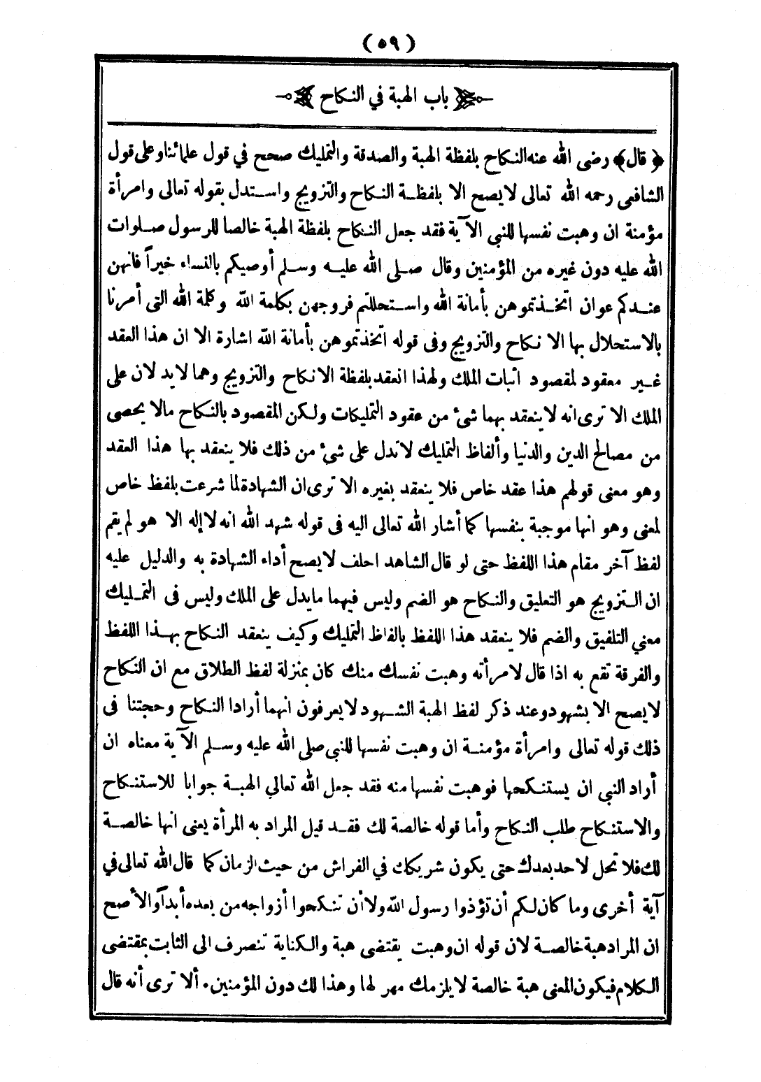 (قَالَ:) - رَضِيَ اللَّهُ عَنْهُ - النِّكَاحُ بِلَفْظَةِ الْهِبَةِ وَالصَّدَقَةِ وَالتَّمْلِيكِ صُحِّحَ فِي قَوْلِ عُلَمَائِنَا، وَعَلَى قَوْلِ الشَّافِعِيِّ - رَحِمَهُ اللَّهُ تَعَالَى -: لَا يَصِحُّ إلَّا بِلَفْظَةِ النِّكَاحِ وَالتَّزْوِيجِ، وَاسْتَدَلَّ بِقَوْلِهِ تَعَالَى: {وَامْرَأَةً مُؤْمِنَةً إنْ وَهَبَتْ نَفْسَهَا لِلنَّبِيِّ} [الأحزاب: 50] فَقَدْ جَعَلَ النِّكَاحَ بِلَفْظَةِ الْهِبَةِ خَالِصًا لِلرَّسُولِ صَلَوَاتُ اللَّهِ عَلَيْه دُونَ غَيْرِهِ مِنْ الْمُؤْمِنِينَ، وَقَالَ: - صَلَّى اللَّهُ عَلَيْهِ وَسَلَّمَ - «أُوصِيكُمْ بِالنِّسَاءِ خَيْرًا فَإِنَّهُنَّ عِنْدَكُمْ عَوَانٌ اتَّخَذْتُمُوهُنَّ بِأَمَانَةِ اللَّهِ وَاسْتَحْلَلْتُمْ فُرُوجَهُنَّ بِكَلِمَةِ اللَّهِ»، وَكَلِمَةُ اللَّهِ الَّتِي أُمِرْنَا بِالِاسْتِحْلَالِ بِهَا: الْإِنْكَاحُ وَالتَّزْوِيجُ، وَفِي قَوْلِهِ: «اتَّخَذْتُمُوهُنَّ بِأَمَانَةِ اللَّهِ» إشَارَةٌ إلَى أَنَّ هَذَا الْعَقْدَ غَيْرُ مَعْقُودٍ لِمَقْصُودِ إثْبَاتِ الْمِلْكِ، وَلِهَذَا انْعَقَدَ بِلَفْظَةِ الْإِنْكَاحِ وَالتَّزْوِيجِ، وَهُمَا لَا يَدُلَّانِ عَلَى الْمِلْكِ، أَلَا تَرَى أَنَّهُ لَا يَنْعَقِدُ بِهِمَا شَيْءٌ مِنْ عُقُودِ التَّمْلِيكَاتِ، وَلَكِنَّ الْمَقْصُودَ بِالنِّكَاحِ مَا لَا يُحْصَى مِنْ مَصَالِحِ الدِّينِ وَالدُّنْيَا، وَأَلْفَاظُ التَّمْلِيكِ لَا تَدُلُّ عَلَى شَيْءٍ مِنْ ذَلِكَ فَلَا يَنْعَقِدُ بِهَا هَذَا الْعَقْدُ، وَهُوَ مَعْنَى قَوْلِهِمْ هَذَا عَقْدٌ خَاصٌّ فَلَا يَنْعَقِدُ بِغَيْرِهِ، أَلَا تَرَى أَنَّ الشَّهَادَةَ لَمَّا شُرِعَتْ بِلَفْظٍ خَاصٍّ لِمَعْنًى، وَهُوَ أَنَّهَا مُوجِبَةٌ بِنَفْسِهَا كَمَا أَشَارَ اللَّهُ تَعَالَى إلَيْهِ فِي قَوْلِهِ: {شَهِدَ اللَّهُ أَنَّهُ لَا إلَهَ إلَّا هُوَ} [آل عمران: 18] لَمْ يَقُمْ لَفْظٌ آخَرُ مَقَامَ هَذَا اللَّفْظِ حَتَّى لَوْ قَالَ الشَّاهِدُ: أَحْلِفُ؛ لَا يَصِحُّ أَدَاءُ الشَّهَادَةِ بِهِ، وَالدَّلِيلُ عَلَيْهِ أَنَّ التَّزْوِيجَ هُوَ التَّعْلِيقُ، وَالنِّكَاحُ هُوَ الضَّمُّ، وَلَيْسَ فِيهِمَا مَا يَدُلُّ عَلَى الْمِلْكِ، وَلَيْسَ فِي التَّمْلِيكِ مَعْنَى التَّلْفِيقِ وَالضَّمِّ، فَلَا يَنْعَقِدُ هَذَا اللَّفْظُ بِأَلْفَاظِ التَّمْلِيكِ، وَكَيْفَ يَنْعَقِدُ النِّكَاحُ بِهَذَا اللَّفْظِ، وَالْفُرْقَةُ تَقَعُ بِهِ؟ إذَا قَالَ لِامْرَأَتِهِ: وَهَبْتُ نَفْسَكِ مِنْكِ كَانَ بِمَنْزِلَةِ لَفْظِ الطَّلَاقِ، مَعَ أَنَّ النِّكَاحَ لَا يَصِحُّ إلَّا بِشُهُودٍ، وَعِنْدَ ذِكْرِ لَفْظِ الْهِبَةِ الشُّهُودُ لَا يَعْرِفُونَ أَنَّهُمَا أَرَادَا النِّكَاحَ، وَحُجَّتُنَا فِي ذَلِكَ قَوْله تَعَالَى {وَامْرَأَةٌ مُؤْمِنَةٌ إنْ وَهَبَتْ نَفْسَهَا لِلنَّبِيِّ} [الأحزاب: 50]- صَلَّى اللَّهُ عَلَيْهِ وَسَلَّمَ - مَعْنَاهُ: إنْ أَرَادَ النَّبِيُّ أَنْ يَسْتَنْكِحَهَا فَوَهَبَتْ نَفْسَهَا مِنْهُ فَقَدْ جَعَلَ اللَّهُ تَعَالَى الْهِبَةَ جَوَابًا لِلِاسْتِنْكَاحِ، وَالِاسْتِنْكَاحُ طَلَبُ النِّكَاحِ، وَأَمَّا قَوْلُهُ: {خَالِصَةً لَك} [الأحزاب: 50] فَقَدْ قِيلَ: الْمُرَادُ بِهِ الْمَرْأَةُ يَعْنِي أَنَّهَا خَالِصَةٌ لَك فَلَا تَحِلُّ لِأَحَدٍ بَعْدَك حَتَّى يَكُونَ شَرِيكَك فِي الْفِرَاشِ مِنْ حَيْثُ الزَّمَانِ كَمَا قَالَ اللَّهُ تَعَالَى فِي آيَةٍ أُخْرَى: {وَمَا كَانَ لَكُمْ أَنْ تُؤْذُوا رَسُولَ اللَّهِ، وَلَا أَنْ تَنْكِحُوا أَزْوَاجَهُ مِنْ بَعْدِهِ أَبَدًا} [الأحزاب: 53]، وَالْأَصَحُّ أَنَّ الْمُرَادَ هِبَةٌ خَالِصَةٌ؛ لِأَنَّ قَوْلَهُ: {إنْ وَهَبَتْ} [الأحزاب: 50] يَقْتَضِي هِبَةً، وَالْكِنَايَةُ تَنْصَرِفُ إلَى الثَّابِتِ بِمُقْتَضَى الْكَلَامِ فَيَكُونُ الْمَعْنَى هِبَةً خَال