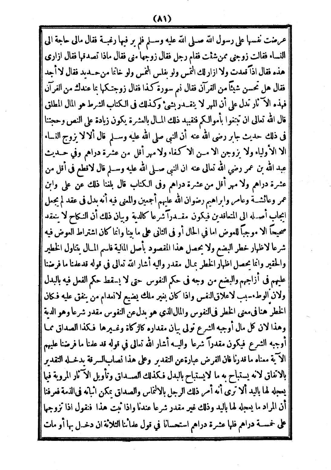 عَرَضَتْ نَفْسَهَا عَلَى رَسُولِ اللَّهِ - صَلَّى اللَّهُ عَلَيْهِ وَسَلَّمَ - فَلَمْ يَرَ فِيهَا رَغْبَةً فَقَالَ: مَالِي حَاجَةٌ إلَى النِّسَاءِ فَقَالَتْ: زَوِّجْنِي مِمَّنْ شِئْت فَقَامَ رَجُلٌ فَقَالَ: زَوِّجْهَا مِنِّي فَقَالَ: مَاذَا تُصْدِقُهَا؟ فَقَالَ: إزَارِي هَذِهِ فَقَالَ: إذًا قَعَدْتَ، وَلَا إزَارَ لَك الْتَمِسْ، وَلَوْ بِفَلْسٍ الْتَمِسْ وَلَوْ خَاتَمًا مِنْ حَدِيدٍ فَقَالَ: لَا أَجِدُ فَقَالَ: هَلْ تُحْسِنُ شَيْئًا مِنْ الْقُرْآنِ؟ فَقَالَ: نَعَمْ سُورَةُ كَذَا فَقَالَ: زَوَّجْتُكَهَا بِمَا عِنْدَك مِنْ الْقُرْآنِ» فَهَذِهِ الْآثَارُ تَدُلُّ عَلَى أَنَّ الْمَهْرَ لَا يَتَقَدَّرُ بِشَيْءٍ، وَكَذَلِكَ فِي الْكِتَابِ الشَّرْطُ هُوَ الْمَالُ الْمُطْلَقُ قَالَ اللَّهُ تَعَالَى: {أَنْ تَبْتَغُوا بِأَمْوَالِكُمْ} [النساء: 24] فَتَقْيِيدُ ذَلِكَ الْمَالِ بِالْعَشَرَةِ يَكُونُ زِيَادَةً عَلَى النَّصِّ، وَحُجَّتُنَا فِي ذَلِكَ حَدِيثُ جَابِرٍ - رَضِيَ اللَّهُ عَنْهُ - أَنَّ النَّبِيَّ - صَلَّى اللَّهُ عَلَيْهِ وَسَلَّمَ - قَالَ: «أَلَا لَا يُزَوِّجْ النِّسَاءَ إلَّا الْأَوْلِيَاءُ، وَلَا يُزَوَّجْنَ إلَّا مِنْ الْأَكْفَاءِ، وَلَا مَهْرَ أَقَلَّ مِنْ عَشَرَةِ دَرَاهِمَ»، وَفِي حَدِيثِ عَبْدِ اللَّهِ بْنِ عُمَرَ - رَضِيَ اللَّهُ عَنْهُ - أَنَّ النَّبِيَّ - صَلَّى اللَّهُ عَلَيْهِ وَسَلَّمَ - قَالَ: «لَا قَطْعَ فِي أَقَلَّ مِنْ عَشَرَةِ دَرَاهِمَ، وَلَا مَهْرَ أَقَلَّ مِنْ عَشَرَةِ دَرَاهِمَ»، وَفِي الْكِتَابِ قَالَ: بَلَغَنَا ذَلِكَ عَنْ عَلِيٍّ وَابْنِ عُمَرَ وَعَائِشَةَ وَعَامِرٍ وَإِبْرَاهِيمَ - رِضْوَانُ اللَّهِ عَلَيْهِمْ أَجْمَعِينَ -.
