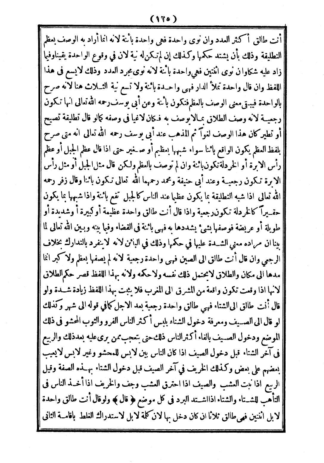 وَلَوْ قَالَ: أَنْتِ طَالِقٌ إلَى الشِّتَاءِ فَهِيَ طَالِقٌ وَاحِدَةً رَجْعِيَّةً بَعْدَ الْأَجَلِ كَمَا فِي إلَى شَهْرٍ، وَكَذَلِكَ لَوْ قَالَ: إلَى الصَّيْفِ، وَمَعْرِفَةُ دُخُولِ الشِّتَاءِ بِلُبْسِ أَكْثَرِ النَّاسِ الْفَرْوَ، وَالثَّوْبَ الْمَحْشُوَّ فِي ذَلِكَ الْمَوْضِعِ وَدُخُولِ الصَّيْفِ بِإِلْقَاءِ أَكْثَرِ النَّاسِ ذَلِكَ حَتَّى يَتَعَجَّبَ مِمَّنْ يُرَى عَلَيْهِ بَعْدَ ذَلِكَ، وَالرَّبِيعُ فِي آخِرِ الشِّتَاءِ قَبْلَ دُخُولِ الصَّيْفِ إذَا كَانَ النَّاسُ بَيْنَ لَابِسٍ لِلْمَحْشُوِّ، وَغَيْرِ لَابِسٍ لَا يَعِيبُ بَعْضُهُمْ عَلَى بَعْضٍ، وَكَذَلِكَ الْخَرِيفُ فِي آخِرِ الصَّيْفِ قَبْلَ دُخُولِ الشِّتَاءِ بِهَذِهِ الصِّفَةِ، وَقِيلَ: الرَّبِيعُ إذَا نَبَتَ الْعُشْبُ، وَالصَّيْفُ إذَا احْتَرَقَ الْعُشْبُ وَجَفَّ، وَالْخَرِيفُ إذَا أَخَذَ النَّاسُ فِي التَّأَهُّبِ لِلشِّتَاءِ، وَالشِّتَاءُ إذَا اشْتَدَّ الْبَرْدُ فِي كُلِّ مَوْضِعٍ.