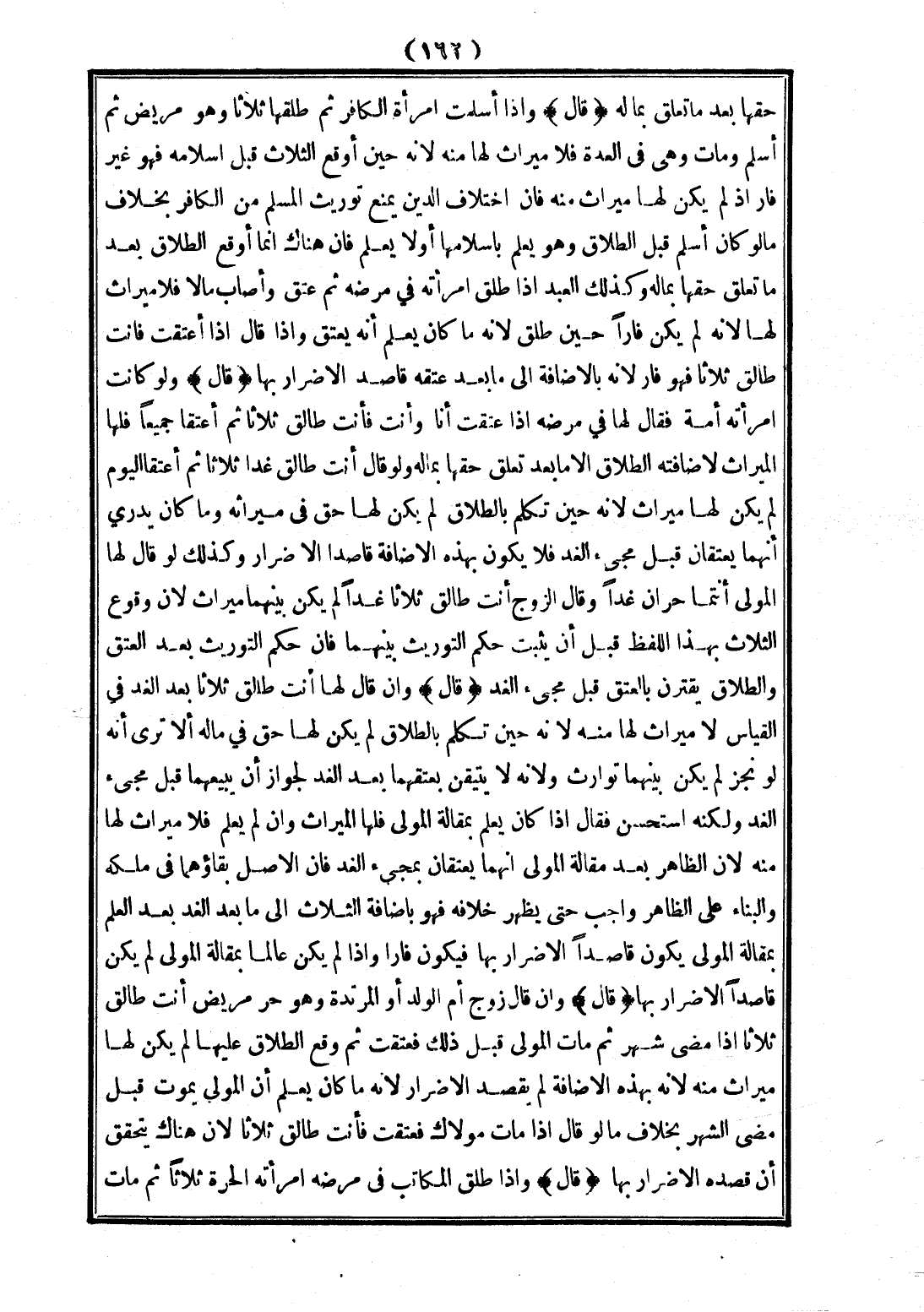 (قَالَ): وَإِذَا أَسْلَمَتْ امْرَأَةُ الْكَافِرِ، ثُمَّ طَلَّقَهَا ثَلَاثًا، وَهُوَ مَرِيضٌ، ثُمَّ أَسْلَمَ وَمَاتَ وَهِيَ فِي الْعِدَّةِ فَلَا مِيرَاثَ لَهَا مِنْهُ؛ لِأَنَّهُ حِينَ، أَوْقَعَ الثَّلَاثَ قَبْلَ إسْلَامِهِ فَهُوَ غَيْرُ فَارٍّ إذْ لَمْ يَكُنْ لَهَا مِيرَاثٌ مِنْهُ، فَإِنَّ اخْتِلَافَ الدِّينِ يَمْنَعُ تَوْرِيثَ الْمُسْلِمِ مِنْ الْكَافِرِ بِخِلَافِ مَا لَوْ كَانَ أَسْلَمَ قَبْلَ الطَّلَاقِ، وَهُوَ يَعْلَمُ بِإِسْلَامِهَا، أَوْ لَا يَعْلَمُ، فَإِنَّ هُنَاكَ إنَّمَا، أَوْقَعَ الطَّلَاقَ بَعْدَ مَا تَعَلَّقَ حَقُّهَا بِمَالِهِ وَكَذَلِكَ الْعَبْدُ إذَا طَلَّقَ امْرَأَتَهُ فِي مَرَضِهِ، ثُمَّ عَتَقَ وَأَصَابَ مَالًا فَلَا مِيرَاثَ لَهَا؛ لِأَنَّهُ لَمْ يَكُنْ فَارًّا حِينَ طَلَّقَ؛ لِأَنَّهُ مَا كَانَ يَعْلَمُ أَنَّهُ يَعْتِقُ، وَإِذَا قَالَ: إذَا أُعْتِقْتُ فَأَنْتِ طَالِقٌ ثَلَاثًا فَهُوَ فَارٌّ؛ لِأَنَّهُ بِالْإِضَافَةِ إلَى مَا بَعْدَ عِتْقِهِ قَاصِدٌ الْإِضْرَارَ بِهَا.