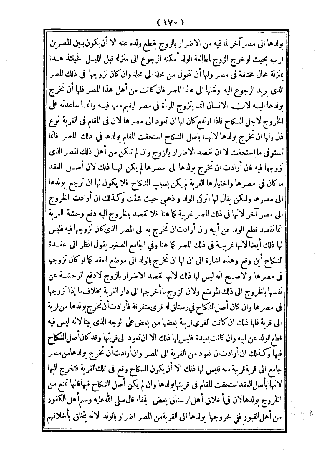 بِوَلَدِهَا إلَى مِصْرٍ آخَرَ؛ لِمَا فِيهِ مِنْ الْإِضْرَارِ بِالزَّوْجِ بِقَطْعِ وَلَدِهِ عَنْهُ إلَّا أَنْ يَكُونَ بَيْنَ الْمِصْرَيْنِ قُرْبٌ بِحَيْثُ لَوْ خَرَجَ الزَّوْجُ؛ لِمُطَالَعَةِ الْوَلَدِ أَمْكَنَهُ الرُّجُوعُ إلَى مَنْزِلِهِ قَبْلَ اللَّيْلِ، فَحِينَئِذٍ هَذَا بِمَنْزِلَةِ مَحَالَّ مُخْتَلِفَةٍ فِي مِصْرٍ، وَلَهَا أَنْ تَتَحَوَّلَ مِنْ مَحَلَّةٍ إلَى مَحَلَّةٍ، وَإِنْ كَانَ تَزَوَّجَهَا فِي ذَلِكَ الْمِصْرِ الَّذِي يُرِيدُ الرُّجُوعَ إلَيْهِ، وَنَقَلَهَا إلَى هَذَا الْمِصْرِ، فَإِنْ كَانَتْ مِنْ أَهْلِ هَذَا الْمِصْرِ، فَلَهَا أَنْ تَخْرُجَ بِوَلَدِهَا إلَيْهِ؛ لِأَنَّ الْإِنْسَانَ إنَّمَا يَتَزَوَّجُ الْمَرْأَةَ فِي مِصْرٍ؛ لِيُقِيمَ مَعَهَا فِيهِ، وَإِنَّمَا سَاعَدَتْهُ عَلَى الْخُرُوجِ؛ لِأَجْلِ النِّكَاحِ فَإِذَا ارْتَفَعَ كَانَ لَهَا أَنْ تَعُودَ إلَى مِصْرِهَا؛ لِأَنَّ فِي الْمُقَامِ فِي الْغُرْبَةِ نَوْعُ ذُلٍّ وَلَهَا أَنْ تَخْرُجَ بِوَلَدِهَا؛ لِأَنَّهَا بِأَصْلِ النِّكَاحِ اسْتَحَقَّتْ الْمُقَامَ بِوَلَدِهَا فِي ذَلِكَ الْمِصْرِ، فَإِنَّمَا تَسْتَوْفِي مَا اسْتَحَقَّتْ لَا أَنْ تَقْصِدَ الْإِضْرَارَ بِالزَّوْجِ، وَإِنْ لَمْ تَكُنْ مِنْ أَهْلِ ذَلِكَ الْمِصْرِ الَّذِي تَزَوَّجَهَا فِيهِ، فَإِنْ أَرَادَتْ أَنْ تَخْرُجَ بِوَلَدِهَا إلَى مِصْرِهَا لَمْ يَكُنْ لَهَا ذَلِكَ؛ لِأَنَّ أَصْلَ الْعَقْدِ مَا كَانَ فِي مِصْرِهَا، وَاخْتِيَارُهَا الْغُرْبَةَ لَمْ يَكُنْ بِسَبَبِ النِّكَاحِ، فَلَا يَكُونُ لَهَا أَنْ تَرْجِعَ بِوَلَدِهَا إلَى مِصْرِهَا، وَلَكِنْ يُقَالُ لَهَا: اُتْرُكِي الْوَلَدَ، وَاذْهَبِي حَيْثُ شِئْت، وَكَذَلِكَ إنْ أَرَادَتْ الْخُرُوجَ إلَى مِصْرٍ آخَرَ؛ لِأَنَّهَا فِي ذَلِكَ الْمِصْرِ غَرِيبَةٌ كَمَا هُنَا، فَلَا تَقْصِدُ بِالْخُرُوجِ إلَيْهِ دَفْعَ وَحْشَةِ الْغُرْبَةِ، إنَّمَا تَقْصِدُ قَطْعَ الْوَلَدِ عَنْ أَبِيهِ.