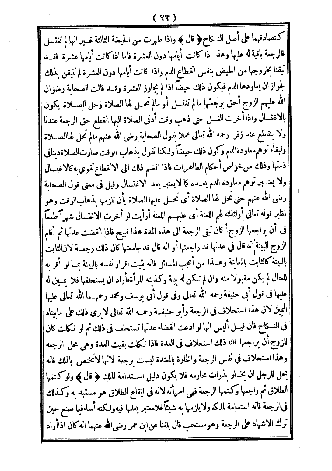 (قَالَ)، وَإِذَا طَهُرَتْ مِنْ الْحَيْضَةِ الثَّالِثَةِ غَيْرَ أَنَّهَا لَمْ تَغْتَسِلْ فَالرَّجْعَةُ بَاقِيَةٌ لَهُ عَلَيْهَا وَهَذَا إذَا كَانَتْ أَيَّامُهَا دُونَ الْعَشَرَةِ؛ فَأَمَّا إذَا كَانَتْ أَيَّامُهَا عَشَرَةً فَقَدْ تَيَقَّنَّا بِخُرُوجِهَا مِنْ الْحَيْضِ بِنَفْسِ انْقِطَاعِ الدَّمِ، وَإِذَا كَانَتْ أَيَّامُهَا دُونَ الْعَشَرَةِ لَمْ نَتَيَقَّنْ بِذَلِكَ لِجَوَازِ أَنْ يُعَاوِدَهَا الدَّمُ فَيَكُونَ ذَلِكَ حَيْضًا إذَا لَمْ يُجَاوِزْ الْعَشَرَةَ وَقَدْ قَالَتْ الصَّحَابَةُ - رِضْوَانُ اللَّهِ عَلَيْهِمْ - الزَّوْجُ أَحَقُّ بِرَجْعَتِهَا مَا لَمْ تَغْتَسِلْ أَوْ مَا لَمْ تَحِلَّ لَهَا الصَّلَاةُ وَحِلُّ الصَّلَاةِ يَكُونُ بِالِاغْتِسَالِ، وَإِذَا أَخَّرَتْ الْغُسْلَ حَتَّى ذَهَبَ وَقْتُ أَدْنَى الصَّلَاةِ إلَيْهَا انْقَطَعَ حَقُّ الرَّجْعَةِ عِنْدَنَا وَلَا يَنْقَطِعُ عِنْدَ زُفَرَ - رَحِمَهُ اللَّهُ تَعَالَى - عَمَلًا بِقَوْلِ الصَّحَابَةِ - رَضِيَ اللَّهُ عَنْهُمْ - مَا لَمْ تَحِلَّ لَهَا الصَّلَاةُ وَلِبَقَاءِ تَوَهُّمِ مُعَاوَدَةِ الدَّمِ وَكَوْنُ ذَلِكَ حَيْضًا وَلَكِنَّا نَقُولُ بِذَهَابِ الْوَقْتِ صَارَتْ الصَّلَاةُ دَيْنًا فِي ذِمَّتِهَا وَذَلِكَ مِنْ خَوَاصِّ أَحْكَامِ الطَّاهِرَاتِ فَإِذَا انْضَمَّ ذَلِكَ إلَى الِانْقِطَاعِ تَقْوَى بِهِ كَالِاغْتِسَالِ وَلَا يُعْتَبَرُ تَوَهُّمُ مُعَاوَدَةِ الدَّمِ بَعْدَهُ كَمَا لَا يُعْتَبَرُ بَعْدَ الِاغْتِسَالِ وَقِيلَ فِي مَعْنَى قَوْلِ الصَّحَابَةِ - رَضِيَ اللَّهُ عَنْهُمْ - حَتَّى تَحِلَّ لَهَا الصَّلَاةُ أَيْ تَحِلَّ عَلَيْهَا الصَّلَاةُ بِأَنْ تَلْزَمَهَا بِذَهَابِ الْوَقْتِ، وَهُوَ نَظِيرُ قَوْله تَعَالَى {أُولَئِكَ لَهُمْ اللَّعْنَةُ} [الرعد: 25] أَيْ عَلَيْهِمْ اللَّعْنَةُ أَرَأَيْت لَوْ أَخَّرَتْ الِاغْتِسَالَ شَهْرًا طَمَعًا فِي أَنْ يُرَاجِعَهَا الزَّوْجُ أَكَانَ تَبْقَى الرَّجْعَةُ إلَى هَذِهِ الْمُدَّةِ هَذَا قَبِيحٌ فَإِذَا انْقَضَتْ عِدَّتُهَا ثُمَّ أَقَامَ الزَّوْجُ الْبَيِّنَةَ أَنَّهُ قَالَ فِي عِدَّتِهَا قَدْ رَاجَعْتهَا أَوْ أَنَّهُ قَالَ قَدْ جَامَعْتهَا كَانَ ذَلِكَ رَجْعَةً لِأَنَّ الثَّابِتَ بِالْبَيِّنَةِ كَالثَّابِتِ بِالْمُعَايَنَةِ وَهَذَا مِنْ أَعْجَبِ الْمَسَائِلِ فَإِنَّهُ يُثْبِتُ إقْرَارَ نَفْسِهِ بِالْبَيِّنَةِ بِمَا لَوْ أَقَرَّ بِهِ لِلْحَالِّ لَمْ يَكُنْ مَقْبُولًا مِنْهُ وَإِنْ لَمْ تَكُنْ لَهُ بَيِّنَةٌ وَكَذَّبَتْهُ الْمَرْأَةُ فَأَرَادَ أَنْ يَسْتَحْلِفَهَا فَلَا يَمِينَ لَهُ عَلَيْهَا فِي قَوْلِ أَبِي حَنِيفَةَ - رَحِمَهُ اللَّهُ تَعَالَى -، وَفِي قَوْلِ أَبِي يُوسُفَ وَمُحَمَّدٍ رَحِمَهُمَا اللَّهُ تَعَالَى عَلَيْهَا الْيَمِينُ لِأَنَّ هَذَا اسْتِحْلَافٌ فِي الرَّجْعَةِ وَأَبُو حَنِيفَةَ - رَحِمَهُ اللَّهُ تَعَالَى - لَا يَرَى ذَلِكَ عَلَى مَا بَيَّنَّاهُ فِي النِّكَاحِ فَإِنْ قِيلَ أَلَيْسَ أَنَّهَا لَوْ ادَّعَتْ انْقِضَاءَ عِدَّتِهَا تُسْتَحْلَفُ فِي ذَلِكَ ثُمَّ لَوْ نَكَلَتْ كَانَ لِلزَّوْجِ أَنْ يُرَاجِعَهَا قُلْنَا ذَلِكَ اسْتِحْلَافٌ فِي الْعِدَّةِ فَإِذَا نَكَلَتْ بَقِيَتْ الْعِدَّةُ وَهِيَ مَحَلُّ الرَّجْعَةِ وَهَذَا اسْتِحْلَافٌ فِي نَفْسِ الرَّجْعَةِ وَالْخَلْوَةُ بِالْمُعْتَدَّةِ لَيْسَتْ بِرَجْعَةٍ لِأَنَّهَا لَا تَخْتَصُّ بِالْمِلْكِ فَإِنَّهُ يَحِلُّ لِلرَّجُلِ أَنْ يَخْلُوَ بِذَوَاتِ مَحَارِمِهِ فَلَا يَكُونُ دَلِيلَ اسْتِدَامَةِ الْمِلْكِ.