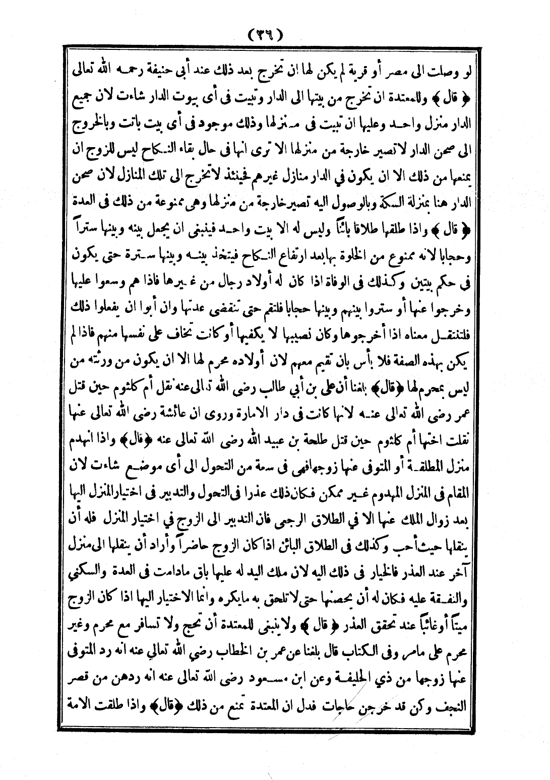(قَالَ) وَلَا يَنْبَغِي لِلْمُعْتَدَّةِ أَنْ تَحُجَّ وَلَا تُسَافِرَ مَعَ مَحْرَمٍ وَغَيْرِ مَحْرَمٍ عَلَى مَا مَرَّ، وَفِي الْكِتَابِ قَالَ بَلَغَنَا عَنْ عُمَرَ بْنِ الْخَطَّابِ - رَضِيَ اللَّهُ تَعَالَى عَنْهُ - أَنَّهُ رَدَّ الْمُتَوَفَّى عَنْهَا زَوْجُهَا مِنْ ذِي الْحُلَيْفَةِ وَعَنْ ابْنِ مَسْعُودٍ - رَضِيَ اللَّهُ تَعَالَى عَنْهُ - أَنَّهُ رَدَّهُنَّ مِنْ قَصْرِ النَّجَفِ وَكُنَّ قَدْ خَرَجْنَ حَاجَّاتٍ فَدَلَّ أَنَّ الْمُعْتَدَّةَ تُمْنَعُ مِنْ ذَلِكَ.