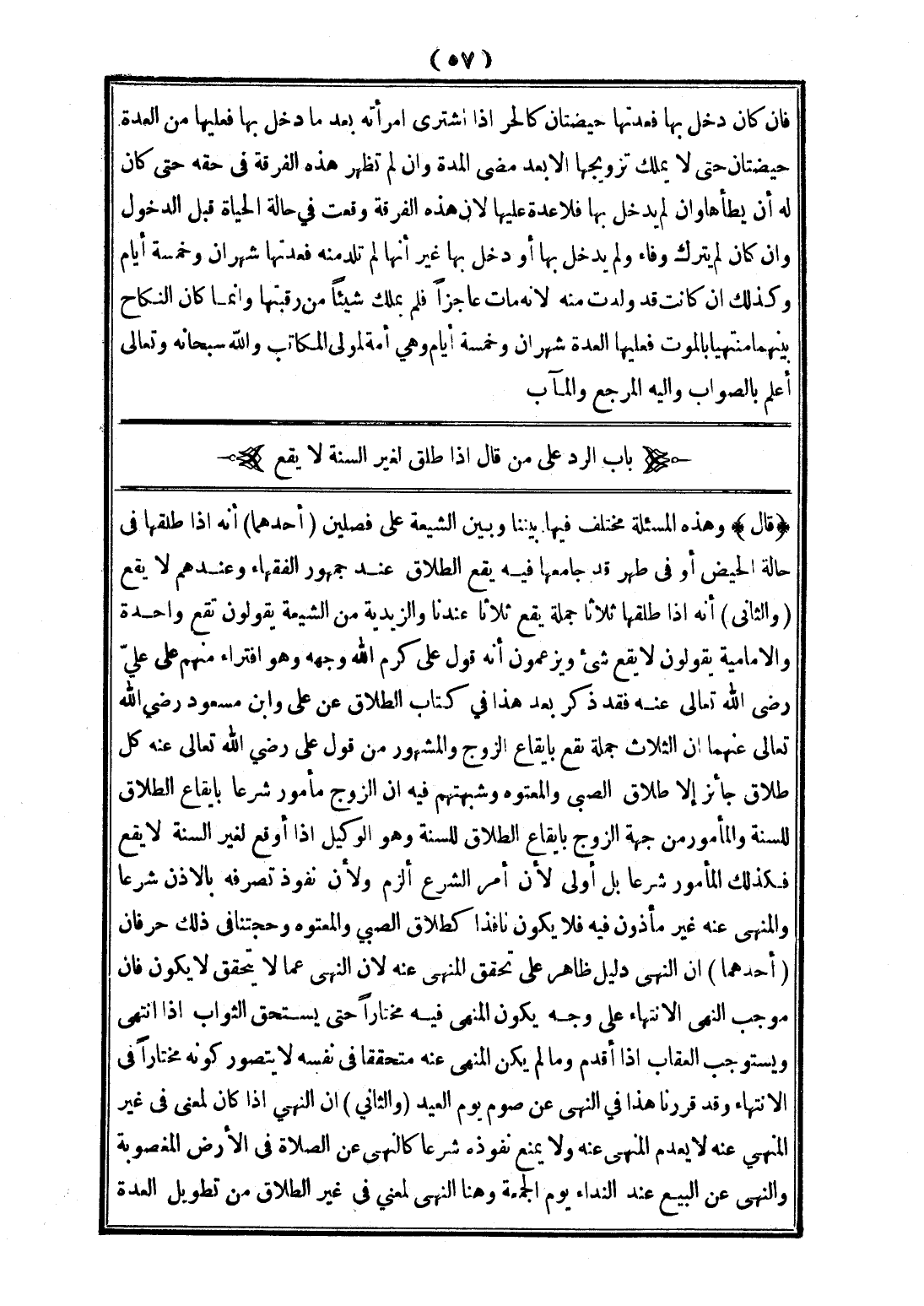 (قَالَ) وَهَذِهِ الْمَسْأَلَةُ مُخْتَلَفٌ فِيهَا بَيْنَنَا وَبَيْنَ الشِّيعَةِ عَلَى فَصْلَيْنِ (أَحَدُهُمَا) أَنَّهُ إذَا طَلَّقَهَا فِي حَالَةِ الْحَيْضِ أَوْ فِي طُهْرٍ قَدْ جَامَعَهَا فِيهِ يَقَعُ الطَّلَاقُ عِنْدَ جُمْهُورِ الْفُقَهَاءِ وَعِنْدَهُمْ لَا يَقَعُ (وَالثَّانِي) أَنَّهُ إذَا طَلَّقَهَا ثَلَاثًا جُمْلَةً يَقَعُ ثَلَاثًا عِنْدَنَا وَالزَّيْدِيَّةُ مِنْ الشِّيعَةِ يَقُولُونَ تَقَعُ وَاحِدَةً وَالْإِمَامِيَّةُ يَقُولُونَ لَا يَقَعُ شَيْءٌ وَيَزْعُمُونَ أَنَّهُ قَوْلُ عَلِيٍّ كَرَّمَ اللَّهُ وَجْهَهُ، وَهُوَ افْتِرَاءٌ مِنْهُمْ عَلَى عَلِيٍّ - رَضِيَ اللَّهُ تَعَالَى عَنْهُ - فَقَدْ ذَكَرَ بَعْدَ هَذَا فِي كِتَابِ الطَّلَاقِ عَنْ عَلِيٍّ وَابْنِ مَسْعُودٍ - رَضِيَ اللَّهُ تَعَالَى عَنْهُمَا - أَنَّ الثَّلَاثَ جُمْلَةً تَقَعُ بِإِيقَاعِ الزَّوْجِ وَالْمَشْهُورُ مِنْ قَوْلِ عَلِيٍّ - رَضِيَ اللَّهُ تَعَالَى عَنْهُ - كُلُّ طَلَاقٍ جَائِزٌ إلَّا طَلَاقَ الصَّبِيِّ وَالْمَعْتُوهِ وَشُبْهَتُهُمْ فِيهِ أَنَّ الزَّوْجَ مَأْمُورٌ شَرْعًا بِإِيقَاعِ الطَّلَاقِ لِلسُّنَّةِ وَالْمَأْمُورُ مِنْ جِهَةِ الزَّوْجِ بِإِيقَاعِ الطَّلَاقِ لِلسُّنَّةِ وَهُوَ الْوَكِيلُ إذَا أَوْقَعَ لِغَيْرِ السُّنَّةِ لَا يَقَعُ فَكَذَلِكَ الْمَأْمُورُ شَرْعًا بَلْ أَوْلَى لِأَنَّ أَمْرَ الشَّرْعِ أَلْزَمُ وَلِأَنَّ نُفُوذَ تَصَرُّفِهِ بِالْإِذْنِ شَرْعًا وَالْمَنْهِيُّ عَنْهُ غَيْرُ مَأْذُونٍ فِيهِ فَلَا يَكُونُ نَافِذًا كَطَلَاقِ الصَّبِيِّ وَالْمَعْتُوهِ.