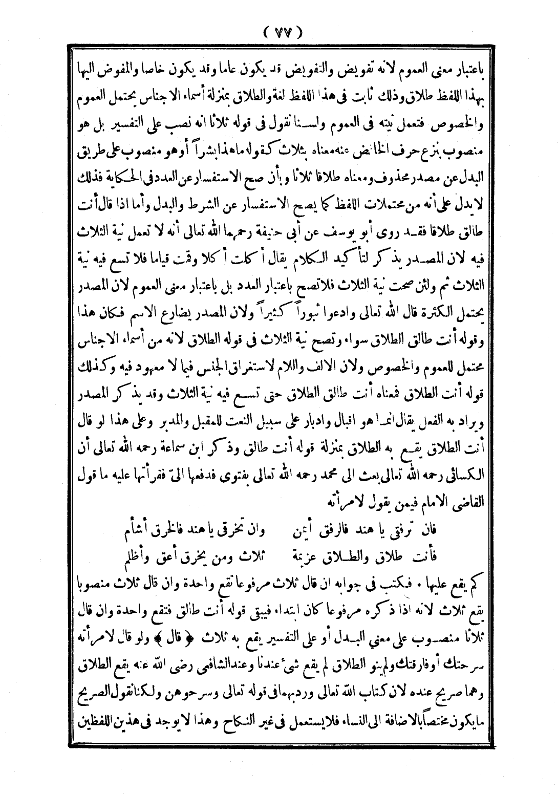 فَأَنْتِ طَلَاقٌ وَالطَّلَاقُ عَزِيمَةٌ ... ثَلَاثٌ وَمَنْ يَخْرِقْ أَعَقُّ وَأَظْلَمُ