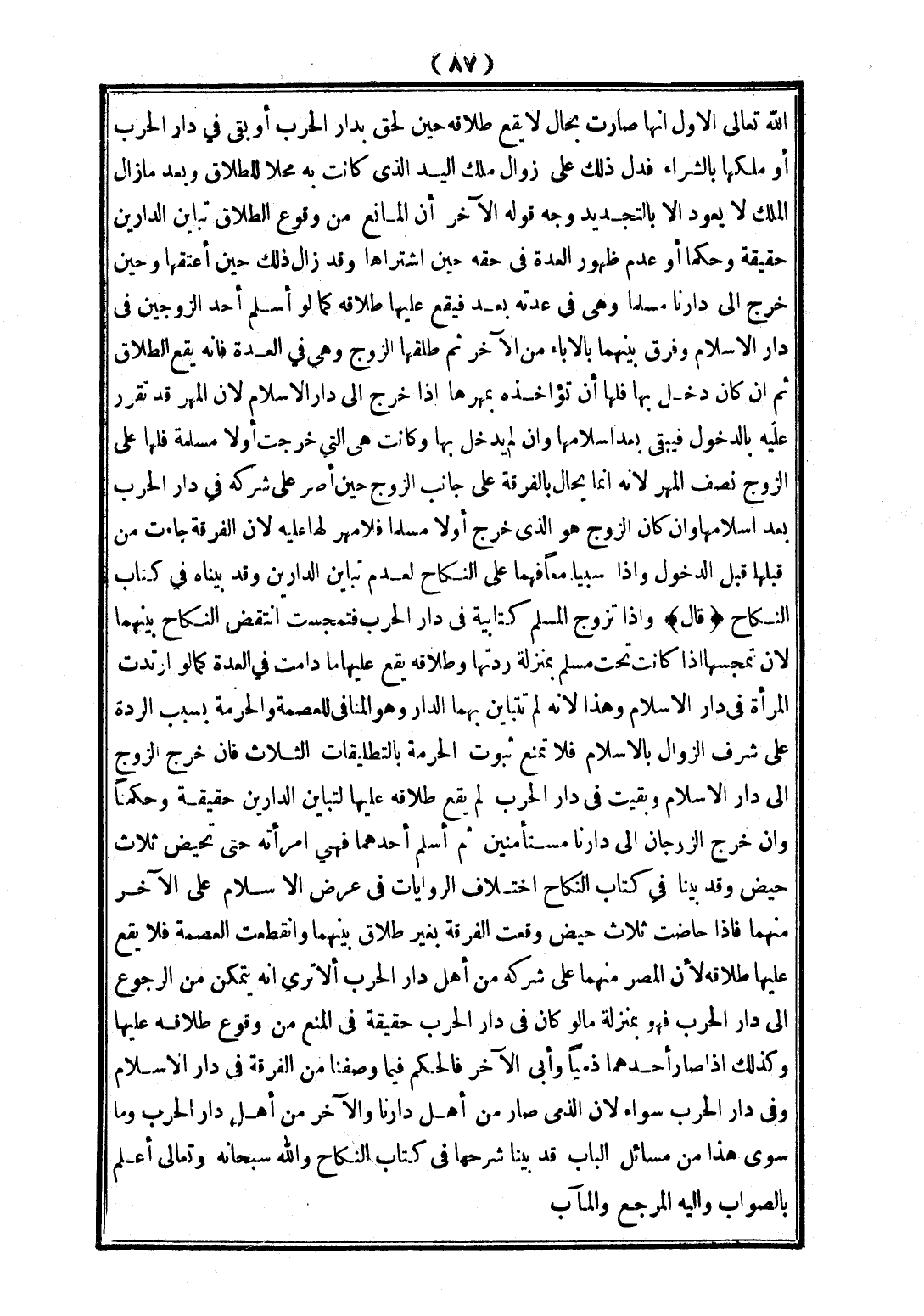 (قَالَ): وَإِذَا تَزَوَّجَ الْمُسْلِمُ كِتَابِيَّةً فِي دَارِ الْحَرْبِ فَتَمَجَّسَتْ، انْتَقَضَ النِّكَاحُ بَيْنَهُمَا؛ لِأَنَّ تَمَجُّسَهَا إذَا كَانَتْ تَحْتَ مُسْلِمٍ بِمَنْزِلَةِ رِدَّتِهَا، وَطَلَاقُهُ يَقَعُ عَلَيْهَا مَا دَامَتْ فِي الْعِدَّةِ كَمَا لَوْ ارْتَدَّتْ الْمَرْأَةُ فِي دَارِ الْإِسْلَامِ وَهَذَا؛ لِأَنَّهُ لَمْ تَتَبَايَنْ بِهِمَا الدَّارُ، وَهُوَ الْمُنَافِي لِلْعِصْمَةِ وَالْحُرْمَةِ بِسَبَبِ الرِّدَّةِ عَلَى شَرَفِ الزَّوَالِ بِالْإِسْلَامِ فَلَا تَمْنَعُ ثُبُوتَ الْحُرْمَةِ بِالتَّطْلِيقَاتِ الثَّلَاثِ فَإِنْ خَرَجَ الزَّوْجُ إلَى دَارِ الْإِسْلَامِ، وَبَقِيَتْ فِي دَارِ الْحَرْبِ، لَمْ يَقَعْ طَلَاقُهُ عَلَيْهَا؛ لِتَبَايُنِ الدَّارَيْنِ حَقِيقَةً وَحُكْمًا، وَإِنْ خَرَجَ الزَّوْجَانِ إلَى دَارِنَا مُسْتَأْمَنَيْنِ ثُمَّ أَسْلَمَ أَحَدُهُمَا، فَهِيَ امْرَأَتُهُ حَتَّى تَحِيضَ ثَلَاثَ حِيَضٍ، وَقَدْ بَيَّنَّا فِي كِتَابِ النِّكَاحِ اخْتِلَافَ الرِّوَايَاتِ فِي عَرْضِ الْإِسْلَامِ عَلَى الْآخَرِ مِنْهُمَا، فَإِذَا حَاضَتْ ثَلَاثَ حِيَضٍ، وَقَعَتْ الْفُرْقَةُ بِغَيْرِ طَلَاقٍ بَيْنَهُمَا، وَانْقَطَعَتْ الْعِصْمَةُ فَلَا يَقَعُ عَلَيْهَا طَلَاقُهُ؛ لِأَنَّ الْمُصِرَّ مِنْهُمَا عَلَى شِرْكِهِ مِنْ أَهْلِ دَارِ الْحَرْبِ أَلَا تَرَى أَنَّهُ يَتَمَكَّنُ مِنْ الرُّجُوعِ إلَى دَارِ الْحَرْبِ؟ فَهُوَ بِمَنْزِلَةِ مَا لَوْ كَانَ فِي دَارِ الْحَرْبِ حَقِيقَةً فِي الْمَنْعِ مِنْ وُقُوعِ طَلَاقِهِ عَلَيْهَا، وَكَذَلِكَ إذَا صَارَ أَحَدُهُمَا ذِمِّيًّا وَأَبَى الْآخَرُ، فَالْحُكْمُ فِيمَا وَصَفْنَا مِنْ الْفُرْقَةِ فِي دَارِ الْإِسْلَامِ وَفِي دَارِ الْحَرْبِ سَوَاءٌ؛ لِأَنَّ الذِّمِّيَّ صَارَ مِنْ أَهْلِ دَارِنَا، وَالْآخَرُ مِنْ أَهْلِ دَارِ الْحَرْبِ، وَمَا سِوَى هَذَا مِنْ مَسَائِلِ الْبَابِ قَدْ بَيَّنَّا شَرْحَهَا فِي كِتَابِ النِّكَاحِ وَاَللَّهُ سُبْحَانَهُ وَتَعَالَى أَعْلَمُ بِالصَّوَابِ وَإِلَيْهِ الْمَرْجِعُ وَالْمَآبُ.
