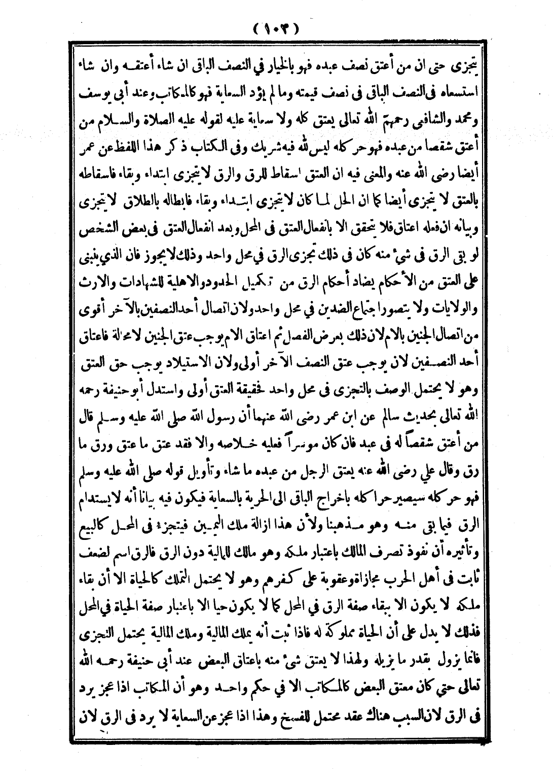 يَتَجَزَّأُ حَتَّى إنْ أَعْتَقَ نِصْفَ عَبْدِهِ فَهُوَ بِالْخِيَارِ فِي النِّصْفِ الْبَاقِي إنْ شَاءَ أَعْتَقَهُ، وَإِنْ شَاءَ اسْتَسْعَاهُ فِي النِّصْفِ الْبَاقِي فِي نِصْفِ قِيمَتِهِ، وَمَا لَمْ يُؤَدِّ السِّعَايَةَ فَهُوَ كَالْمُكَاتَبِ، وَعِنْدَ أَبِي يُوسُفَ وَمُحَمَّدٍ وَالشَّافِعِيِّ - رَحِمَهُمْ اللَّهُ تَعَالَى - يَعْتِقُ كُلُّهُ وَلَا سِعَايَةَ عَلَيْهِ لِقَوْلِهِ - عَلَيْهِ الصَّلَاةُ وَالسَّلَامُ -: «مَنْ أَعْتَقَ شِقْصًا مِنْ عَبْدِهِ فَهُوَ حُرٌّ كُلُّهُ لَيْسَ لِلَّهِ فِيهِ شَرِيكٌ»، وَفِي الْكِتَابِ ذُكِرَ هَذَا اللَّفْظُ عَنْ عُمَرَ أَيْضًا - رَضِيَ اللَّهُ عَنْهُ -، وَالْمَعْنَى فِيهِ أَنَّ الْعِتْقَ إسْقَاطٌ لِلرِّقِّ، وَالرِّقُّ لَا يَتَجَزَّأُ ابْتِدَاءً، وَبَقَاءً فَإِسْقَاطُهُ بِالْعِتْقِ لَا يَتَجَزَّأُ أَيْضًا كَمَا أَنَّ الْحِلَّ لَمَّا كَانَ لَا يَتَجَزَّأُ ابْتِدَاءً، وَبَقَاءً فَإِبْطَالُهُ بِالطَّلَاقِ لَا يَتَجَزَّأُ، وَبَيَانُهُ أَنَّ فِعْلَهُ إعْتَاقٌ فَلَا يَتَحَقَّقُ إلَّا بِانْفِعَالِ الْعِتْقِ فِي الْمَحَلِّ، وَبَعْدَ انْفِعَالِ الْعِتْقِ فِي بَعْضِ الشَّخْصِ لَوْ بَقِيَ الرِّقُّ فِي شَيْءٍ مِنْهُ كَانَ فِي ذَلِكَ تَجَزِّي الرِّقُّ فِي مَحَلٍّ وَاحِدٍ، وَذَلِكَ لَا يَجُوزُ فَإِنَّ الَّذِي يَنْبَنِي عَلَى الْعِتْقِ مِنْ الْأَحْكَامِ يُضَادَّ أَحْكَامَ الرِّقِّ مِنْ تَكْمِيلِ الْحُدُودِ، وَالْأَهْلِيَّةِ لِلشَّهَادَاتِ، وَالْإِرْثِ، وَالْوِلَايَاتِ وَلَا يُتَصَوَّرُ اجْتِمَاعُ الضِّدَّيْنِ فِي مَحَلٍّ وَاحِدٍ؛ وَلِأَنَّ اتِّصَالَ أَحَدِ النِّصْفَيْنِ بِالْآخَرِ أَقْوَى مِنْ اتِّصَالِ الْجَنِينِ بِالْأُمِّ؛ لِأَنَّ ذَلِكَ بِغَرَضِ الْفَصْلِ، ثُمَّ إعْتَاقُ الْأُمِّ يُوجِبُ عِتْقَ الْجَنِينِ لَا مَحَالَةَ فَإِعْتَاقُ أَحَدِ النِّصْفَيْنِ لَأَنْ يُوجِبَ عِتْقَ النِّصْفِ الْآخَرِ أَوْلَى؛ وَلِأَنَّ الِاسْتِيلَادَ يُوجِبُ حَقَّ الْعِتْقِ، وَهُوَ لَا يَحْتَمِلُ الْوَصْفَ بِالتَّجَزِّي فِي مَحَلٍّ وَاحِدٍ فَحَقِيقَةُ الْعِتْقِ أَوْلَى.