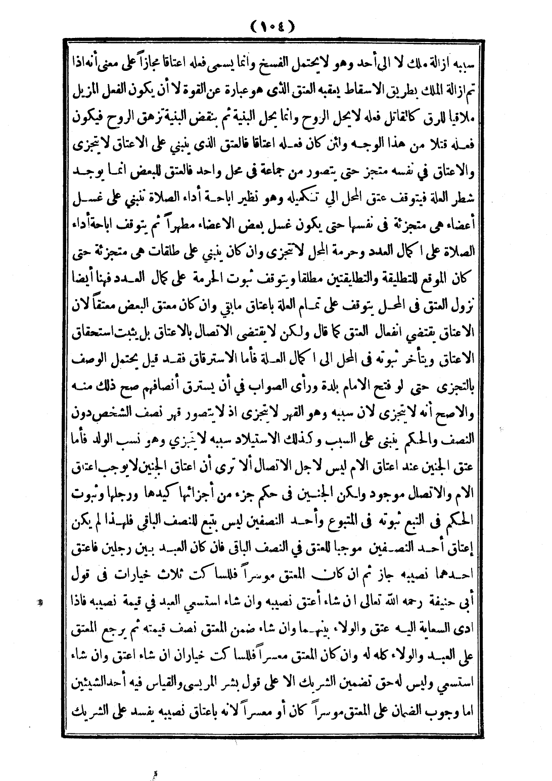 سَبَبَهُ إزَالَةُ مِلْكٍ لَا إلَى أَحَدٍ وَهُوَ لَا يَحْتَمِلُ الْفَسْخَ، وَإِنَّمَا يُسَمَّى فِعْلُهُ إعْتَاقًا مَجَازًا عَلَى مَعْنَى أَنَّهُ إذَا تَمَّ إزَالَةُ الْمِلْكِ بِطَرِيقِ الْإِسْقَاطِ يَعْقُبُهُ الْعِتْقُ الَّذِي هُوَ عِبَارَةٌ عَنْ الْقُوَّةِ لَا أَنْ يَكُونَ الْفِعْلُ الْمُزِيلُ مُلَاقِيًا لِلرِّقِّ، كَالْقَاتِلِ فِعْلُهُ لَا يَحِلُّ الرُّوحَ، وَإِنَّمَا يَحِلُّ الْبِنْيَةَ، ثُمَّ بِنَقْضِ الْبِنْيَةِ تُزْهَقُ الرُّوحُ فَيَكُونُ فِعْلُهُ قَتْلًا مِنْ هَذَا الْوَجْهِ، وَلَئِنْ كَانَ فِعْلُهُ إعْتَاقًا فَالْعِتْقُ الَّذِي يَنْبَنِي عَلَى الْإِعْتَاقِ لَا يَتَجَزَّأُ، وَالْإِعْتَاقُ فِي نَفْسِهِ مُنَجَّزٌ حَتَّى يُتَصَوَّرَ مِنْ جَمَاعَةٍ فِي مَحَلٍّ وَاحِدٍ فَالْعِتْقُ لِلْبَعْضِ إنَّمَا يُوجَدُ شَطْرُ الْعِلَّةِ فَيَتَوَقَّفُ عِتْقُ الْمَحَلِّ إلَى تَكْمِيلِهِ، وَهُوَ نَظِيرُ إبَاحَةِ أَدَاءِ الصَّلَاةِ تَنْبَنِي عَلَى غَسْلِ أَعْضَاءٍ هِيَ مُتَجَزِّئَةٌ فِي نَفْسِهَا حَتَّى يَكُونَ غُسْلُ بَعْضِ الْأَعْضَاءِ مُطَهِّرًا ثُمَّ يَتَوَقَّفُ إبَاحَةُ أَدَاءِ الصَّلَاةِ عَلَى إكْمَالِ الْعَدَدِ، وَحُرْمَةُ الْمَحَلِّ لَا تَتَجَزَّى، وَإِنْ كَانَ يَنْبَنِي عَلَى طَلْقَاتٍ هِيَ مُتَجَزِّئَةٌ حَتَّى كَانَ الْمُوَقِّعُ لِلتَّطْلِيقَةِ، وَالتَّطْلِيقَتَيْنِ مُطَلِّقًا، وَيَتَوَقَّفُ ثُبُوتُ الْحُرْمَةِ عَلَى كَمَالِ الْعَدَدِ، فَهُنَا أَيْضًا نُزُولُ الْعِتْقِ فِي الْمَحَلِّ يَتَوَقَّفُ عَلَى تَمَامِ الْعِلَّةِ بِإِعْتَاقِ مَا بَقِيَ، وَإِنْ كَانَ مُعْتَقُ الْبَعْضِ مُعْتَقًا؛ لِأَنَّ الْإِعْتَاقَ يَقْتَضِي انْفِعَالَ الْعِتْقِ كَمَا قَالَ، وَلَكِنْ لَا يَقْتَضِي الِاتِّصَالَ بِالْإِعْتَاقِ بَلْ يَثْبُتُ اسْتِحْقَاقُ الْإِعْتَاقِ، وَيَتَأَخَّرُ ثُبُوتُهُ فِي الْمَحَلِّ إلَى إكْمَالِ الْعِلَّةِ فَأَمَّا الِاسْتِرْقَاقُ فَقَدْ قِيلَ يَحْتَمِلُ الْوَصْفَ بِالتَّجَزِّي حَتَّى لَوْ فَتَحَ الْإِمَامُ بَلْدَةً، وَرَأَى الصَّوَابَ فِي أَنْ يَسْتَرِقَّ أَنْصَافَهُمْ صَحَّ ذَلِكَ مِنْهُ، وَالْأَصَحُّ أَنَّهُ لَا يَتَجَزَّأُ؛ لِأَنَّ سَبَبَهُ، وَهُوَ الْقَهْرُ لَا يَتَجَزَّأُ إذْ لَا يُتَصَوَّرُ قَهْرُ نِصْفِ الشَّخْصِ دُونَ النِّصْفِ، وَالْحُكْمُ يَنْبَنِي عَلَى السَّبَبِ، وَكَذَلِكَ الِاسْتِيلَادُ سَبَبُهُ لَا يَتَجَزَّأُ، وَهُوَ نَسَبُ الْوَلَدِ فَأَمَّا عِتْقُ الْجَنِينِ عِنْدَ إعْتَاقِ الْأُمِّ لَيْسَ لِأَجْلِ الِاتِّصَالِ، أَلَا تَرَى أَنَّ إعْتَاقَ الْجَنِينِ لَا يُوجِبُ إعْتَاقَ الْأُمِّ وَالِاتِّصَالُ مَوْجُودٌ، وَلَكِنَّ الْجَنِينَ فِي حُكْمِ جُزْءٍ مِنْ أَجْزَائِهَا كَيَدِهَا، وَرِجْلِهَا، وَثُبُوتُ الْحُكْمِ فِي التَّبَعِ ثُبُوتُهُ فِي الْمَتْبُوعِ وَأَحَدُ النِّصْفَيْنِ لَيْسَ بِتَبَعٍ لِلنِّصْفِ الْبَاقِي فَلِهَذَا لَمْ يَكُنْ إعْتَاقُ أَحَدِ النِّصْفَيْنِ مُوجِبًا لِلْعِتْقِ فِي النِّصْفِ الْبَاقِي.