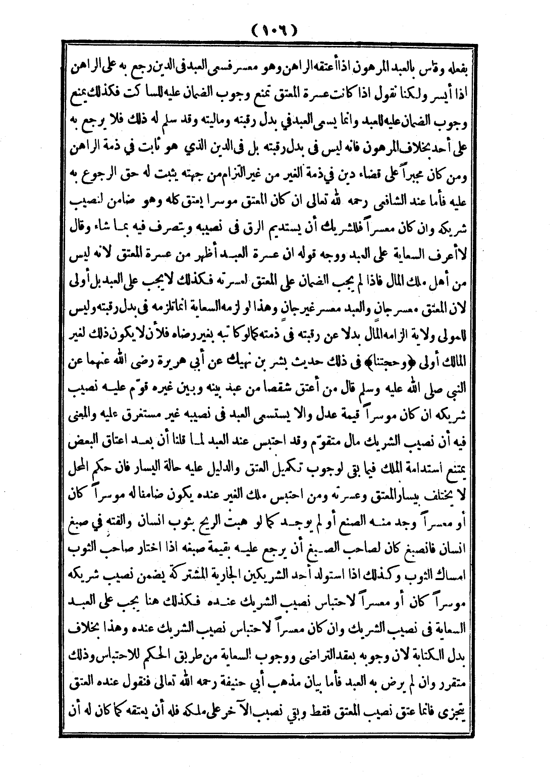 (وَحُجَّتُنَا) فِي ذَلِكَ حَدِيثُ بِشْرِ بْنِ نَهِيكٍ عَنْ أَبِي هُرَيْرَةَ - رَضِيَ اللَّهُ عَنْهُمَا - عَنْ النَّبِيِّ - صَلَّى اللَّهُ عَلَيْهِ وَسَلَّمَ - قَالَ: «مَنْ أَعْتَقَ شِقْصًا مِنْ عَبْدٍ بَيْنَهُ، وَبَيْنَ غَيْرِهِ قُوِّمَ عَلَيْهِ نَصِيبُ شَرِيكِهِ إنْ كَانَ مُوسِرًا قِيمَةَ عَدْلٍ، وَلَا يُسْتَسْعَى الْعَبْدُ فِي نَصِيبِهِ غَيْرَ مُسْتَغْرِقٍ عَلَيْهِ» وَالْمَعْنَى فِيهِ أَنَّ نَصِيبَ الشَّرِيكِ مَالٌ مُتَقَوِّمٌ، وَقَدْ اُحْتُبِسَ عِنْدَ الْعَبْدِ لِمَا قُلْنَا أَنَّ بَعْدَ إعْتَاقِ الْبَعْضِ يَمْتَنِعُ اسْتِدَامَةُ الْمِلْكِ فِيمَا بَقِيَ لِوُجُوبِ تَكْمِيلِ الْعِتْقِ، وَالدَّلِيلُ عَلَيْهِ حَالَةُ الْيَسَارِ فَإِنَّ حُكْمَ الْمَحَلِّ لَا يَخْتَلِفُ بِيَسَارِ الْمُعْتِقِ، وَعُسْرَتِهِ، وَمَنْ احْتَبَسَ مِلْكَ الْغَيْرِ عِنْدَهُ يَكُونُ ضَامِنًا لَهُ مُوسِرًا كَانَ، أَوْ مُعْسِرًا وُجِدَ مِنْهُ الصُّنْعُ، أَوْ لَمْ يُوجَدْ كَمَا لَوْ هَبَّتْ الرِّيحُ بِثَوْبِ إنْسَانٍ، وَأَلْقَتْهُ فِي صَبْغِ إنْسَانٍ فَانْصَبَغَ كَانَ لِصَاحِبِ الصَّبْغِ أَنْ يَرْجِعَ عَلَيْهِ بِقِيمَةِ صَبْغِهِ إذَا اخْتَارَ صَاحِبُ الثَّوْبِ إمْسَاكَ الثَّوْبِ، وَكَذَلِكَ إذَا اسْتَوْلَدَ أَحَدُ الشَّرِيكَيْنِ الْجَارِيَةَ الْمُشْتَرَكَةَ يَضْمَنُ نَصِيبَ شَرِيكِهِ مُوسِرًا كَانَ، أَوْ مُعْسِرًا لِاحْتِبَاسٍ نَصِيبِ الشَّرِيكِ عِنْدَهُ فَكَذَلِكَ هُنَا يَجِبُ عَلَى الْعَبْدِ السِّعَايَةُ فِي نَصِيبِ الشَّرِيكِ، وَإِنْ كَانَ مُعْسِرًا لِاحْتِبَاسِ نَصِيبِ الشَّرِيكِ عِنْدَهُ، وَهَذَا بِخِلَافِ بَدَلِ الْكِتَابَةِ؛ لِأَنَّ وُجُوبَهُ بِعَقْدِ التَّرَاضِي، وَوُجُوبَ السِّعَايَةِ مِنْ طَرِيقِ الْحُكْمِ لِلِاحْتِبَاسِ، وَذَلِكَ مُتَقَرِّرٌ، وَإِنْ لَمْ يَرْضَ بِهِ الْعَبْدُ فَأَمَّا بَيَانُ مَذْهَبِ أَبِي حَنِيفَةَ - رَحِمَهُ اللَّهُ تَعَالَى - فَنَقُولُ: عِنْدَهُ الْعِتْقُ يَتَجَزَّأُ فَإِنَّمَا عَتَقَ نَصِيبُ الْمُعْتِقِ فَقَطْ وَبَقِيَ نَصِيبُ الْآخَرِ عَلَى مِلْكِهِ فَلَهُ أَنْ يَعْتِقَهُ كَمَا كَانَ لَهُ أَنْ