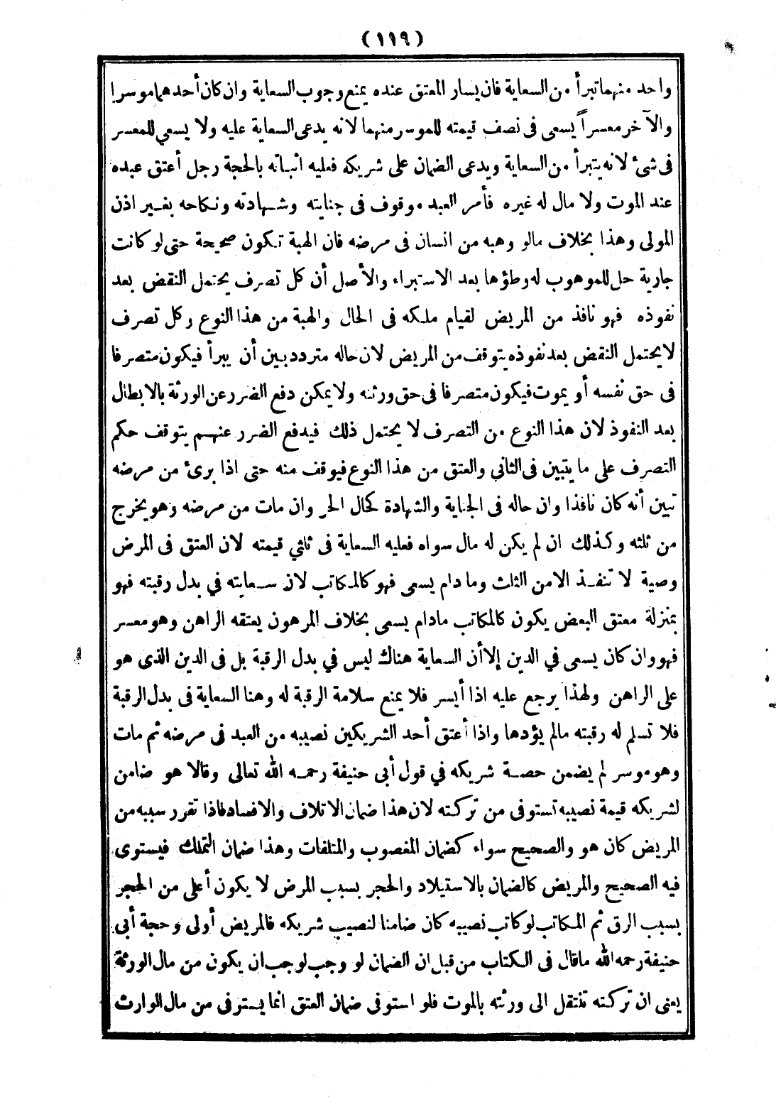 رَجُلٌ أَعْتَقَ عَبْدَهُ عِنْدَ الْمَوْتِ، وَلَا مَالَ لَهُ غَيْرُهُ فَأَمْرُ الْعَبْدِ مَوْقُوفٌ فِي جِنَايَتِهِ، وَشَهَادَتِهِ، وَنِكَاحِهِ بِغَيْرِ إذْنِ الْمَوْلَى وَهَذَا بِخِلَافِ مَا لَوْ، وَهَبَهُ مِنْ إنْسَانٍ فِي مَرَضِهِ فَإِنَّ الْهِبَةَ تَكُونُ صَحِيحَةً حَتَّى لَوْ كَانَتْ جَارِيَةً حَلَّ لِلْمَوْهُوبِ لَهُ وَطْؤُهَا بَعْدَ الِاسْتِبْرَاءِ، وَالْأَصْلُ أَنَّ كُلَّ تَصَرُّفٍ يَحْتَمِلُ النَّقْضَ بَعْدَ نُفُوذِهِ فَهُوَ نَافِذٌ مِنْ الْمَرِيضِ لِقِيَامِ مِلْكِهِ فِي الْحَالِ، وَالْهِبَةُ مِنْ هَذَا النَّوْعِ، وَكُلُّ تَصَرُّفٍ لَا يَحْتَمِلُ النَّقْضَ بَعْدَ نُفُوذِهِ يَتَوَقَّفُ مِنْ الْمَرِيضِ؛ لِأَنَّ مُتَرَدِّدٌ بَيْنَ أَنْ يَبْرَأَ فَيَكُونَ مُتَصَرِّفًا فِي حَقِّ نَفْسِهِ، أَوْ يَمُوتَ فَيَكُونَ مُتَصَرِّفًا فِي حَقِّ وَرَثَتِهِ، وَلَا يُمْكِنُ دَفْعُ الضَّرَرِ عَنْ الْوَرَثَةِ بِالْإِبْطَالِ بَعْدَ النُّفُوذِ؛ لِأَنَّ هَذَا النَّوْعَ مِنْ التَّصَرُّفِ لَا يَحْتَمِلُ ذَلِكَ فَيَدْفَعُ الضَّرَرَ عَنْهُمْ يَتَوَقَّفُ حُكْمُ التَّصَرُّفِ عَلَى مَا يَتَبَيَّنُ فِي الثَّانِي، وَالْعِتْقُ مِنْ هَذَا النَّوْعِ فَيُوقَفُ مِنْهُ حَتَّى إذَا بَرِئَ مِنْ مَرَضِهِ تَبَيَّنَ أَنَّهُ كَانَ نَافِذًا، وَأَنَّ فِي الْجِنَايَةِ، وَالشَّهَادَةِ كَحَالِ الْحُرِّ، وَإِنْ مَاتَ مِنْ مَرَضِهِ، وَهُوَ يَخْرُجُ مِنْ ثُلُثِهِ وَكَذَلِكَ إنْ لَمْ يَكُنْ لَهُ مَالٌ سِوَاهُ فَعَلَيْهِ السِّعَايَةُ فِي ثُلُثَيْ قِيمَتِهِ؛ لِأَنَّ الْعِتْقَ فِي الْمَرَضِ، وَصِيَّةٌ لَا تَنْفُذُ إلَّا مِنْ الثُّلُثِ، وَمَادَامَ يَسْعَى فَهُوَ كَالْمُكَاتَبِ؛ لِأَنَّ سِعَايَتَهُ فِي بَدَلِ رَقَبَتِهِ فَهُوَ بِمَنْزِلَةِ مُعْتَقِ الْبَعْضِ يَكُونُ كَالْمُكَاتَبِ مَادَامَ يَسْعَى بِخِلَافِ الْمَرْهُونِ يُعْتِقُهُ الرَّاهِنُ، وَهُوَ مُعْسِرٌ فَهُوَ وَإِنْ كَانَ يَسْعَى فِي الدَّيْنِ إلَّا أَنَّ السِّعَايَةَ هُنَاكَ لَيْسَ فِي بَدَلِ الرَّقَبَةِ بَلْ فِي الدَّيْنِ الَّذِي هُوَ عَلَى الرَّاهِنِ، وَلِهَذَا يَرْجِعُ عَلَيْهِ إذَا أَيْسَرَ فَلَا يَمْنَعُ سَلَامَةَ الرَّقَبَةِ لَهُ، وَهُنَا السِّعَايَةُ فِي بَدَلِ الرَّقَبَةِ فَلَا تَسْلَمُ لَهُ رَقَبَتُهُ مَا لَمْ يُؤَدِّهَا.