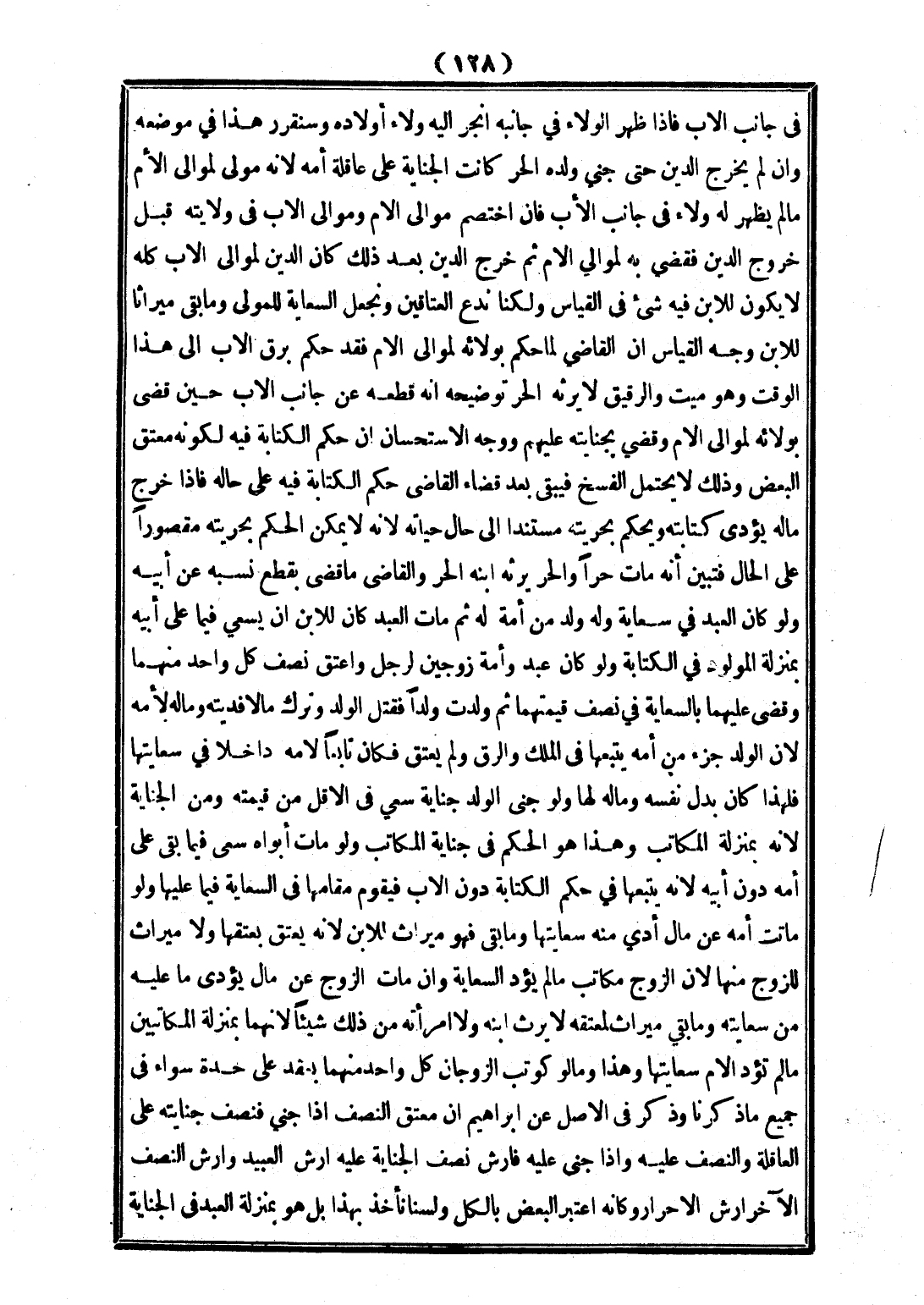فِي جَانِبِ الْأَبِ فَإِذَا ظَهَرَ الْوَلَاءُ فِي جَانِبِهِ انْجَرَّ إلَيْهِ وَلَاءُ أَوْلَادِهِ وَسَنُقَرِّرُ هَذَا فِي مَوْضِعِهِ، وَإِنْ لَمْ يَخْرُجْ الدَّيْنُ حَتَّى جَنَى وَلَدُهُ الْحُرُّ كَانَتْ الْجِنَايَةُ عَلَى عَاقِلَةِ أُمِّهِ لِأَنَّهُ مَوْلًى لِمَوَالِي الْأُمِّ مَا لَمْ يَظْهَرْ لَهُ وَلَاءٌ فِي جَانِبِ الْأَبِ، فَإِنْ اخْتَصَمَ مَوَالِي الْأُمِّ وَمَوَالِي الْأَبِ فِي وِلَايَتِهِ قَبْلَ خُرُوجِ الدَّيْنِ فَقُضِيَ بِهِ لِمَوَالِي الْأُمِّ ثُمَّ خَرَجَ الدَّيْنُ بَعْدَ ذَلِكَ كَانَ الدَّيْنُ لِمَوَالِي الْأَبِ كُلُّهُ لَا يَكُونُ لِلِابْنِ فِيهِ شَيْءٌ فِي الْقِيَاسِ، وَلَكِنَّا نَدَعُ الْعَتَاقَيْنِ وَنَجْعَلُ السِّعَايَةَ لِلْمَوْلَى وَمَا بَقِيَ مِيرَاثًا لِلِابْنِ. وَجْهُ الْقِيَاسِ أَنَّ الْقَاضِيَ لَمَّا حَكَمَ بِوَلَائِهِ لِمَوَالِي الْأُمِّ فَقَدْ حَكَمَ بِرِقِّ الْأَبِ إلَى هَذَا الْوَقْتِ وَهُوَ مَيِّتٌ وَالرَّقِيقُ لَا يَرِثُهُ الْحُرُّ. تَوْضِيحُهُ أَنَّهُ قَطَعَهُ عَنْ جَانِبِ الْأَبِ حِينَ قَضَى بِوَلَائِهِ لِمَوَالِي الْأُمِّ وَقَضَى بِجِنَايَتِهِ عَلَيْهِمْ، وَوَجْهُ الِاسْتِحْسَانِ أَنَّ حُكْمَ الْكِتَابَةِ فِيهِ لِكَوْنِهِ مُعْتَقَ الْبَعْضِ وَذَلِكَ لَا يَحْتَمِلُ الْفَسْخَ فَيَبْقَى بَعْدَ قَضَاءِ الْقَاضِي حُكْمُ الْكِتَابَةِ فِيهِ عَلَى حَالِهِ فَإِذَا خَرَجَ مَالُهُ يُؤَدِّي كِتَابَتَهُ وَيُحْكَمُ بِحُرِّيَّتِهِ مُسْتَنِدًا إلَى حَالِ حَيَاتِهِ لِأَنَّهُ لَا يُمْكِنُ الْحُكْمُ بِحُرِّيَّتِهِ مَقْصُورًا عَلَى الْحَالِ فَتَبَيَّنَ أَنَّهُ مَاتَ حُرًّا وَالْحُرُّ يَرِثُهُ ابْنُهُ الْحُرُّ وَالْقَاضِي مَا قَضَى بِقَطْعِ نَسَبِهِ عَنْ أَبِيهِ.