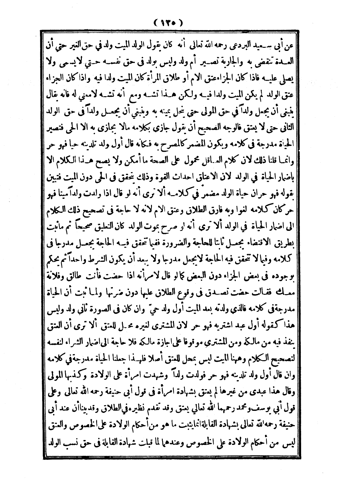 عَنْ أَبِي سَعِيدٍ الْبَرْدَعِيِّ - رَحِمَهُ اللَّهُ تَعَالَى - أَنَّهُ كَانَ يَقُولُ الْوَلَدُ الْمَيِّتُ وَلَدٌ فِي حَقِّ الْغَيْرِ حَتَّى أَنَّ الْعِدَّةَ تَنْقَضِي بِهِ وَالْجَارِيَةُ تَصِيرُ أُمَّ وَلَدٍ وَلَيْسَ بِوَلَدٍ فِي حَقِّ نَفْسِهِ حَتَّى لَا يُسَمَّى وَلَا يُصَلَّى عَلَيْهِ فَإِذَا كَانَ الْجَزَاءُ عِتْقَ الْأُمِّ أَوْ طَلَاقَ الْمَرْأَةِ كَانَ الْمَيِّتُ وَلَدًا فِيهِ وَإِذَا كَانَ الْجَزَاءُ عِتْقَ الْوَلَدِ لَمْ يَكُنْ الْمَيِّتُ وَلَدًا فِيهِ وَلَكِنْ هَذَا تَشَهٍّ وَمَعَ أَنَّهُ تَشَهٍّ لَا مَعْنَى لَهُ فَإِنَّهُ يُقَالُ يَنْبَغِي أَنْ يُجْعَلَ وَلَدًا فِي حَقِّ الْمَوْلَى حَتَّى يَنْحَلَّ يَمِينُهُ بِهِ وَيَنْبَغِي أَنْ يُجْعَلَ وَلَدًا فِي حَقِّ الْوَلَدِ الثَّانِي حَتَّى لَا يَعْتِقَ فَالْوَجْهُ الصَّحِيحُ أَنْ يَقُولَ جَازَى بِكَلَامِهِ مَا لَا يُجَازَى بِهِ إلَّا الْحَيُّ فَتَصِيرُ الْحَيَاةُ مُدْرَجَةً فِي كَلَامِهِ وَيَكُونُ الْمُضْمَرُ كَالْمُصَرَّحِ بِهِ فَكَأَنَّهُ قَالَ أَوَّلُ وَلَدٍ تَلِدِينَهُ حَيًّا فَهُوَ حُرٌّ وَإِنَّمَا قُلْنَا ذَلِكَ لِأَنَّ كَلَامَ الْعَاقِلِ مَحْمُولٌ عَلَى الصِّحَّةِ مَا أَمْكَنَ وَلَا يَصِحُّ هَذَا الْكَلَامُ إلَّا بِإِضْمَارِ الْحَيَاةِ فِي الْوَلَدِ لِأَنَّ الْإِعْتَاقَ إحْدَاثُ الْقُوَّةِ وَذَلِكَ يَتَحَقَّقُ فِي الْحَيِّ دُونَ الْمَيِّتِ فَتَبَيَّنَ بِقَوْلِهِ " فَهُوَ حُرٌّ " أَنَّ حَيَاةَ الْوَلَدِ مُضْمَرٌ فِي كَلَامِهِ.