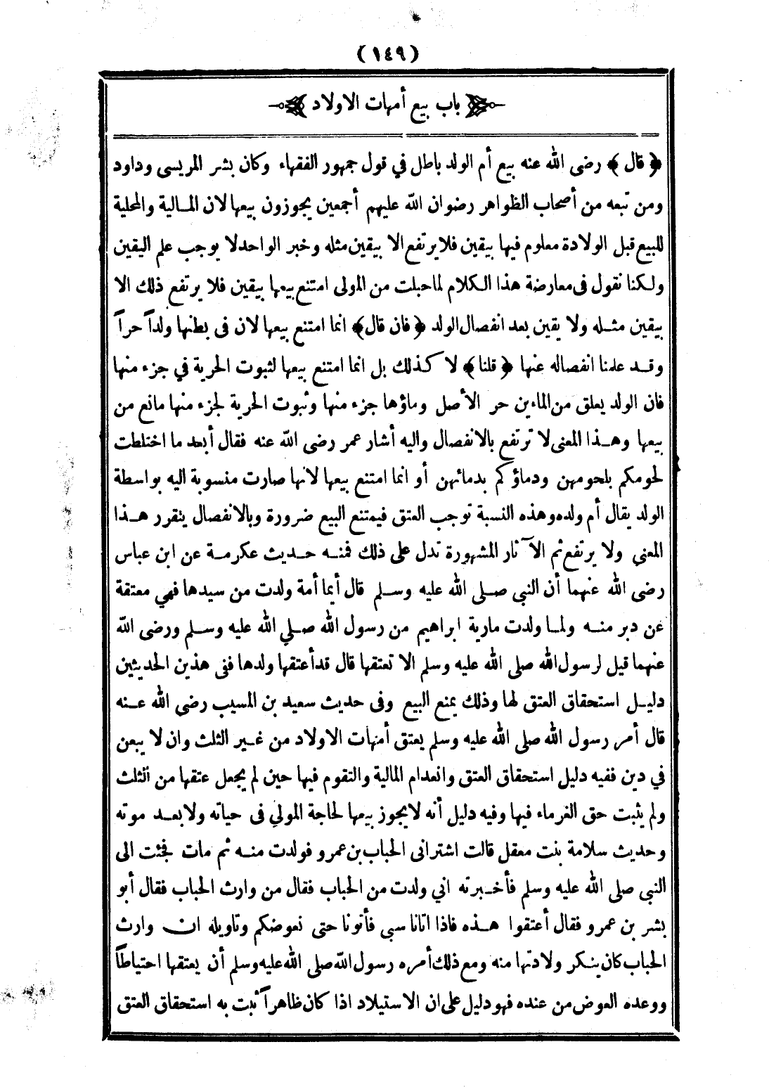(قَالَ) - رَضِيَ اللَّهُ عَنْهُ - بَيْعُ أُمِّ الْوَلَدِ بَاطِلٌ فِي قَوْلِ جُمْهُورِ الْفُقَهَاءِ وَكَانَ بِشْرٌ الْمَرِيسِيُّ وَدَاوُد وَمَنْ تَبِعَهُ مِنْ أَصْحَابِ الظَّوَاهِرِ - رِضْوَانُ اللَّهِ عَلَيْهِمْ أَجْمَعِينَ - يُجَوِّزُونَ بَيْعَهَا؛ لِأَنَّ الْمَالِيَّةَ وَالْمَحَلِّيَّةَ لِلْبَيْعِ قَبْلَ الْوِلَادَةِ مَعْلُومٌ فِيهَا بِيَقِينٍ فَلَا يَرْتَفِعُ إلَّا بِيَقِينٍ مِثْلِهِ وَخَبَرُ الْوَاحِدِ لَا يُوجِبُ عِلْمَ الْيَقِينِ وَلَكِنَّا نَقُولُ فِي مُعَارَضَةِ هَذَا الْكَلَامِ لَمَّا حَبِلَتْ مِنْ الْمَوْلَى امْتَنَعَ بَيْعُهَا بِيَقِينٍ فَلَا يَرْتَفِعُ ذَلِكَ إلَّا بِيَقِينٍ مِثْلِهِ وَلَا يَقِينَ بَعْدَ انْفِصَالِ الْوَلَدِ (فَإِنْ قَالَ) إنَّمَا امْتَنَعَ بَيْعُهَا لِأَنَّ فِي بَطْنِهَا وَلَدًا حُرًّا وَقَدْ عَلِمْنَا انْفِصَالَهُ عَنْهَا (قُلْنَا) لَا كَذَلِكَ بَلْ إنَّمَا امْتَنَعَ بَيْعُهَا لِثُبُوتِ الْحُرِّيَّةِ فِي جُزْءٍ مِنْهَا فَإِنَّ الْوَلَدَ يَعْلَقُ مِنْ الْمَاءَيْنِ حُرَّ الْأَصْلِ وَمَاؤُهَا جُزْءٌ مِنْهَا وَثُبُوتُ الْحُرِّيَّةِ لِجُزْءٍ مِنْهَا مَانِعٌ مِنْ بَيْعِهَا وَهَذَا الْمَعْنَى لَا يَرْتَفِعُ بِالِانْفِصَالِ وَإِلَيْهِ أَشَارَ عُمَرُ - رَضِيَ اللَّهُ عَنْهُ - فَقَالَ: أَبَعْدَ مَا اخْتَلَطَتْ لُحُومُكُمْ بِلُحُومِهِنَّ وَدِمَاؤُكُمْ بِدِمَائِهِنَّ. أَوْ إنَّمَا امْتَنَعَ بَيْعُهَا لِأَنَّهَا صَارَتْ مَنْسُوبَةً إلَيْهِ بِوَاسِطَةِ الْوَلَدِ: يُقَال أُمُّ وَلَدِهِ، وَهَذِهِ النِّسْبَةُ تُوجِبُ الْعِتْقَ فَيَمْتَنِعُ الْبَيْعُ ضَرُورَةً وَبِالِانْفِصَالِ يَتَقَرَّرُ هَذَا الْمَعْنَى وَلَا يَرْتَفِعُ ثُمَّ الْآثَارُ الْمَشْهُورَةُ تَدُلُّ عَلَى ذَلِكَ فَمِنْهُ حَدِيثُ عِكْرِمَةَ عَنْ ابْنِ عَبَّاسٍ - رَضِيَ اللَّهُ عَنْهُمَا - أَنَّ النَّبِيَّ - صَلَّى اللَّهُ عَلَيْهِ وَسَلَّمَ - قَالَ «أَيُّمَا أَمَةٍ وَلَدَتْ مِنْ سَيِّدِهَا فَهِيَ مُعْتَقَةٌ عَنْ دُبُرٍ مِنْهُ» «وَلَمَّا وَلَدَتْ مَارِيَةُ إبْرَاهِيمَ مِنْ رَسُولِ اللَّهِ - صَلَّى اللَّهُ عَلَيْهِ وَسَلَّمَ - وَرَضِيَ عَنْهَا وَقِيلَ لِرَسُولِ اللَّهِ - صَلَّى اللَّهُ عَلَيْهِ وَسَلَّمَ - أَلَا تَعْتِقُهَا قَالَ قَدْ أَعْتَقَهَا وَلَدُهَا» فَفِي هَذَيْنِ الْحَدِيثَيْنِ دَلِيلُ اسْتِحْقَاقِ الْعِتْقِ لَهَا وَذَلِكَ يَمْنَعُ الْبَيْعَ وَفِي حَدِيث سَعِيدِ بْنِ الْمُسَيِّبِ - رَضِيَ اللَّهُ عَنْهُ - قَالَ «أَمَرَ رَسُولُ اللَّهِ - صَلَّى اللَّهُ عَلَيْهِ وَسَلَّمَ - بِعِتْقِ أُمَّهَاتِ الْأَوْلَادِ مِنْ غَيْرِ الثُّلُثِ وَأَنْ لَا يُبَعْنَ فِي دَيْنٍ» فَفِيهِ دَلِيلُ اسْتِحْقَاقِ الْعِتْقِ وَانْعِدَامِ الْمَالِيَّةِ وَالتَّقَوُّمِ فِيهَا حِينَ لَمْ يَجْعَلْ عِتْقَهَا مِنْ الثُّلُثِ وَلَمْ يَثْبُتْ حَقُّ الْغُرَمَاءِ فِيهَا وَفِيهِ دَلِيلٌ أَنَّهُ لَا يَجُوزُ بَيْعُهَا لِحَاجَةِ الْمَوْلَى فِي حَيَاتِهِ وَلَا بَعْدَ مَوْتِهِ وَحَدِيثُ «سَلَامَةَ بِنْتَ مَعْقِلٍ قَالَتْ اشْتَرَانِي الْحُبَابُ بْنُ عَمْرٍو فَوَلَدْت مِنْهُ ثُمَّ مَاتَ فَجِئْتُ إلَى النَّبِيِّ - صَلَّى اللَّهُ عَلَيْهِ وَسَلَّمَ - فَأَخْبَرْتُهُ أَنِّي وَلَدْتُ مِنْ الْحُبَابِ فَقَالَ مَنْ وَارِثُ الْحُبَابِ فَقَالَ أَبُو بِشْرِ بْنِ عَمْرٍو فَقَالَ أَعْتِقُوا هَذِهِ فَإِذَا أَتَانَا سَبْيٌ فَأْتُونَا حَتَّى نُعَوِّضَكُمْ» وَتَأْوِيلُهُ أَنَّ وَارِثَ الْحُبَابِ كَانَ يُنْكِرُ وِلَادَتَهَا مِنْهُ وَمَعَ ذَلِكَ أَمَرَهُ رَسُولُ اللَّهِ - صَلَّى اللَّهُ عَلَيْهِ وَسَلَّمَ - أَنْ يَعْتِقَهَا احْتِيَاطًا وَوَعَدَهُ الْعِوَضَ مِنْ عِنْدِهِ فَهُوَ دَلِيلٌ عَلَى أَنَّ الِاسْتِيلَادَ إذَا كَانَ ظَاهِرًا ثَبَت