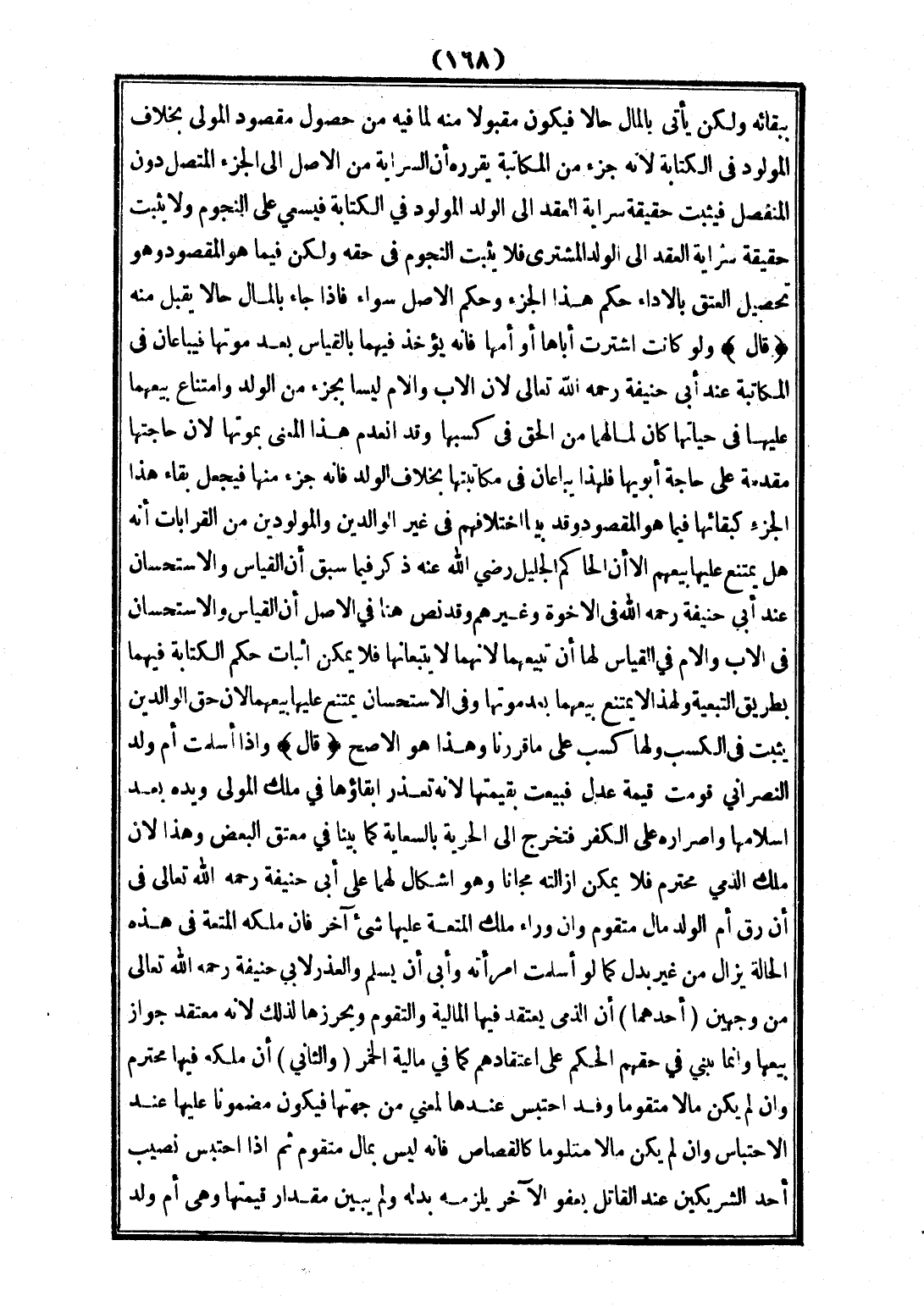 (وَالثَّانِي) أَنَّ مِلْكَهُ فِيهَا مُحْتَرَمٌ وَإِنْ لَمْ يَكُنْ مَالًا مُتَقَوِّمًا وَقَدْ احْتَبَسَ عِنْدَهَا لِمَعْنًى مِنْ جِهَتِهَا فَيَكُونُ مَضْمُونًا عَلَيْهَا عِنْدَ الِاحْتِبَاسِ وَإِنْ لَمْ يَكُنْ مَالًا مُتَقَوِّمًا كَالْقِصَاصِ فَإِنَّهُ لَيْسَ بِمَالٍ مُتَقَوِّمٍ ثُمَّ إذَا احْتَبَسَ نَصِيبُ أَحَدِ الشَّرِيكَيْنِ عِنْدَ الْقَاتِلِ بِعَفْوِ الْآخَرِ يَلْزَمُهُ بَدَلُهُ وَلَمْ يُبَيِّنْ مِقْدَارَ قِيمَتِهَا وَهِيَ أُمُّ وَلَدٍ