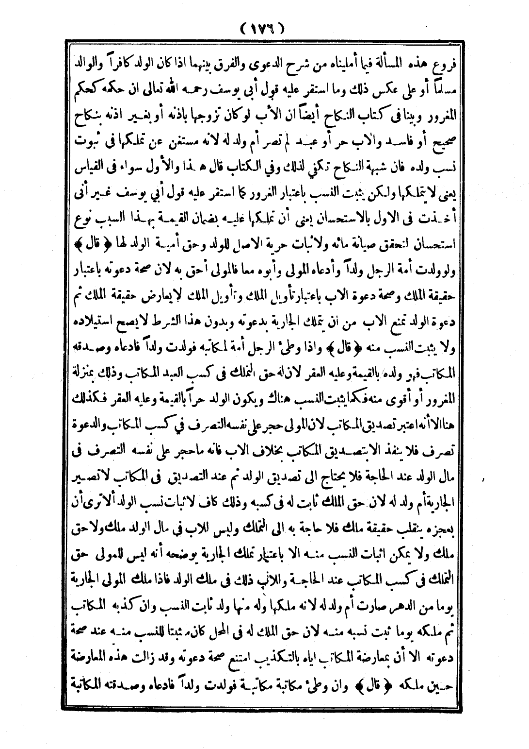 فُرُوعَ هَذِهِ الْمَسْأَلَةِ فِيمَا أَمْلَيْنَاهُ مِنْ شَرْحِ الدَّعْوَى وَالْفَرْقِ بَيْنَهُمَا إذَا كَانَ الْوَلَدُ كَافِرًا وَالْوَالِدُ مُسْلِمًا أَوْ عَلَى عَكْسِ ذَلِكَ وَاسْتَقَرَّ عَلَيْهِ قَوْلُ أَبِي يُوسُفَ - رَحِمَهُ اللَّهُ تَعَالَى - أَنَّ حُكْمَهُ كَحُكْمِ الْمَغْرُورِ وَبَيَّنَّا فِي كِتَابِ النِّكَاحِ أَيْضًا أَنَّ الْأَبَ لَوْ كَانَ تَزَوَّجَهَا بِإِذْنِهِ أَوْ بِغَيْرِ إذْنِهِ بِنِكَاحٍ صَحِيحٍ أَوْ فَاسِدٍ وَالْأَبُ حُرٌّ أَوْ عَبْدٌ لَمْ تَصِرْ أُمَّ وَلَدٍ لَهُ؛ لِأَنَّهُ مُسْتَغْنٍ عَنْ تَمَلُّكِهَا فِي ثُبُوتِ نَسَبِ وَلَدِهِ فَإِنَّ شُبْهَةَ النِّكَاحِ تَكْفِي لِذَلِكَ وَفِي الْكِتَابِ قَالَ هَذَا وَالْأَوَّلُ سَوَاءٌ فِي الْقِيَاسِ يَعْنِي لَا يَتَمَلَّكُهَا وَلَكِنْ يَثْبُتُ النَّسَبُ بِاعْتِبَارِ الْغُرُورِ كَمَا اسْتَقَرَّ عَلَيْهِ قَوْلُ أَبِي يُوسُفَ غَيْرَ أَنِّي أَخَذْت مِنْ الْأَوَّلِ بِالِاسْتِحْسَانِ يَعْنِي أَنَّ تَمَلُّكَهَا عَلَيْهِ بِضَمَانِ الْقِيمَةِ بِهَذَا السَّبَبِ نَوْعُ اسْتِحْسَانٍ لِتَحَقُّقِ صِيَانَةِ مَائِهِ وَلِإِثْبَاتِ حُرِّيَّةِ الْأَصْلِ لِلْوَلَدِ وَحَقِّ أُمِّيَّةِ الْوَلَدِ لَهَا.