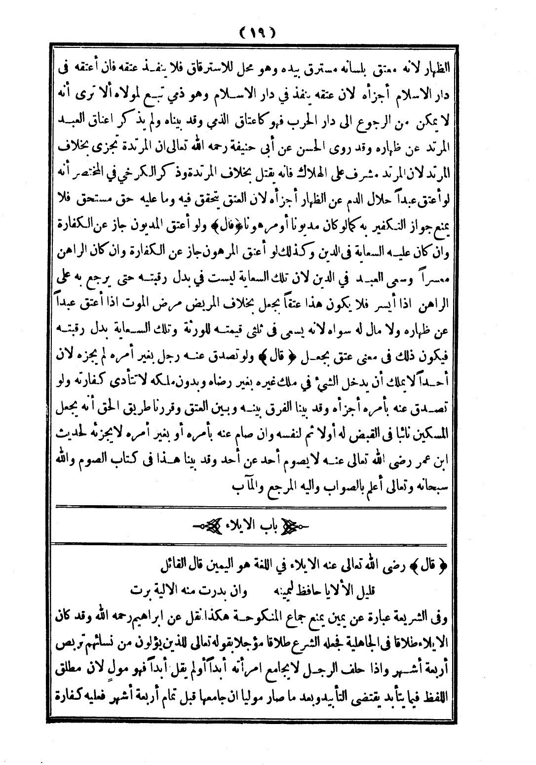 (قَالَ): - رَضِيَ اللَّهُ تَعَالَى عَنْهُ - الْإِيلَاءُ - فِي اللُّغَةِ - هُوَ الْيَمِينُ قَالَ الْقَائِلُ: قَلِيلُ الْأَلَايَا حَافِظٌ لِيَمِينِهِ وَإِنْ بَدَرَتْ مِنْهُ الْأَلِيَّةُ بَرَّتْ، - وَفِي الشَّرِيعَةِ - عِبَارَةٌ عَنْ يَمِينٍ يَمْنَعُ جِمَاعَ الْمَنْكُوحَةِ، هَكَذَا نُقِلَ عَنْ إبْرَاهِيمَ - رَحِمَهُ اللَّهُ تَعَالَى -، وَقَدْ كَانَ الْإِيلَاءُ طَلَاقًا فِي الْجَاهِلِيَّةِ فَجَعَلَهُ الشَّرْعُ طَلَاقًا مُؤَجَّلًا بِقَوْلِهِ تَعَالَى: {لِلَّذِينَ يُؤْلُونَ مِنْ نِسَائِهِمْ تَرَبَّصُ أَرْبَعَةِ أَشْهُرٍ.} [البقرة: 226] وَإِذَا حَلَفَ الرَّجُلُ لَا يُجَامِعُ امْرَأَتَهُ أَبَدًا أَوْ لَمْ يَقُلْ أَبَدًا فَهُوَ مُولٍ؛ لِأَنَّ مُطْلَقَ اللَّفْظِ فِيمَا يَتَأَبَّدُ يَقْتَضِي التَّأْبِيدَ وَبَعْدَمَا صَارَ مُولِيًا إنْ جَامَعَهَا قَبْلَ تَمَامِ أَرْبَعَةِ أَشْهُرٍ فَعَلَيْهِ كَفَّارَةُ