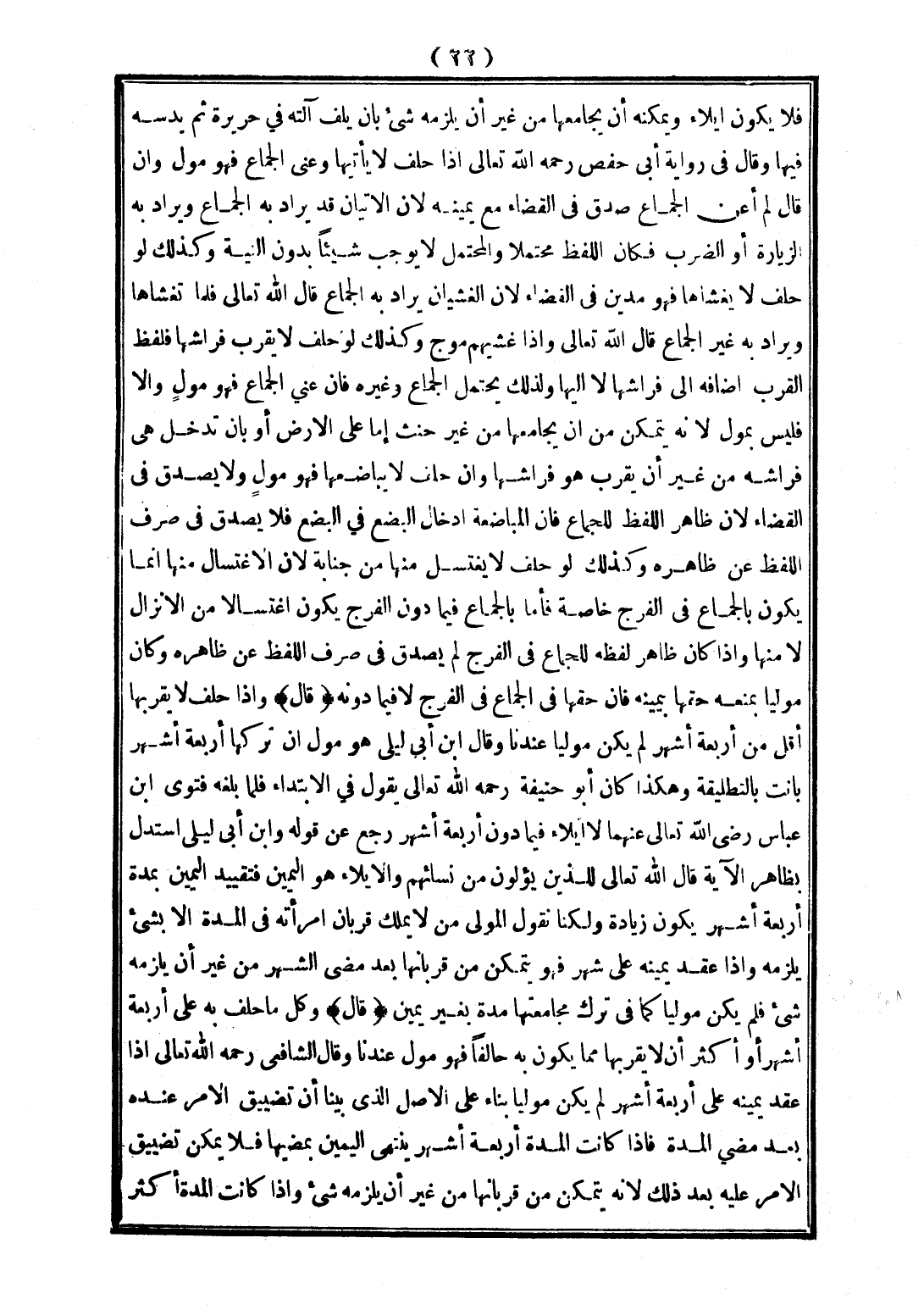 فَلَا يَكُونُ إيلَاءً وَيُمْكِنُهُ أَنْ يُجَامِعَهَا مِنْ غَيْرِ أَنْ يَلْزَمَهُ شَيْءٌ بِأَنْ يَلُفَّ آلَتَهُ فِي حَرِيرَةٍ، ثُمَّ يَدُسَّهُ فِيهَا وَقَالَ فِي رِوَايَةِ أَبِي حَفْصٍ: - رَحِمَهُ اللَّهُ تَعَالَى - إذَا حَلَفَ لَا يَأْتِيهَا وَعَنَى الْجِمَاعَ فَهُوَ مُولٍ، وَإِنْ قَالَ لَمْ أَعْنِ الْجِمَاعَ صُدِّقَ فِي الْقَضَاءِ مَعَ يَمِينِهِ؛ لِأَنَّ الْإِتْيَانَ قَدْ يُرَادُ بِهِ الْجِمَاعُ، وَيُرَادُ بِهِ الزِّيَارَةُ أَوْ الضَّرْبُ فَكَانَ اللَّفْظُ مُحْتَمَلًا، وَالْمُحْتَمَلُ لَا يُوجِبُ شَيْئًا بِدُونِ النِّيَّةِ، وَكَذَلِكَ لَوْ حَلَفَ لَا يَغْشَاهَا فَهُوَ مَدِينٌ فِي الْقَضَاءِ؛ لِأَنَّ الْغِشْيَانَ يُرَادُ بِهِ الْجِمَاعُ قَالَ اللَّهُ تَعَالَى: {فَلَمَّا تَغَشَّاهَا} [الأعراف: 189] وَيُرَادُ بِهِ غَيْرُ الْجِمَاعِ قَالَ اللَّهُ تَعَالَى: {وَإِذَا غَشِيَهُمْ مَوْجٌ.} [لقمان: 32] وَكَذَلِكَ لَوْ حَلَفَ لَا يَقْرَبُ فِرَاشَهَا فَلَفْظُ الْقُرْبِ إضَافَةٌ إلَى فِرَاشِهَا لَا إلَيْهَا، وَلِذَلِكَ يُحْتَمَلُ الْجِمَاعُ وَغَيْرُهُ، فَإِنْ عَنَى الْجِمَاعَ فَهُوَ مُولٍ وَإِلَّا فَلَيْسَ بِمُولٍ؛ لِأَنَّهُ يَتَمَكَّنُ مِنْ أَنْ يُجَامِعَهَا مِنْ غَيْرِ حِنْثٍ إمَّا عَلَى الْأَرْضِ أَوْ بِأَنْ تَدْخُلَ هِيَ فِرَاشَهُ مِنْ غَيْرِ أَنْ يَقْرَبَ هُوَ فِرَاشَهَا، وَإِنْ حَلَفَ لَا يُبَاضِعُهَا فَهُوَ مُولٍ، وَلَا يُصَدَّقُ فِي الْقَضَاءِ؛ لِأَنَّ ظَاهِرَ اللَّفْظِ لِلْجِمَاعِ، فَإِنَّ الْمُبَاضَعَةَ إدْخَالُ الْبُضْعِ فِي الْبُضْعِ فَلَا يُصَدَّقُ فِي صَرْفِ اللَّفْظِ عَنْ ظَاهِرِهِ، وَكَذَلِكَ لَوْ حَلَفَ لَا يَغْتَسِلُ مِنْهَا مِنْ جَنَابَةٍ؛ لِأَنَّ الِاغْتِسَالَ مِنْهَا إنَّمَا يَكُونُ بِالْجِمَاعِ فِي الْفَرْجِ خَاصَّةً فَأَمَّا الْجِمَاعُ فِيمَا دُونَ الْفَرْجِ يَكُونُ اغْتِسَالًا مِنْ الْإِنْزَالِ لَا مِنْهَا، وَإِنْ كَانَ ظَاهِرُ لَفْظِهِ لِلْجِمَاعِ فِي الْفَرْجِ لَمْ يُصَدَّقْ فِي صَرْفِ اللَّفْظِ عَنْ ظَاهِرِهِ وَكَانَ مُولِيًا بِمَنْعِهِ حَقَّهَا بِيَمِينِهِ. فَإِنَّ حَقَّهَا فِي الْجِمَاعِ فِي الْفَرْجِ لَا فِيمَا دُونَهُ.
