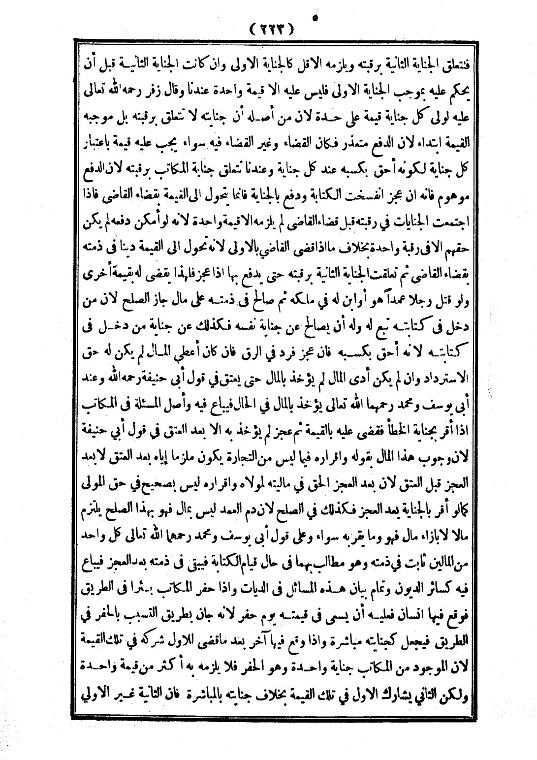 وَإِذَا حَفَرَ الْمُكَاتَبُ بِئْرًا فِي الطَّرِيقِ فَوَقَعَ فِيهَا إنْسَانٌ فَعَلَيْهِ أَنْ يَسْعَى فِي قِيمَتِهِ يَوْمَ حَفَرَ؛ لِأَنَّهُ جَانٍ بِطَرِيقِ التَّسَبُّبِ بِالْحَفْرِ فِي الطَّرِيقِ فَيُجْعَلُ كَجِنَايَتِهِ مُبَاشَرَةً، وَإِذَا وَقَعَ فِيهَا آخَرُ بَعْدَ مَا قَضَى لِلْأَوَّلِ شَرِكَهُ فِي تِلْكَ الْقِيمَةِ؛ لِأَنَّ الْمَوْجُودَ مِنْ الْمُكَاتَبِ جِنَايَةٌ وَاحِدَةٌ وَهُوَ الْحَفْرُ فَلَا يَلْزَمُهُ بِهِ أَكْثَرُ مِنْ قِيمَةٍ وَاحِدَةٍ، وَلَكِنَّ الثَّانِيَ يُشَارِكُ الْأَوَّلَ فِي تِلْكَ الْقِيمَةِ بِخِلَافِ جِنَايَتِهِ بِالْمُبَاشَرَةِ فَإِنَّ الثَّانِيَةَ غَيْرُ الْأُولَى.