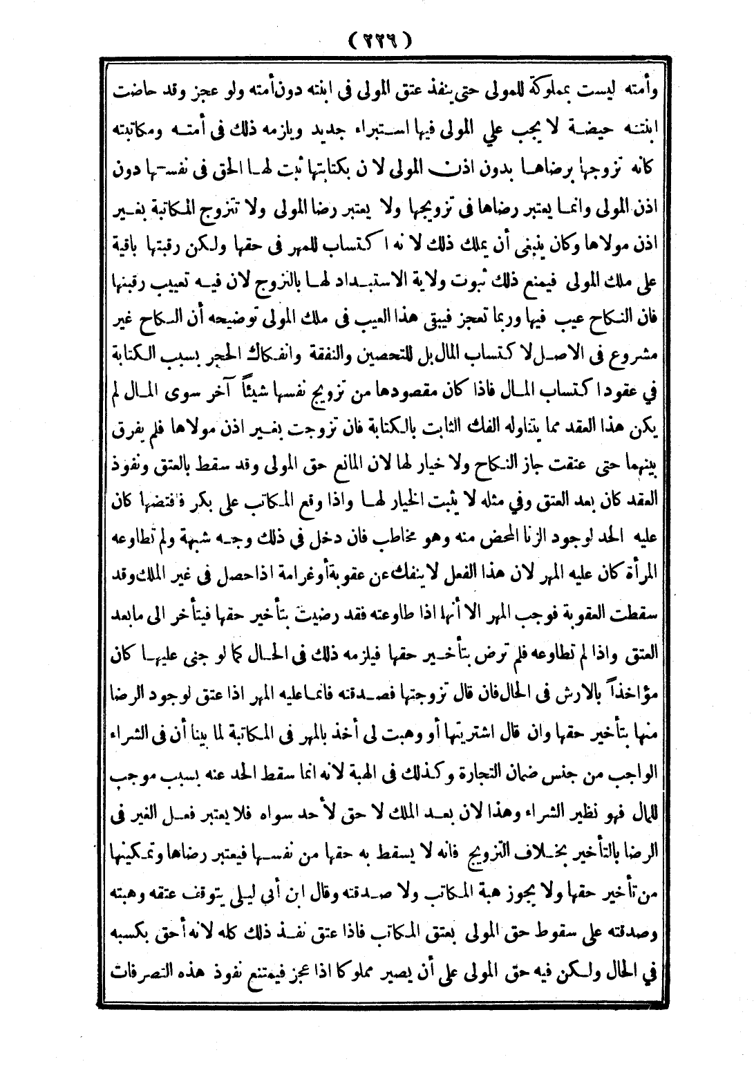 وَأَمَتُهُ لَيْسَتْ بِمَمْلُوكَةٍ لِلْمَوْلَى حَتَّى يَنْفُذَ عِتْقُ الْمَوْلَى فِي ابْنَتِهِ دُونَ أَمَتِهِ وَلَوْ عَجَزَ وَقَدْ حَاضَتْ ابْنَتُهُ حَيْضَةً لَا يَجِبُ عَلَى الْمَوْلَى فِيهَا اسْتِبْرَاءٌ جَدِيدٌ وَيَلْزَمُ ذَلِكَ فِي أَمَتِهِ وَمُكَاتَبَتِهِ كَأَنَّهُ تَزَوَّجَهَا بِرِضَاهَا بِدُونِ إذْنِ الْمَوْلَى؛ لِأَنَّ بِكِتَابَتِهَا ثَبَتَ لَهَا الْحَقُّ فِي نَفْسِهَا دُونَ إذْنِ الْمَوْلَى وَإِنَّمَا يُعْتَبَرُ رِضَاهَا فِي تَزْوِيجِهَا وَلَا يُعْتَبَرُ رِضَا الْمَوْلَى وَلَا تَتَزَوَّجُ الْمُكَاتَبَةُ بِغَيْرِ إذْنِ مَوْلَاهَا وَكَانَ يَنْبَغِي أَنْ يَمْلِكَ ذَلِكَ؛ لِأَنَّهُ اكْتِسَابٌ لِلْمَهْرِ فِي حَقِّهَا، وَلَكِنَّ رَقَبَتَهَا بَاقِيَةٌ عَلَى مِلْكِ الْمَوْلَى فَيَمْنَعُ ذَلِكَ ثُبُوتَ وِلَايَةِ الِاسْتِبْدَادِ لَهَا بِالتَّزَوُّجِ؛ لِأَنَّ فِيهِ تَعْيِيبُ رَقَبَتِهَا فَإِنَّ النِّكَاحَ عَيْبٌ فِيهَا وَرُبَّمَا تَعْجُزُ فَيَبْقَى هَذَا الْعَيْبُ فِي مِلْكِ الْمَوْلَى. تَوْضِيحُهُ أَنَّ النِّكَاحَ غَيْرُ مَشْرُوعٍ فِي الْأَصْلِ لِاكْتِسَابِ الْمَالِ بَلْ لِلتَّحْصِينِ وَالنَّفَقَةِ وَانْفِكَاكِ الْحَجْرِ بِسَبَبِ الْكِتَابَةِ فِي عُقُودِ اكْتِسَابِ الْمَالِ فَإِذَا كَانَ مَقْصُودُهَا مِنْ تَزْوِيجِ نَفْسِهَا شَيْئًا آخَرَ سِوَى الْمَالِ لَمْ يَكُنْ هَذَا الْعَقْدُ مِمَّا يَتَنَاوَلُهُ الْفَكُّ الثَّابِتُ بِالْكِتَابَةِ، فَإِنْ تَزَوَّجَتْ بِغَيْرِ إذْنِ مَوْلَاهَا فَلَمْ يُفَرَّقْ بَيْنَهُمَا حَتَّى عَتَقَتْ جَازَ النِّكَاحُ وَلَا خِيَارَ لَهَا؛ لِأَنَّ الْمَانِعَ حَقُّ الْمَوْلَى وَقَدْ سَقَطَ بِالْعِتْقِ، وَنُفُوذُ الْعَقْدِ كَانَ بَعْدَ الْعِتْقِ وَفِي مِثْلِهِ لَا يَثْبُتُ الْخِيَارُ لَهَا.