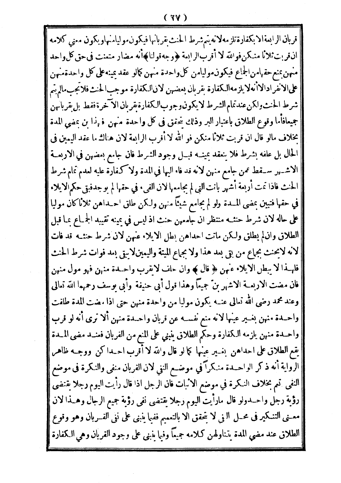 قُرْبَانَ الرَّابِعَةِ إلَّا بِكَفَّارَةٍ تَلْزَمُهُ؛ لِأَنَّهُ يُتِمُّ شَرْطَ الْحِنْثِ بِقُرْبَانِهَا فَيَكُونُ مُولِيًا مِنْهَا وَيَكُونُ مَعْنَى كَلَامِهِ إنْ قَرُبْتُ ثَلَاثًا مِنْكُنَّ، فَوَاَللَّهِ لَا أَقْرَبُ الرَّابِعَةَ.