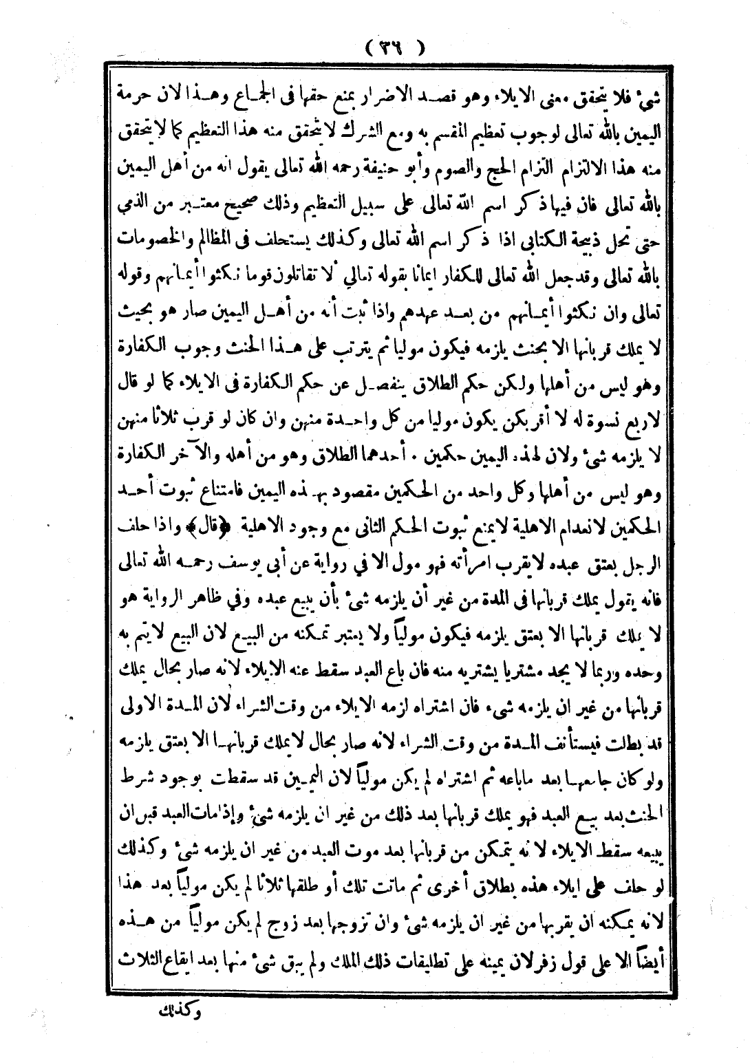 شَيْءٌ فَلَا يَتَحَقَّقُ مَعْنَى الْإِيلَاءِ، وَهُوَ قَصْدُ الْإِضْرَارِ بِمَنْعِ حَقِّهَا فِي الْجِمَاعِ، وَهَذَا؛ لِأَنَّ حُرْمَةَ الْيَمِينِ بِاَللَّهِ تَعَالَى لِوُجُوبِ تَعْظِيمِ الْمُقْسَمِ بِهِ وَمَعَ الشِّرْكِ لَا يَتَحَقَّقُ مِنْهُ هَذَا التَّعْظِيمُ كَمَا لَا يَتَحَقَّقُ مِنْهُ هَذَا الِالْتِزَامُ الْتِزَامُ الْحَجِّ وَالصَّوْمِ وَأَبُو حَنِيفَةَ - رَحِمَهُ اللَّهُ تَعَالَى - يَقُولُ: إنَّهُ مِنْ أَهْلِ الْيَمِينِ بِاَللَّهِ تَعَالَى فَإِنَّ فِيهَا ذِكْرَ اسْمَ اللَّهِ تَعَالَى عَلَى سَبِيلِ التَّعْظِيمِ، وَذَلِكَ صَحِيحٌ مُعْتَبَرٌ مِنْ الذِّمِّيِّ حَتَّى تَحِلَّ ذَبِيحَةُ الْكِتَابِيِّ إذَا ذَكَرَ اسْمَ اللَّهِ تَعَالَى وَكَذَلِكَ يُسْتَحْلَفُ فِي الْمَظَالِمِ وَالْخُصُومَاتِ بِاَللَّهِ تَعَالَى، وَقَدْ جَعَلَ اللَّهُ تَعَالَى لِلْكُفَّارِ أَيْمَانًا بِقَوْلِهِ تَعَالَى: {أَلَا تُقَاتِلُونَ قَوْمًا نَكَثُوا أَيْمَانَهُمْ} [التوبة: 13] وقَوْله تَعَالَى {وَإِنْ نَكَثُوا أَيْمَانَهُمْ مِنْ بَعْدِ عَهْدِهِمْ} [التوبة: 12] وَإِذَا ثَبَتَ أَنَّهُ مِنْ أَهْلِ الْيَمِينِ صَارَ هُوَ بِحَيْثُ لَا يَمْلِكُ قُرْبَانَهَا إلَّا بِحِنْثٍ يَلْزَمُهُ فَيَكُونَ مُولِيًا ثُمَّ يَتَرَتَّبُ عَلَى هَذَا الْحِنْثِ، وُجُوبُ الْكَفَّارَةِ وَهُوَ لَيْسَ مِنْ أَهْلِهَا، وَلَكِنَّ حُكْمَ الطَّلَاقِ يَنْفَصِلُ عَنْ حُكْمِ الْكَفَّارَةِ فِي الْإِيلَاءِ كَمَا لَوْ قَالَ لِأَرْبَعِ نِسْوَةٍ لَهُ: لَا أَقْرَبُكُنَّ يَكُونُ مُولِيًا مِنْ كُلِّ وَاحِدَةٍ مِنْهُنَّ وَإِنْ كَانَ لَوْ قَرُبَ ثَلَاثًا مِنْهُنَّ لَا يَلْزَمُهُ شَيْءٌ؛ وَلِأَنَّ لِهَذِهِ الْيَمِينِ حُكْمَيْنِ. أَحَدُهُمَا الطَّلَاقُ وَهُوَ مِنْ أَهْلِهِ وَالْآخَرُ الْكَفَّارَةُ، وَهُوَ لَيْسَ مِنْ أَهْلِهَا، وَكُلُّ وَاحِدٍ مِنْ الْحُكْمَيْنِ مَقْصُودٌ بِهَذَا الْيَمِينِ فَامْتِنَاعُ ثُبُوتِ أَحَدِ الْحُكْمَيْنِ لِانْعِدَامِ الْأَهْلِيَّةِ لَا يَمْنَعُ ثُبُوتَ الْحُكْمِ الثَّانِي مَعَ وُجُودِ الْأَهْلِيَّةِ.