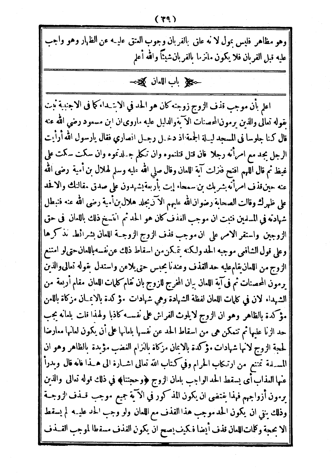 اعْلَمْ بِأَنَّ مُوجِبَ قَذْفِ الزَّوْجِ زَوْجَتَهُ كَانَ هُوَ الْحَدُّ فِي الِابْتِدَاءِ كَمَا فِي الْأَجْنَبِيَّةِ ثَبَتَ بِقَوْلِهِ تَعَالَى: {وَاَلَّذِينَ يَرْمُونَ الْمُحْصَنَاتِ} [النور: 4] الْآيَةَ. وَالدَّلِيلُ عَلَيْهِ مَا رُوِيَ «أَنَّ ابْنَ مَسْعُودٍ - رَضِيَ اللَّهُ عَنْهُ - قَالَ: كُنَّا جُلُوسًا فِي الْمَسْجِدِ لَيْلَةَ الْجُمُعَةِ إذْ دَخَلَ رَجُلٌ أَنْصَارِيٌّ فَقَالَ: يَا رَسُولَ اللَّهِ أَرَأَيْت الرَّجُلَ يَجِدُ مَعَ امْرَأَتِهِ رَجُلًا فَإِنْ قَتَلَ قَتَلْتُمُوهُ، وَإِنْ تَكَلَّمَ جَلَدْتُمُوهُ وَإِنْ سَكَتَ سَكَتَ عَلَى غَيْظٍ، ثُمَّ قَالَ: اللَّهُمَّ افْتَحْ فَنَزَلَتْ آيَةُ اللِّعَانِ.» «وَقَالَ - صَلَّى اللَّهُ عَلَيْهِ وَسَلَّمَ - لِهِلَالِ بْنِ أُمَيَّةَ - رَضِيَ اللَّهُ عَنْهُ - حِين قَذَفَ امْرَأَتَهُ بِشَرِيكِ ابْنِ سَحْمَاء: ائْتِ بِأَرْبَعَةٍ يَشْهَدُونَ عَلَى صِدْقِ مَقَالَتِك وَإِلَّا فَحَدٌّ عَلَى ظَهْرِك»، وَقَالَتْ الصَّحَابَةُ - رِضْوَانُ اللَّهِ عَلَيْهِمْ -: الْآنَ يُجْلَدُ هِلَالُ بْنُ أُمَيَّةَ - رَضِيَ اللَّهُ عَنْهُ - فَتَبْطُلُ شَهَادَتُهُ فِي الْمُسْلِمِينَ فَثَبَتَ أَنَّ مُوجِبَ الْقَذْفِ كَانَ هُوَ الْحَدُّ، ثُمَّ انْتَسَخَ ذَلِكَ بِاللِّعَانِ فِي حَقِّ الزَّوْجَيْنِ وَاسْتَقَرَّ الْأَمْرُ عَلَى أَنَّ مُوجِبَ قَذْفِ الزَّوْجِ الزَّوْجَةَ - اللِّعَانُ بِشَرَائِطَ نَذْكُرُهَا، وَعَلَى قَوْلِ الشَّافِعِيِّ مُوجِبُهُ الْحَدُّ، وَلَكِنَّهُ يَتَمَكَّنُ مِنْ إسْقَاطِ ذَلِكَ عَنْ نَفْسِهِ بِاللِّعَانِ حَتَّى لَوْ امْتَنَعَ الزَّوْجُ مِنْ اللِّعَانِ يُقَامُ عَلَيْهِ حَدُّ الْقَذْفِ وَعِنْدَنَا يُحْبَسُ حَتَّى يُلَاعِنَ وَاسْتَدَلَّ بِقَوْلِهِ تَعَالَى {وَاَلَّذِينَ يَرْمُونَ الْمُحْصَنَاتِ} [النور: 4].