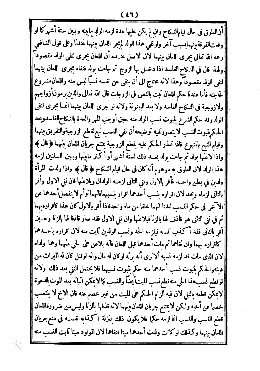 أَنَّ الْعُلُوقَ فِي حَالِ قِيَامِ النِّكَاحِ، وَإِنْ لَمْ يَكُنْ عَلَيْهَا عِدَّةٌ لَزِمَهُ الْوَلَدُ مَا بَيْنَهُ وَبَيْنَ سِتَّةِ أَشْهُرٍ، كَمَا لَوْ وَقَعْت الْفُرْقَةُ بَيْنَهُمَا بِسَبَبٍ آخَرَ، وَلَوْ نَفَى هَذَا الْوَلَدَ لَمْ يَجْرِ اللِّعَانُ بَيْنَهُمَا عِنْدَنَا.