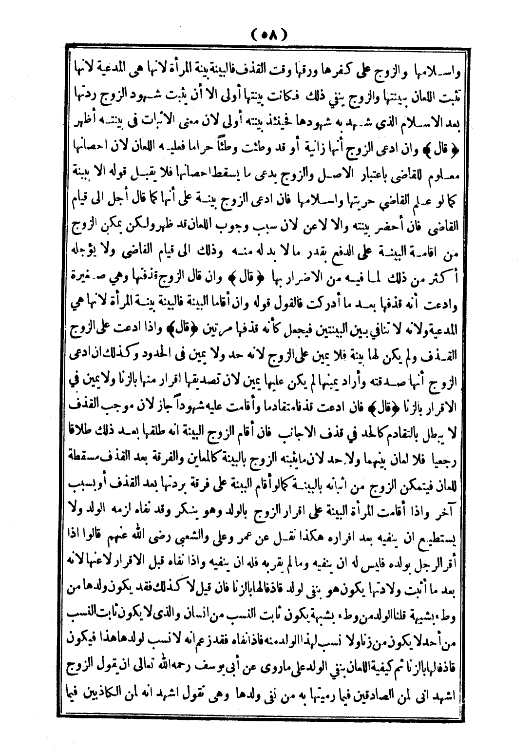 (قَالَ): وَإِذَا ادَّعَتْ عَلَى الزَّوْجِ الْقَذْفَ، وَلَمْ يَكُنْ لَهَا بَيِّنَةٌ فَلَا يَمِينَ عَلَى الزَّوْجِ؛ لِأَنَّهُ حَدٌّ، وَلَا يَمِينَ فِي الْحُدُودِ.