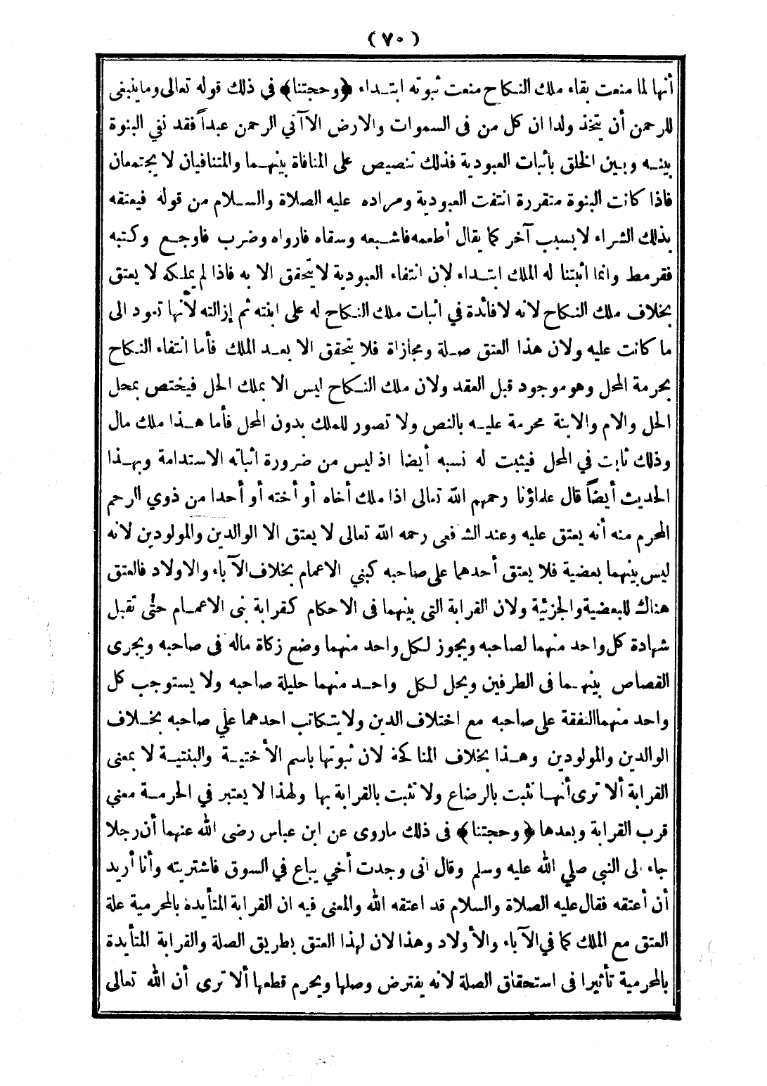 (وَحُجَّتُنَا) فِي ذَلِكَ قَوْله تَعَالَى {وَمَا يَنْبَغِي لِلرَّحْمَنِ أَنْ يَتَّخِذَ وَلَدًا} [مريم: 92] {إِنْ كُلُّ مَنْ فِي السَّمَاوَاتِ وَالأَرْضِ إِلا آتِي الرَّحْمَنِ عَبْدًا} [مريم: 93] فَقَدْ نَفَى الْبُنُوَّةَ بَيْنَهُ، وَبَيْنَ الْخَلْقِ بِإِثْبَاتِ الْعُبُودِيَّةِ فَذَلِكَ تَنْصِيصٌ عَلَى الْمُنَافَاةِ بَيْنَهُمَا، وَالْمُتَنَافِيَانِ لَا يَجْتَمِعَانِ فَإِذَا كَانَتْ الْبُنُوَّةُ مُتَقَرِّرَةً انْتَفَتْ الْعُبُودِيَّةُ، وَمُرَادُهُ - عَلَيْهِ الصَّلَاةُ وَالسَّلَامُ - مِنْ قَوْلِهِ فَيُعْتِقُهُ بِذَلِكَ الشِّرَاءُ لَا بِسَبَبٍ آخَرَ كَمَا يُقَالُ: أَطْعَمَهُ فَأَشْبَعَهُ وَسَقَاهُ فَأَرْوَاهُ، وَضَرَبَ فَأَوْجَعَ، وَكَتَبَهُ فَقَرْمَطَ وَإِنَّمَا أَثْبَتِنَا لَهُ الْمِلْكَ ابْتِدَاءً؛ لِأَنَّ انْتِفَاءَ الْعُبُودِيَّةِ لَا يَتَحَقَّقُ إلَّا بِهِ فَإِذَا لَمْ يَمْلِكْهُ لَا يَعْتِقُ بِخِلَافِ مِلْكِ النِّكَاحِ؛ لِأَنَّهُ لَا فَائِدَةَ فِي إثْبَاتِ مِلْكِ النِّكَاحِ لَهُ عَلَى ابْنَتِهِ ثُمَّ إزَالَتِهِ؛ لِأَنَّهَا تَعُودُ إلَى مَا كَانَتْ عَلَيْهِ، وَلِأَنَّ هَذَا الْعِتْقَ صِلَةٌ، وَمُجَازَاةٌ فَلَا يَتَحَقَّقُ إلَّا بَعْدَ الْمِلْكِ. فَأَمَّا انْتِفَاءُ النِّكَاحِ بِحُرْمَةِ الْمَحَلِّ، وَهُوَ مَوْجُودٌ قَبْلَ الْعَقْدِ؛ وَلِأَنَّ مِلْكَ النِّكَاحِ لَيْسَ بِمِلْكِ الْحِلِّ فَيَخْتَصُّ بِمَحَلِّ الْحِلِّ، وَالْأُمُّ وَالِابْنَةُ مُحَرَّمَةٌ عَلَيْهِ بِالنَّصِّ، وَلَا تَصَوُّرَ لِلْمَلِكِ بِدُونِ الْمَحَلِّ فَأَمَّا هَذَا مِلْكُ مَالٍ، وَذَلِكَ ثَابِتٌ فِي الْمَحَلِّ، فَيَثْبُتُ لَهُ نَسَبُهُ أَيْضًا إذْ لَيْسَ مِنْ ضَرُورَةِ إثْبَاتِهِ - الِاسْتِدَامَةُ، وَبِهَذَا الْحَدِيثِ أَيْضًا قَالَ عُلَمَاؤُنَا - رَحِمَهُمْ اللَّهُ تَعَالَى -: إذَا مَلَكَ أَخَاهُ، أَوْ أُخْتَهُ، أَوْ أَحَدًا مِنْ ذَوِي الرَّحِمِ الْمَحْرَمِ مِنْهُ أَنَّهُ يَعْتِقُ عَلَيْهِ، وَعِنْدَ الشَّافِعِيِّ - رَحِمَهُ اللَّهُ تَعَالَى -: لَا يَعْتِقُ إلَّا الْوَالِدَيْنِ وَالْمَوْلُودَيْنِ؛ لِأَنَّهُ لَيْسَ بَيْنَهُمَا بَعْضِيَّةٌ فَلَا يَعْتِقُ أَحَدُهُمَا عَلَى صَاحِبِهِ كَبَنِي الْأَعْمَامِ بِخِلَافِ الْآبَاءِ وَالْأَوْلَادِ فَالْعِتْقُ هُنَاكَ لِلْبَعْضِيَّةِ، وَالْجُزْئِيَّةِ؛ وَلِأَنَّ الْقَرَابَةَ الَّتِي بَيْنَهُمَا فِي الْأَحْكَامِ كَقَرَابَةِ بَنِي الْأَعْمَامِ حَتَّى تُقْبَلَ شَهَادَةُ كُلِّ وَاحِدٍ مِنْهُمَا لِصَاحِبِهِ، وَيَجُوزُ لِكُلِّ وَاحِدٍ مِنْهُمَا وَضْعُ زَكَاةِ مَالِهِ فِي صَاحِبِهِ، وَيَجْرِي الْقِصَاصُ بَيْنَهُمَا فِي الطَّرَفَيْنِ، وَيَحِلُّ لِكُلِّ وَاحِدٍ مِنْهُمَا حَلِيلَةُ صَاحِبِهِ، وَلَا يَسْتَوْجِبُ كُلُّ وَاحِدٍ مِنْهُمَا النَّفَقَةَ عَلَى صَاحِبِهِ مَعَ اخْتِلَافِ الدِّينِ، وَلَا يَتَكَاتَبُ أَحَدُهُمَا عَلَى صَاحِبِهِ بِخِلَافِ الْوَالِدَيْنِ، وَالْمَوْلُودَيْنِ وَهَذَا بِخِلَافِ الْمُنَاكَحَةِ؛ لِأَنَّ ثُبُوتَهَا بِاسْمِ الْأُخْتِيَّةِ، وَالْبِنْتِيَّةِ لَا بِمَعْنَى الْقَرَابَةِ، أَلَا تَرَى أَنَّهَا تَثْبُتُ بِالرَّضَاعِ، وَلَا تَثْبُتُ بِالْقَرَابَةِ بِهَا، وَلِهَذَا لَا يُعْتَبَرُ فِي الْحُرْمَةِ مَعْنَى قُرْبِ الْقَرَابَةِ وَبُعْدِهَا.
