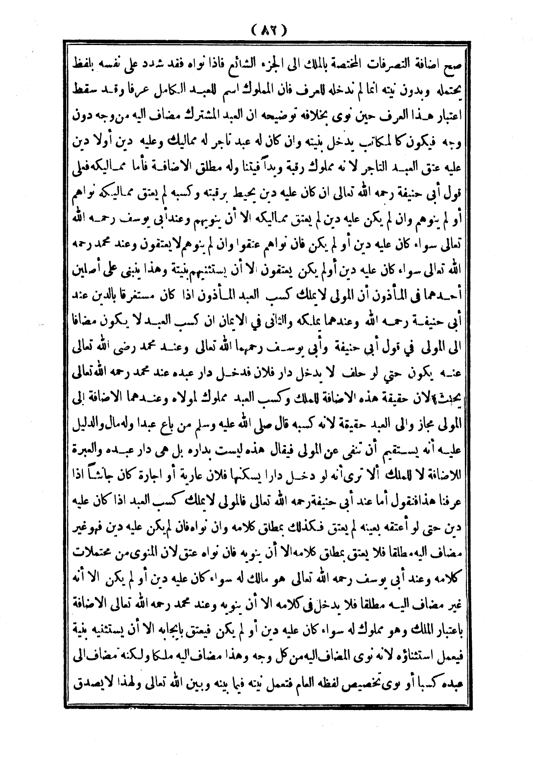 صَحَّ إضَافَةُ التَّصَرُّفَاتِ الْمُخْتَصَّةِ بِالْمِلْكِ إلَى الْجُزْءِ الشَّائِعِ فَإِذَا نَوَاهُ فَقَدْ شَدَّدَ عَلَى نَفْسِهِ بِلَفْظٍ يَحْتَمِلُهُ، وَبِدُونِ نِيَّتِهِ إنَّمَا لَمْ نُدْخِلْهُ لِلْعُرْفِ فَإِنَّ الْمَمْلُوكَ اسْمٌ لِلْعَبْدِ الْكَامِلِ عُرْفًا، وَقَدْ سَقَطَ اعْتِبَارُ هَذَا الْعُرْفِ حِينَ نَوَى بِخِلَافِهِ: تَوْضِيحُهُ أَنَّ الْعَبْدَ الْمُشْتَرَكِ مُضَافٌ إلَيْهِ مِنْ وَجْهٍ دُونَ وَجْهٍ فَيَكُونُ كَالْمُكَاتَبِ يَدْخُلُ بِنِيَّتِهِ.