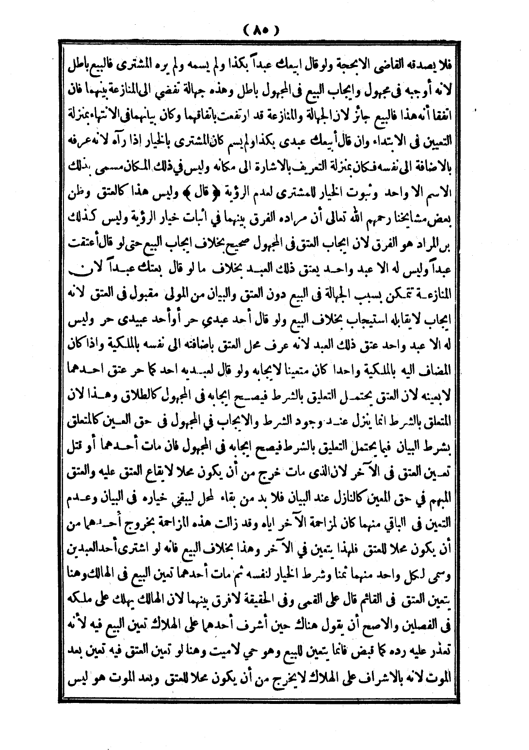 (قَالَ): وَلَيْسَ هَذَا كَالْعِتْقِ وَظَنَّ بَعْضُ مَشَايِخِنَا - رَحِمَهُمْ اللَّهُ تَعَالَى - أَنَّ مُرَادُهُ الْفَرْقَ بَيْنَهُمَا فِي إثْبَاتِ خِيَارِ الرُّؤْيَةِ، وَلَيْسَ كَذَلِكَ بَلْ الْمُرَادُ هُوَ الْفَرْقُ؛ لِأَنَّ إيجَابَ الْعِتْقِ فِي الْمَجْهُولِ صَحِيحٌ بِخِلَافِ إيجَابِ الْبَيْعِ حَتَّى لَوْ قَالَ أَعْتَقْت عَبْدًا، وَلَيْسَ لَهُ إلَّا عَبْدٌ وَاحِدٌ يَعْتِقُ ذَلِكَ الْعَبْدُ بِخِلَافِ مَا لَوْ قَالَ: بِعْتُك عَبْدًا؛ لِأَنَّ الْمُنَازَعَةَ تَتَمَكَّنُ بِسَبَبِ الْجَهَالَةِ فِي الْبَيْعِ دُونَ الْعِتْقِ، وَالْبَيَانُ مِنْ الْمَوْلَى مَقْبُولٌ فِي الْعِتْقِ؛ لِأَنَّهُ إيجَابٌ لَا يُقَابِلُهُ اسْتِيجَابٌ بِخِلَافِ الْبَيْعِ، وَلَوْ قَالَ: أَحَدُ عَبْدَيَّ حُرٌّ، أَوْ أَحَدُ عَبِيدِي حُرٌّ، وَلَيْسَ لَهُ إلَّا عَبْدٌ، وَاحِدٌ عَتَقَ ذَلِكَ الْعَبْدُ؛ لِأَنَّهُ عَرَفَ مَحَلَّ الْعِتْقِ بِإِضَافَتِهِ إلَى نَفْسِهِ بِالْمِلْكِيَّةِ، وَإِذَا كَانَ الْمُضَافُ إلَيْهِ بِالْمِلْكِيَّةِ وَاحِدًا كَانَ مُتَعَيَّنًا لِإِيجَابِهِ، وَلَوْ قَالَ لِعَبْدَيْهِ: أَحَدُ كَمَا حُرٌّ عَتَقَ أَحَدُهُمَا لَا بِعَيْنِهِ؛ لِأَنَّ الْعِتْقَ يَحْتَمِلُ التَّعْلِيقَ بِالشَّرْطِ فَيَصِحُّ إيجَابُهُ فِي الْمَجْهُولِ كَالطَّلَاقِ، وَهَذَا؛ لِأَنَّ الْمُتَعَلِّقَ بِالشَّرْطِ إنَّمَا يَنْزِلُ عِنْدَ وُجُودِ الشَّرْطِ، وَالْإِيجَابُ فِي الْمَجْهُولِ فِي حَقِّ الْعَيْنِ كَالْمُتَعَلِّقِ بِشَرْطِ الْبَيَانِ فِيمَا لَا يَحْتَمِلُ التَّعْلِيقَ بِالشَّرْطِ فَيَصِحُّ إيجَابُهُ فِي الْمَجْهُولِ، فَإِنْ مَاتَ أَحَدُهُمَا، أَوْ قُتِلَ تَعَيَّنَ الْعِتْقُ فِي الْآخَرِ؛ لِأَنَّ الَّذِي مَاتَ خَرَجَ مِنْ أَنْ يَكُونَ مَحَلًّا لِإِيقَاعِ الْعِتْقِ عَلَيْهِ، وَالْعِتْقُ الْمُبْهَمُ فِي حَقِّ الْمُعَيَّنِ كَالنَّازِلِ عِنْدَ الْبَيَانِ فَلَا بُدَّ مِنْ بَقَاءٍ لِمَحَلٍّ؛ لِيَبْقَى خِيَارُهُ فِي الْبَيَانِ، وَعَدَمُ التَّعَيُّنِ فِي الْبَاقِي مِنْهُمَا كَانَ لِمُزَاحَمَةِ الْآخَرِ إيَّاهُ وَقَدْ زَالَتْ هَذِهِ الْمُزَاحَمَةُ بِخُرُوجِ أَحَدِهِمَا مِنْ أَنْ يَكُونَ مَحَلًّا لِلْعِتْقِ فَلِهَذَا يَتَعَيَّنُ فِي الْآخَرِ.