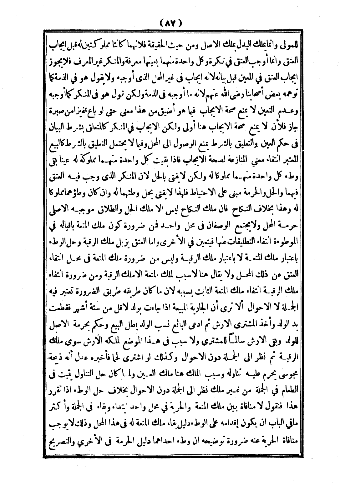 وَالطَّلَاقُ مُوجِبُهُ الْأَصْلِيُّ حُرْمَةُ الْمَحَلِّ، وَلَا يَجْتَمِعُ الْوَصْفَانِ فِي مَحَلٍّ وَاحِدٍ فَمِنْ ضَرُورَةِ كَوْنِ مِلْكِ الْمُتْعَةِ بَاقِيًا لَهُ فِي الْمَوْطُوءَةِ انْتِفَاءُ التَّطْلِيقَاتِ عَنْهَا فَيَتَعَيَّنُ فِي الْأُخْرَى، وَأَمَّا الْعِتْقُ يُزِيلُ مِلْكَ الرَّقَبَةِ، وَحِلُّ الْوَطْءِ بِاعْتِبَارِ مِلْكِ الْمُتْعَةِ لَا بِاعْتِبَارِ مِلْكِ الرَّقَبَةِ، وَلَيْسَ مِنْ ضَرُورَةِ مِلْكِ الْمُتْعَةِ فِي مَحَلِّ انْتِفَاءِ الْعِتْقِ عَنْ ذَلِكَ الْمَحَلِّ، وَلَا يُقَالُ: هُنَا لَا سَبَبَ لِمِلْكِ الْمُتْعَةِ إلَّا مِلْكُ الرَّقَبَةِ، وَمِنْ ضَرُورَةِ انْتِفَاءِ مِلْكِ الرَّقَبَةِ انْتِفَاءُ مِلْكِ الْمُتْعَةِ الثَّابِتِ بِسَبَبِهِ؛ لِأَنَّ مَا كَانَ طَرِيقُهُ طَرِيقَ الضَّرُورَةِ تُعْتَبَرُ فِيهِ الْجُمْلَةُ، لَا الْأَحْوَالُ، أَلَا تَرَى أَنَّ الْجَارِيَةَ الْمَبِيعَةَ إذَا جَاءَتْ بِوَلَدٍ لِأَقَلَّ مِنْ سِتَّةِ أَشْهُرٍ فَقُطِعَتْ يَدُ الْوَلَدِ وَأَخَذَ الْمُشْتَرِي الْأَرْشَ ثُمَّ ادَّعَى الْبَائِعُ نَسَبَ الْوَلَدِ بَطَلَ الْبَيْعُ، وَحُكِمَ بِحُرْمَةِ الْأَصْلِ لِلْوَلَدِ، وَبَقِيَ الْأَرْشُ سَالِمًا لِلْمُشْتَرِي، وَلَا سَبَبَ فِي هَذَا الْمَوْضِعِ لِمِلْكِهِ الْأَرْشَ سِوَى مِلْكِ الرَّقَبَةِ ثُمَّ نُظِرَ إلَى الْجُمْلَةِ دُونَ الْأَحْوَالِ.